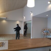 見学会初日が行われています。本日は最高気温が10℃程の気候。前日から稼働させているエアコン1台によって室内は暖か。午前中に陽射しが入り、上着を着ていると少し暑いくらいです。南側のリビングのエアコンを切り、北側寝室に取付けたエアコンに切り替えました。