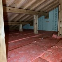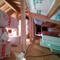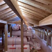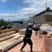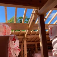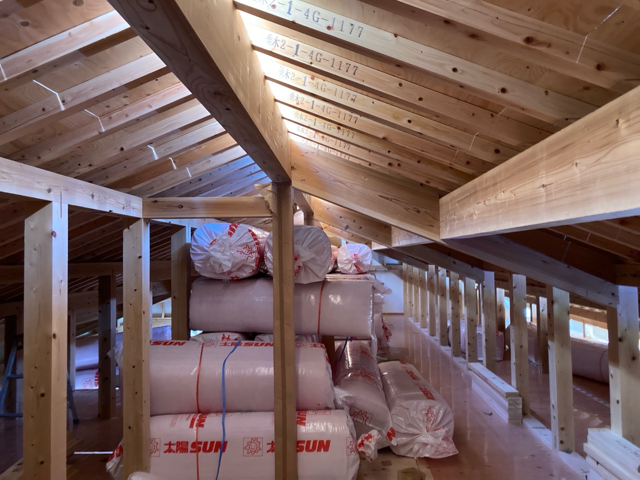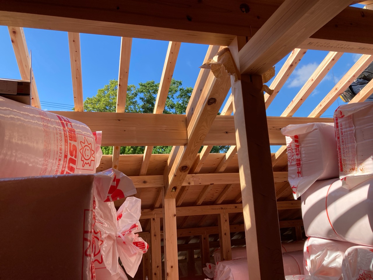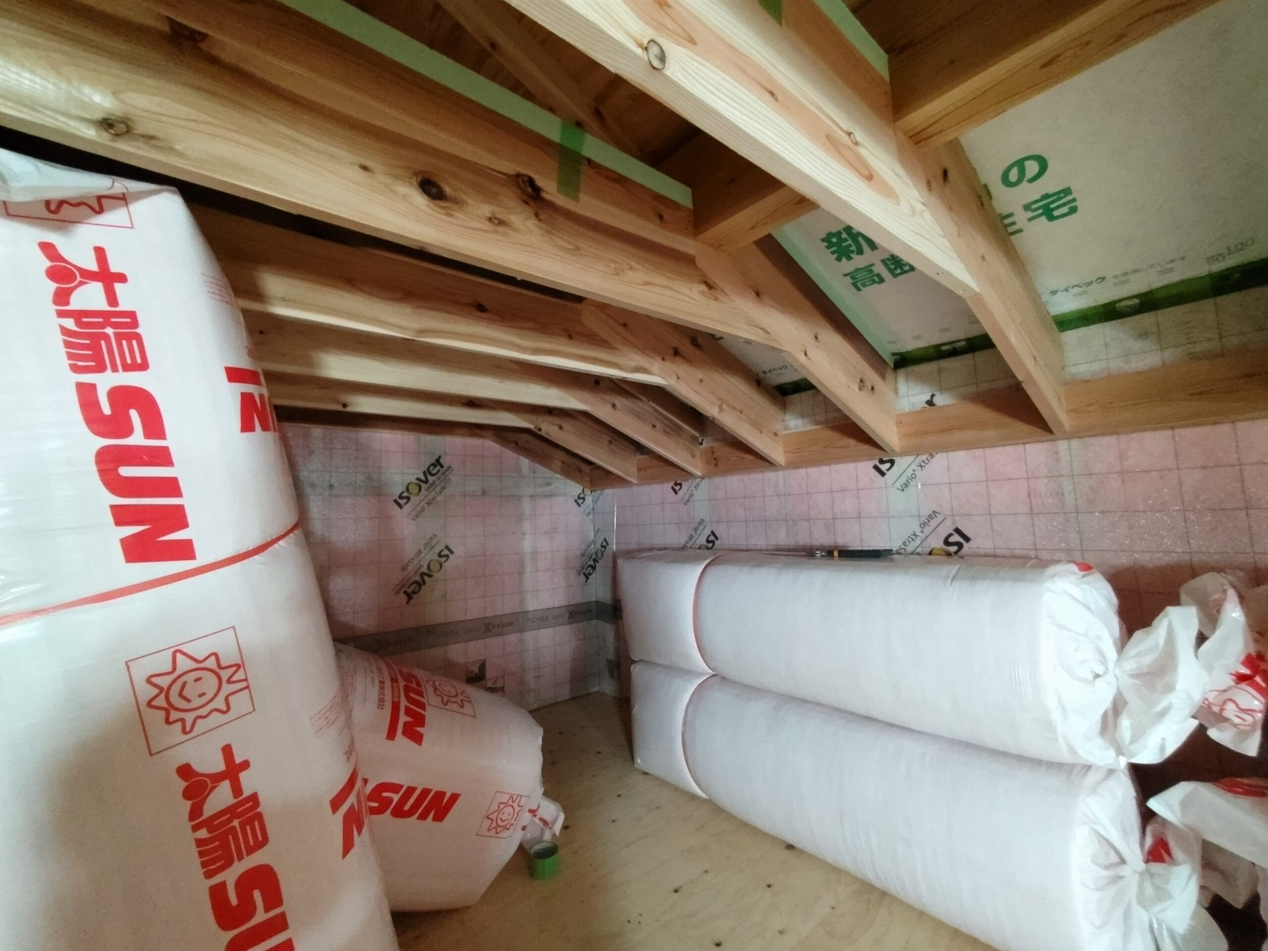 台風の影響で強い日差しは無いものの小屋裏はまさに灼熱の空間。棟梁は小屋裏の断熱作業に入りましたが、『日が照っていないからまだ楽だ。』と常人から見たら恐ろしいほどのタフネスぶり。