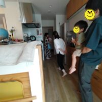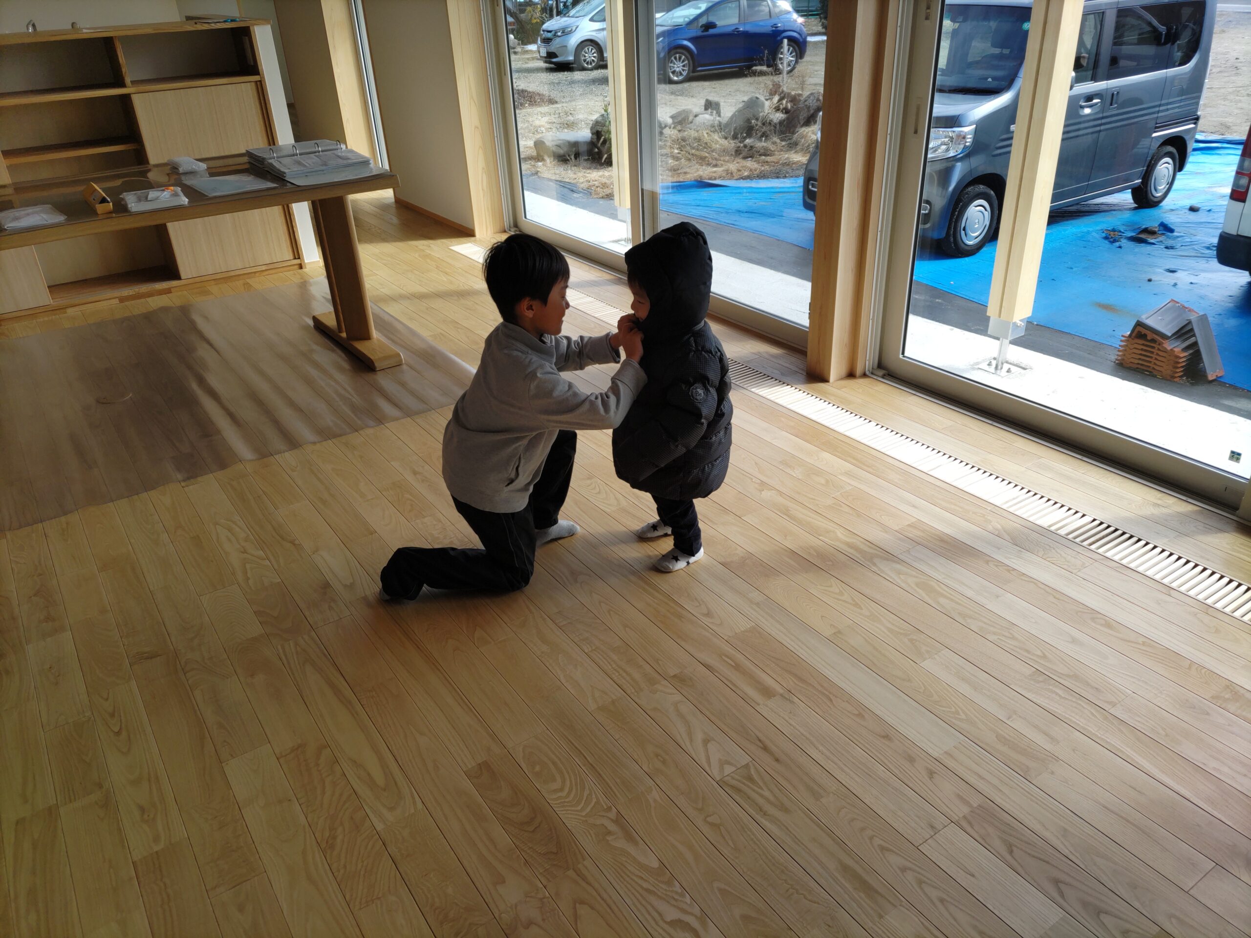 完成した住宅にやってきた兄弟。外は大寒波によってかなりの寒さで完全防備のまま入ってきたのですが、屋内は暖かいので弟souちゃんのダウンを脱がしてあげる兄haruちゃんです。