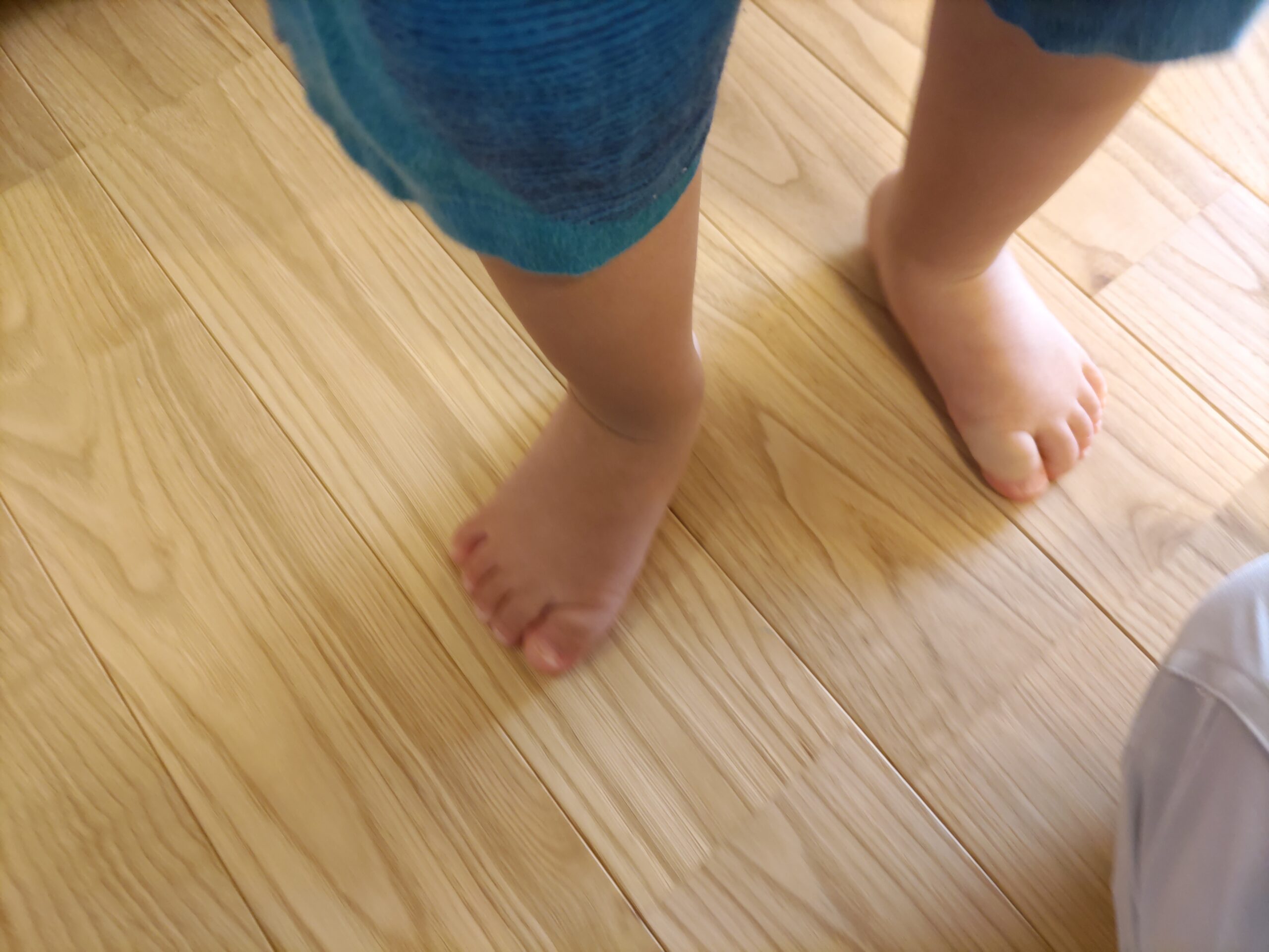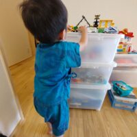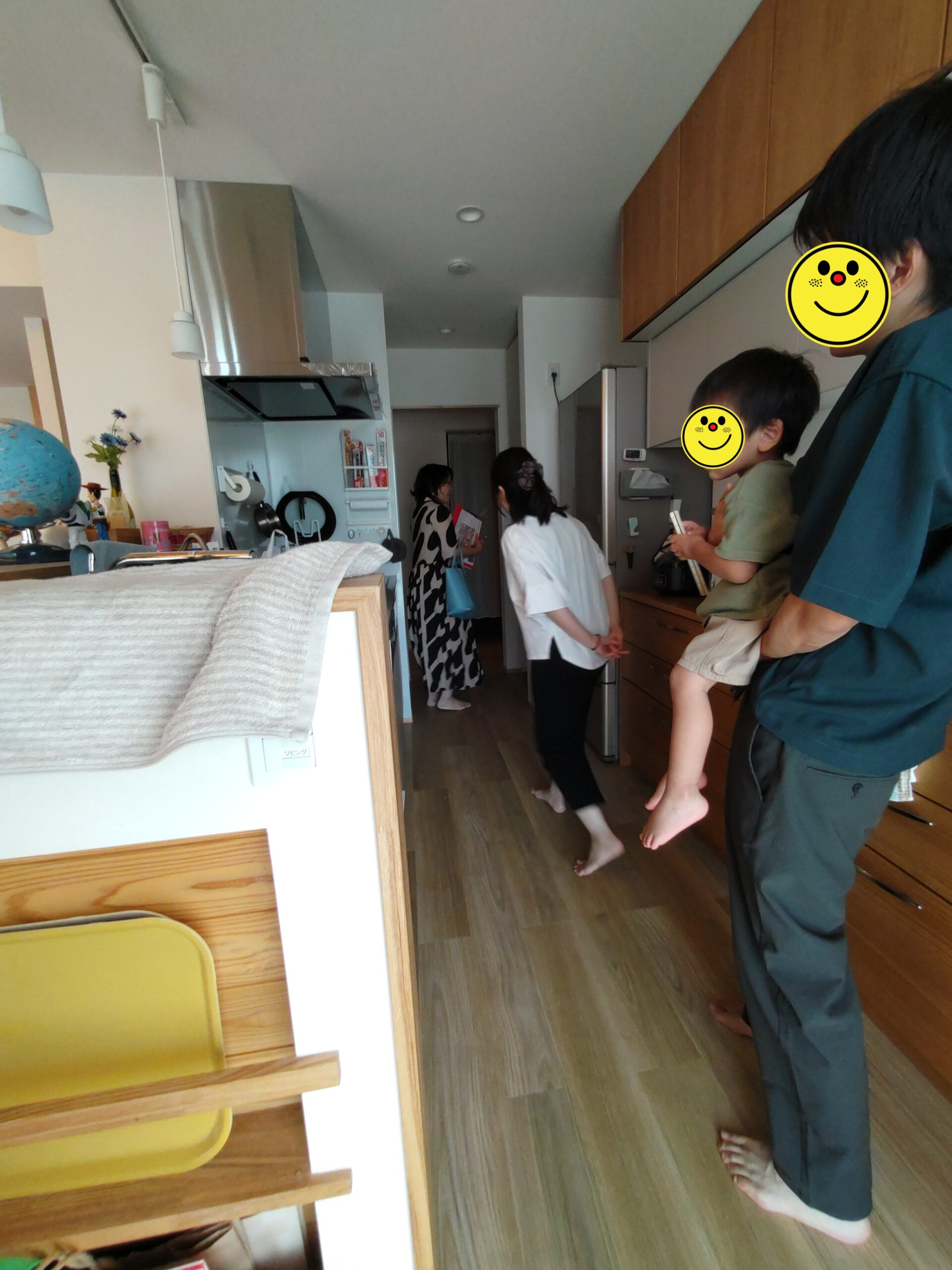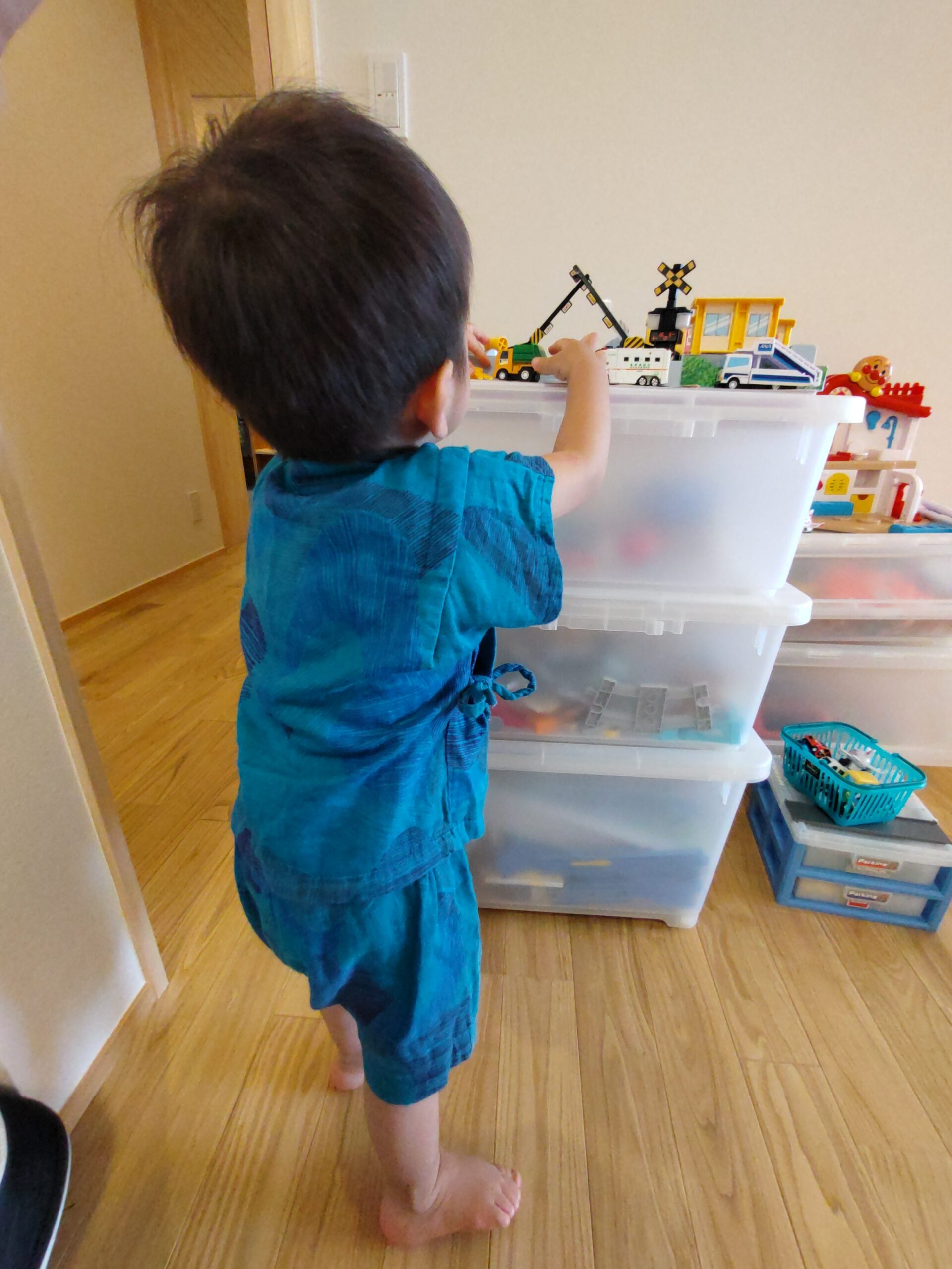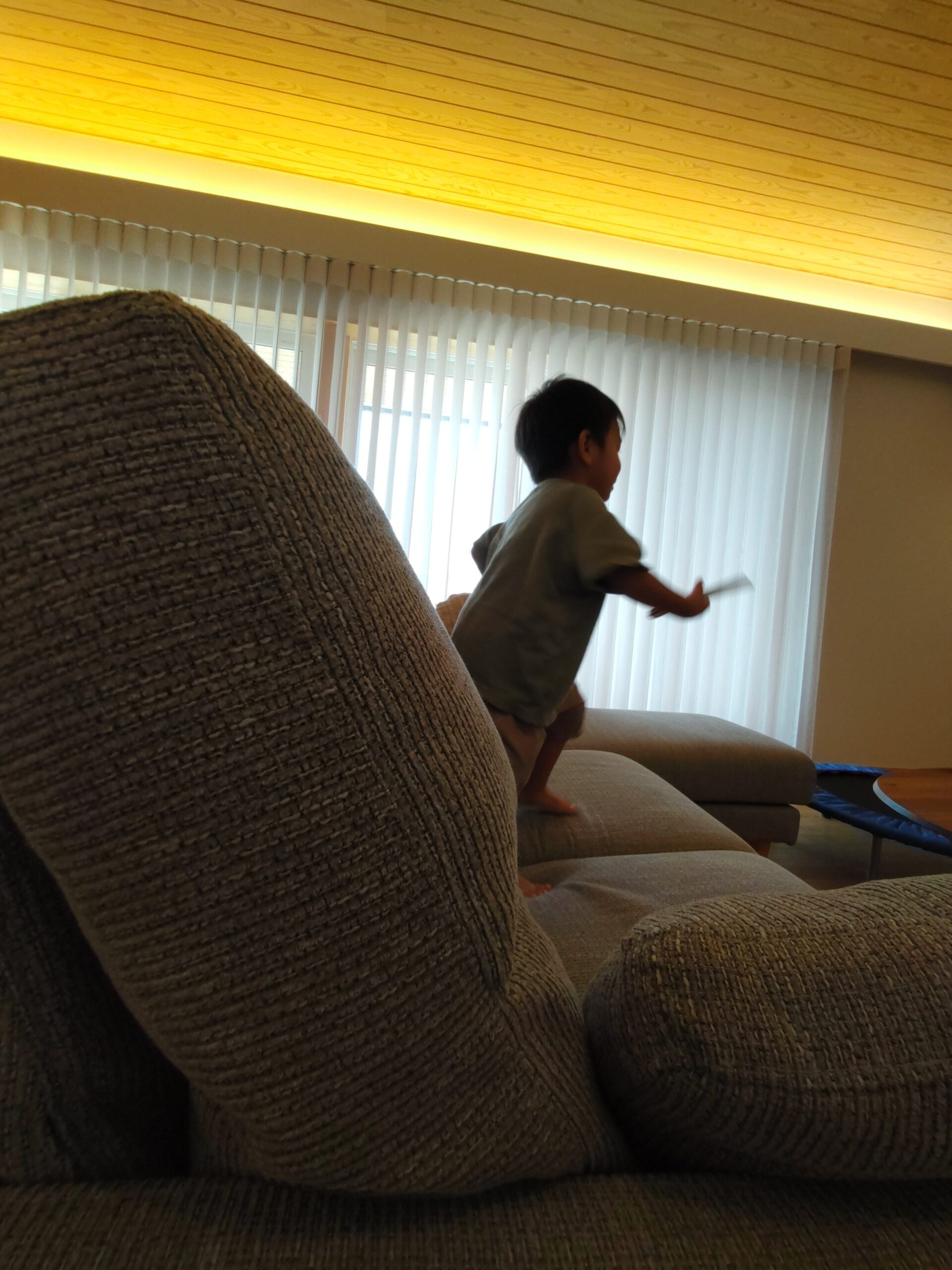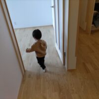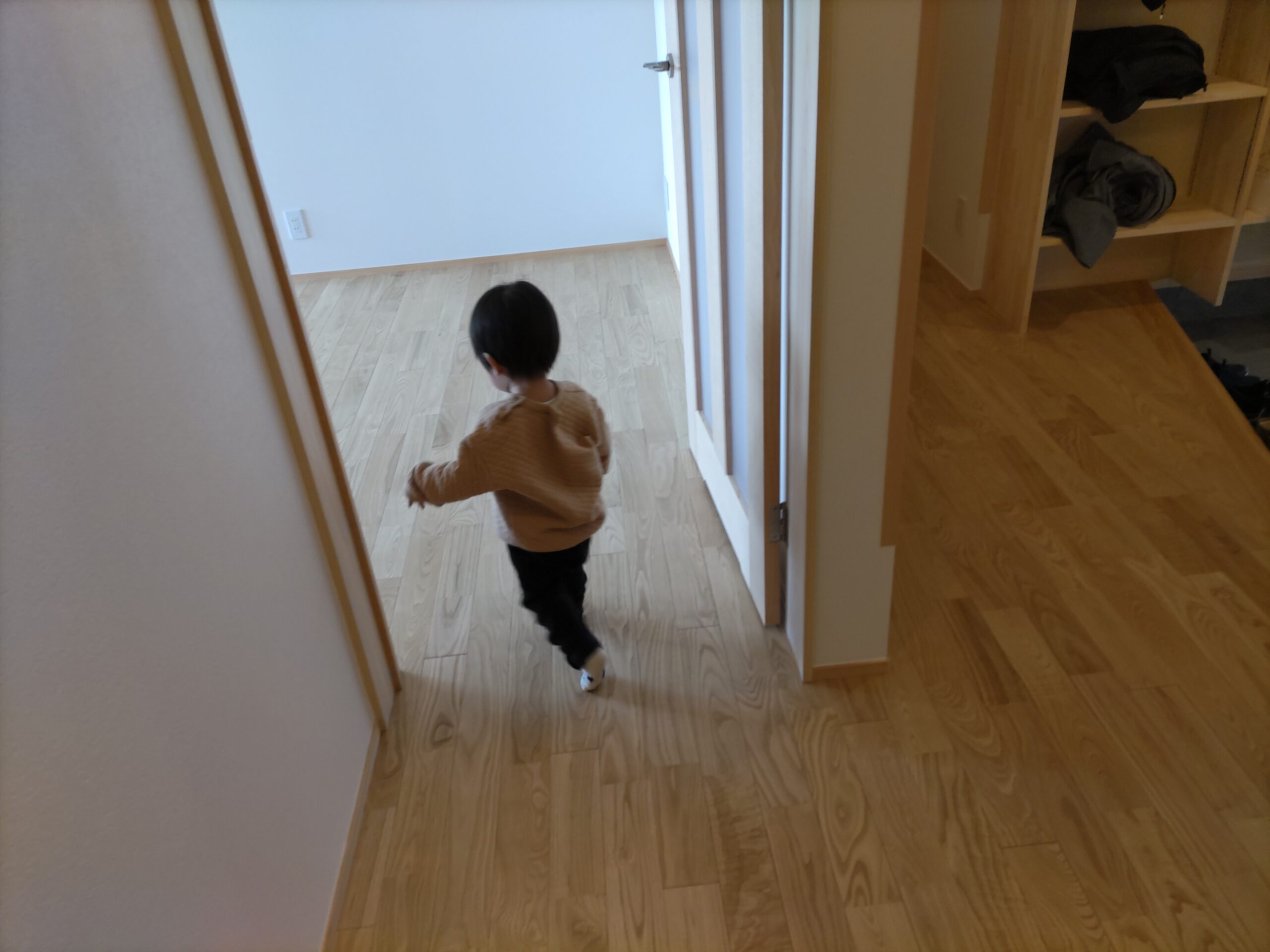 本日も元気に遊びまわる次男SOUちゃん。大量のおもちゃのある部屋も含め床材は硬めの栗のフロアを使用していますのでf様によればおもちゃを落としたりしてもあまり気にならないとの事です。