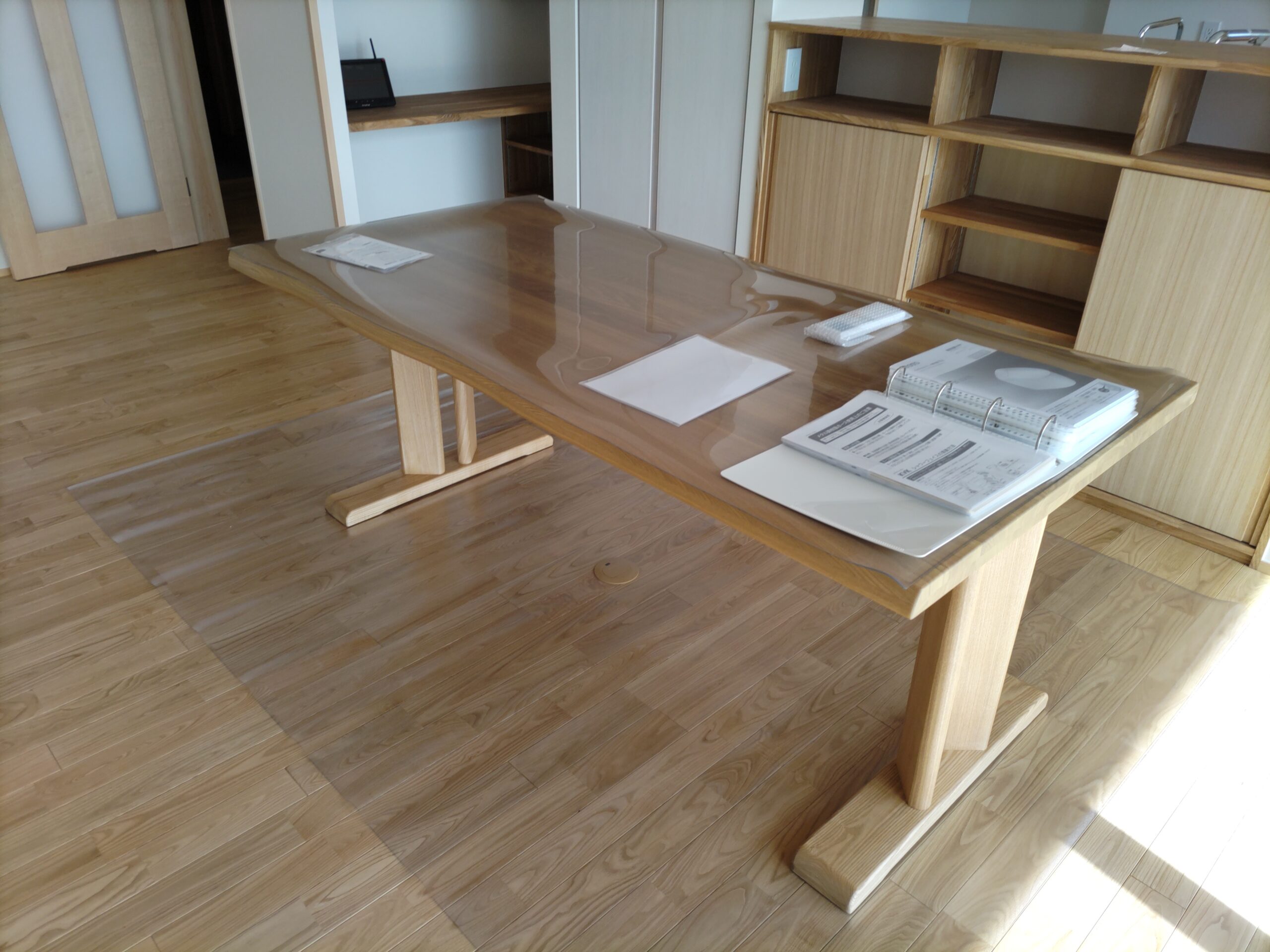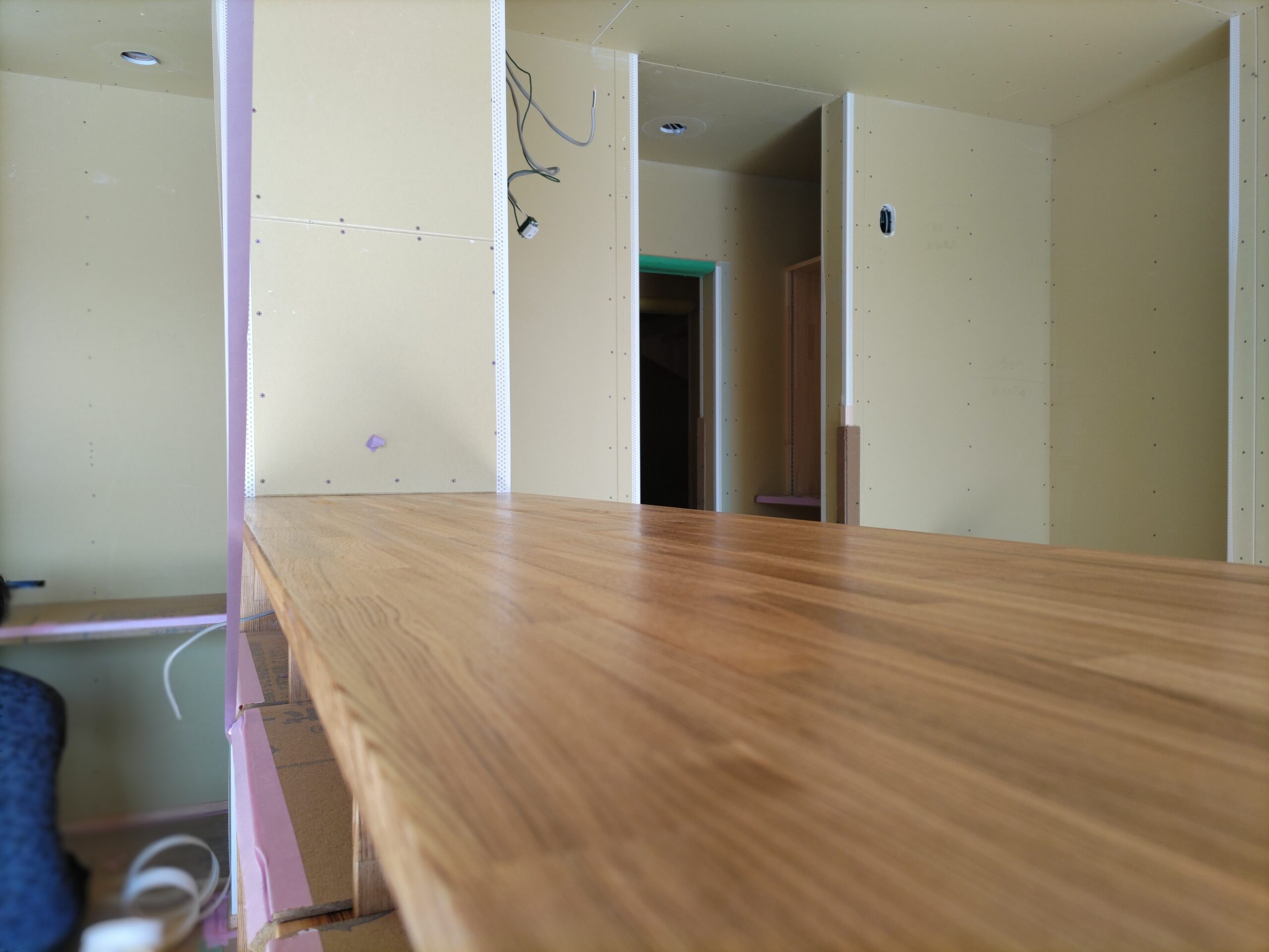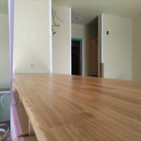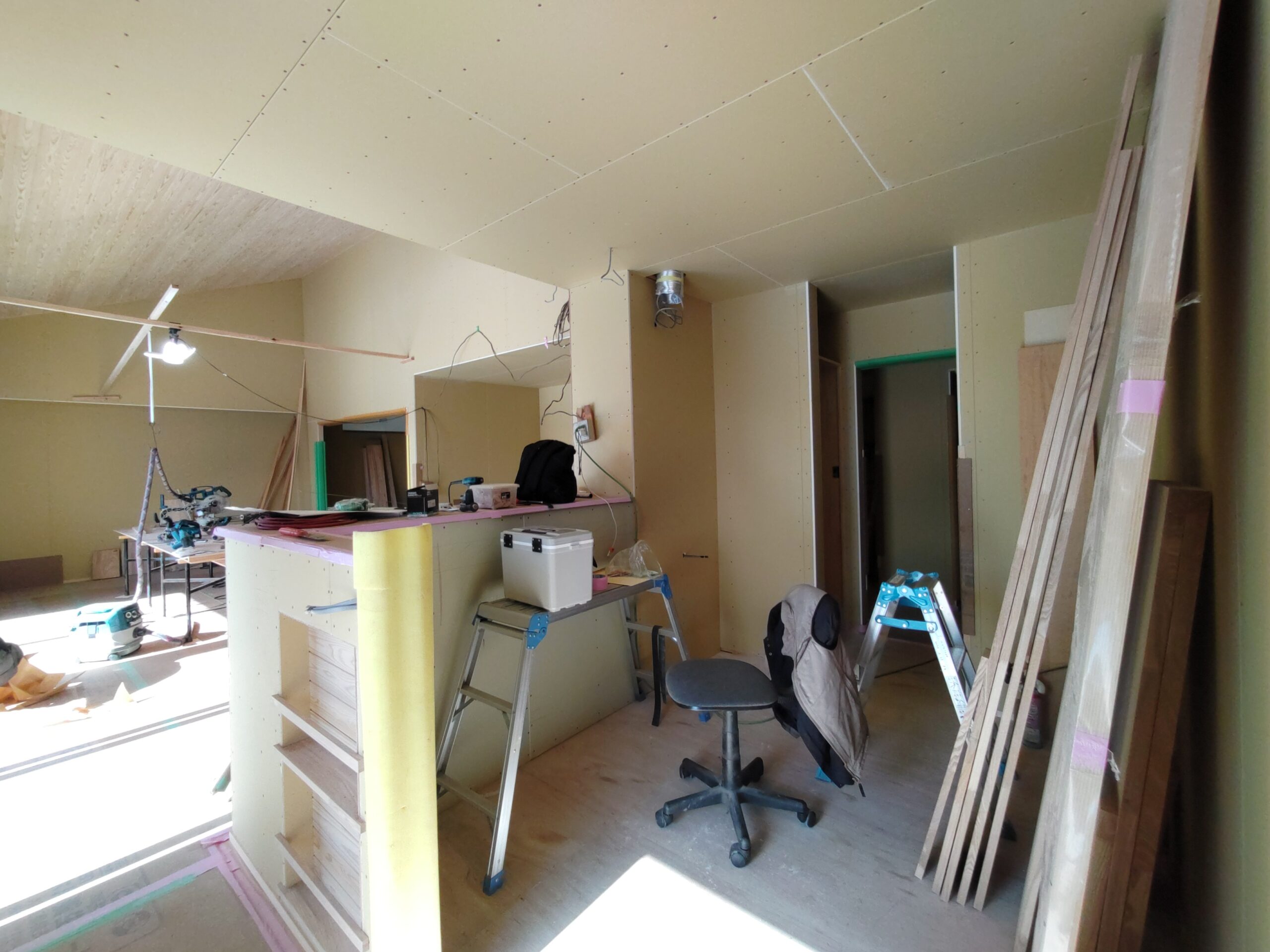 棟梁の造作工事も終わり、道具が完全に引き上げられました。このリビングダイニングこんなに広かったんだ、という感覚に陥ります。本日からクロス業者さんが下地処理に入っていますが、前日にカウンターや造作材の塗装が行われ、クリア色の塗装を施しています。透明の塗料を塗ったはずですが、無塗装の時と比べて深みのある色になっています。