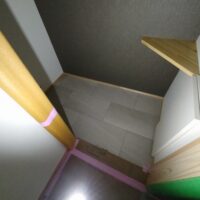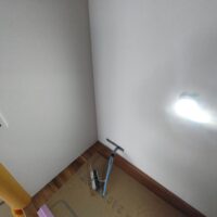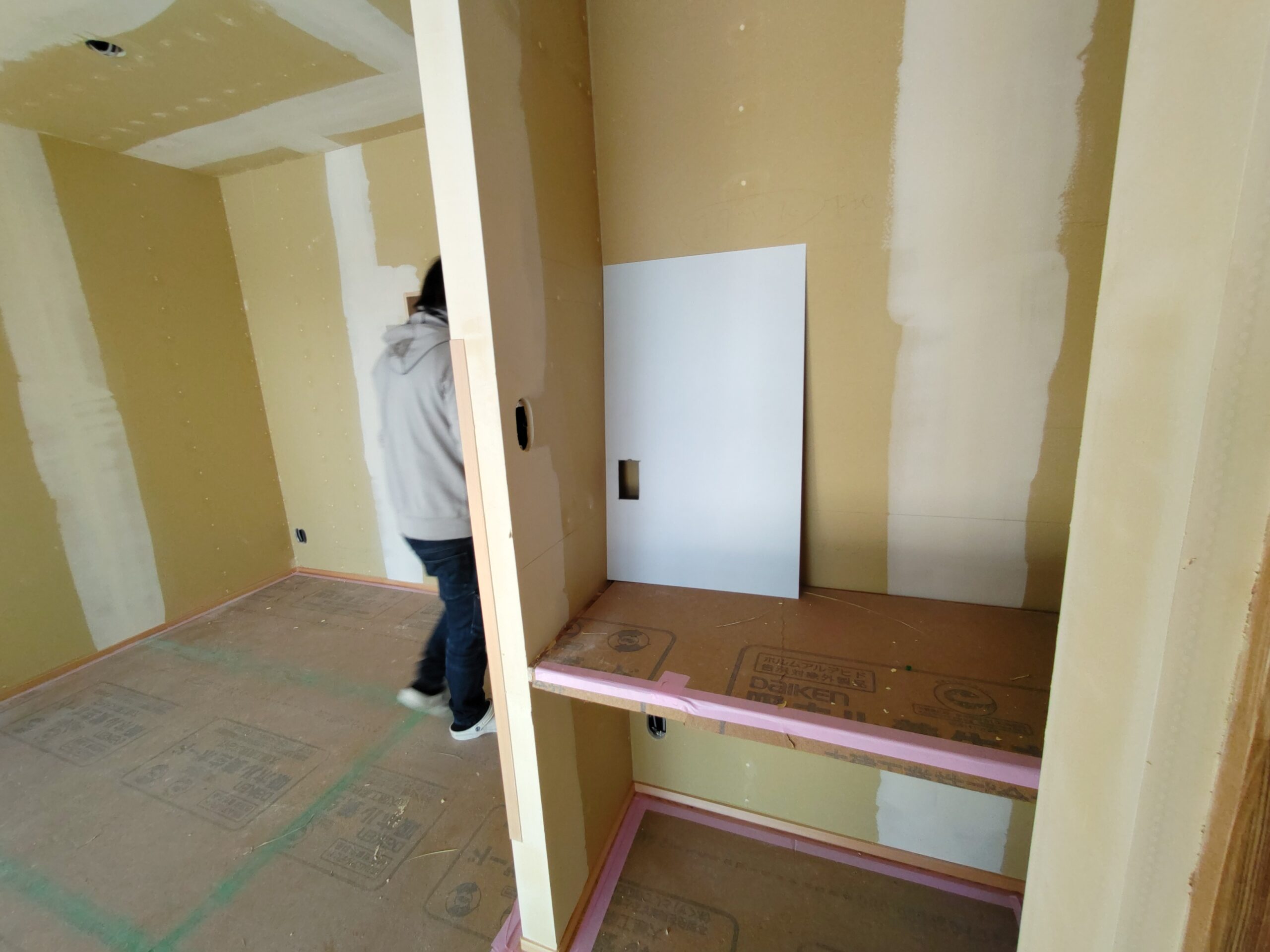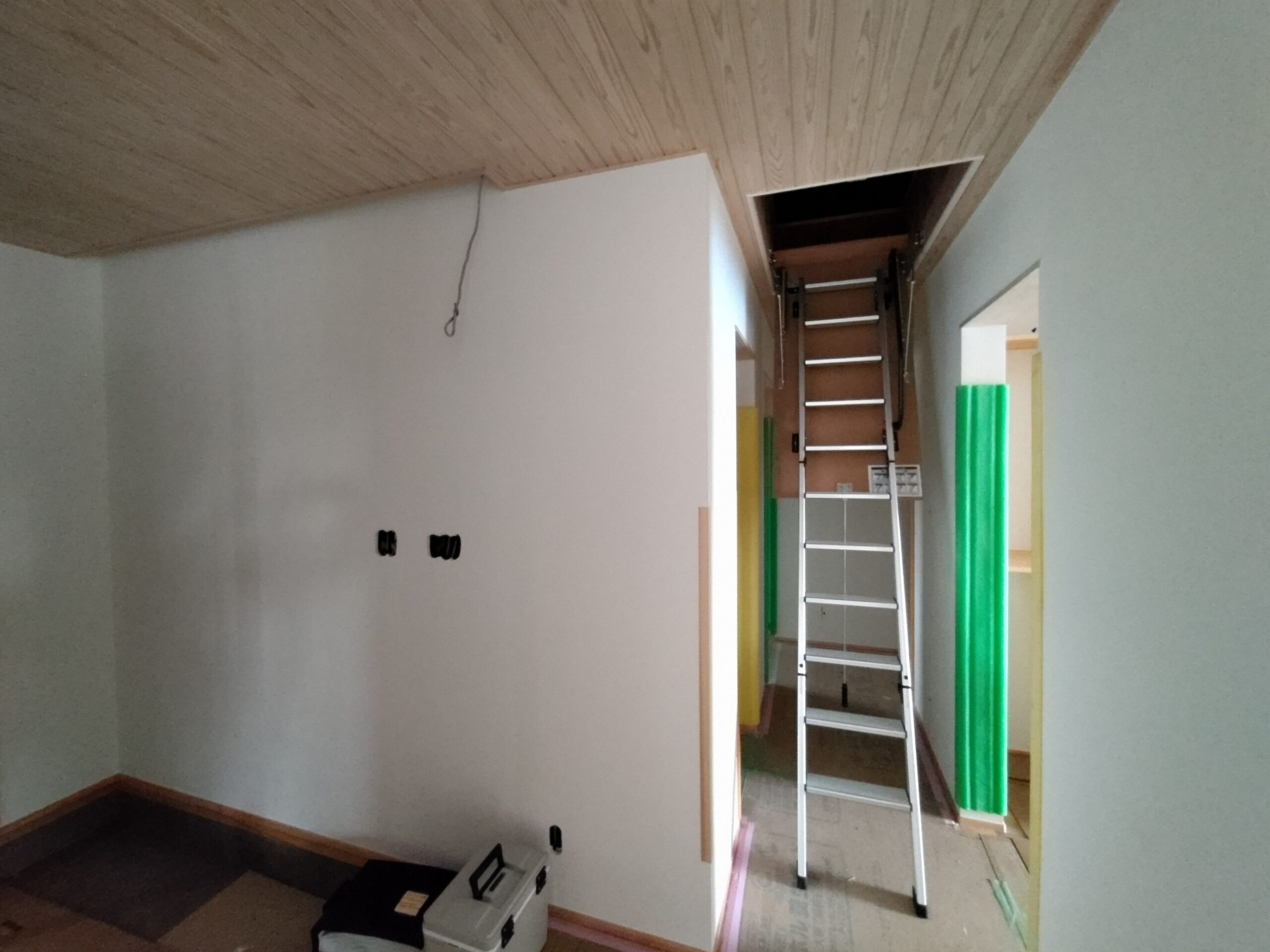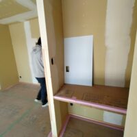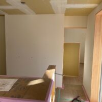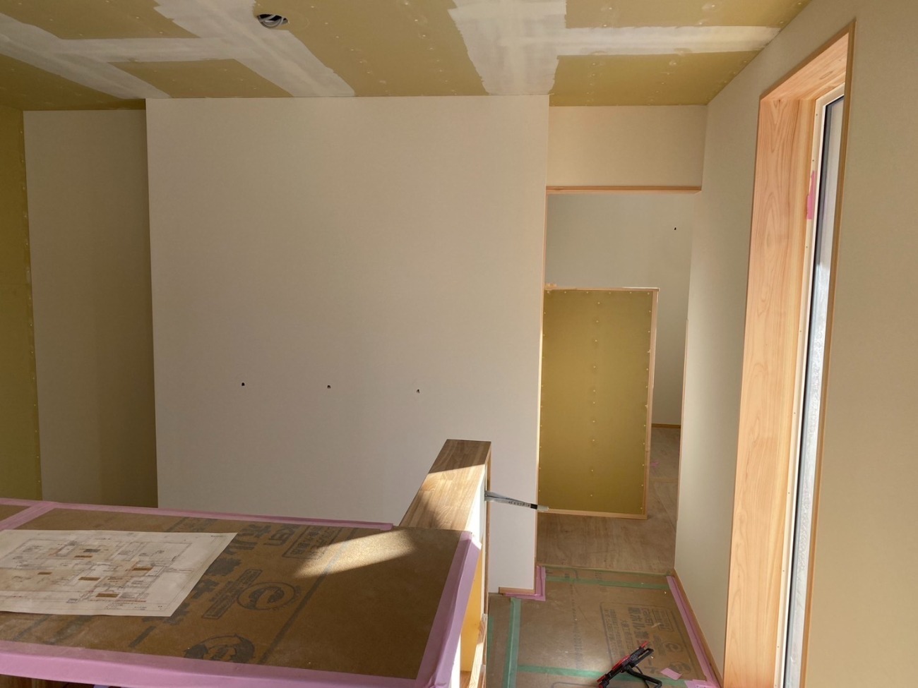 現場はこれからクロス下地のパテ処理の工程に入ります。下地のせっこうボードの突き付けの目地やビスの穴などをパテ処理して平滑とし、クロスを貼った際に下地の凹凸が表面に現れないようにするための、見えなくりはしますが大事な処理です。