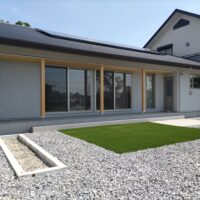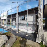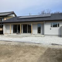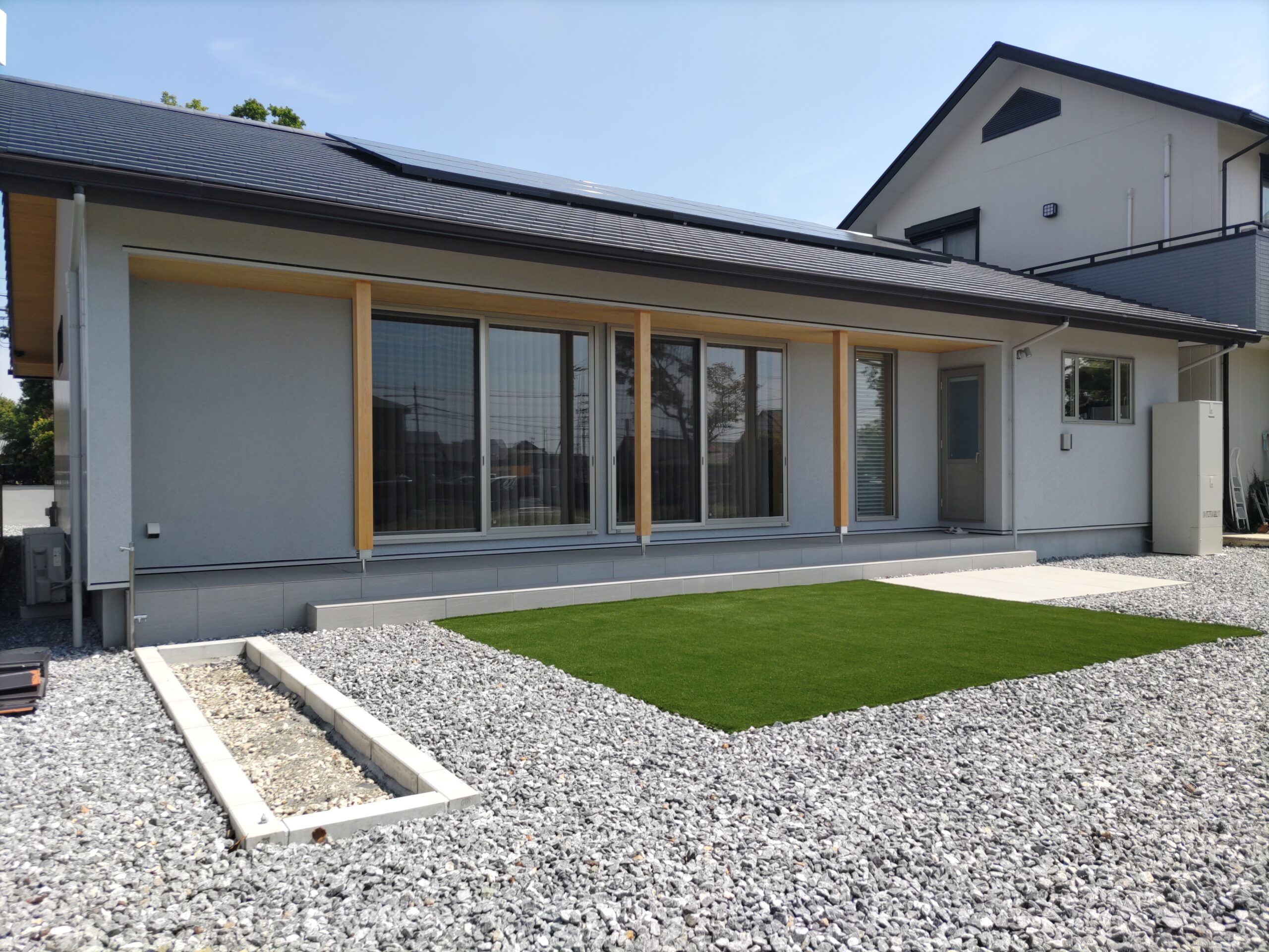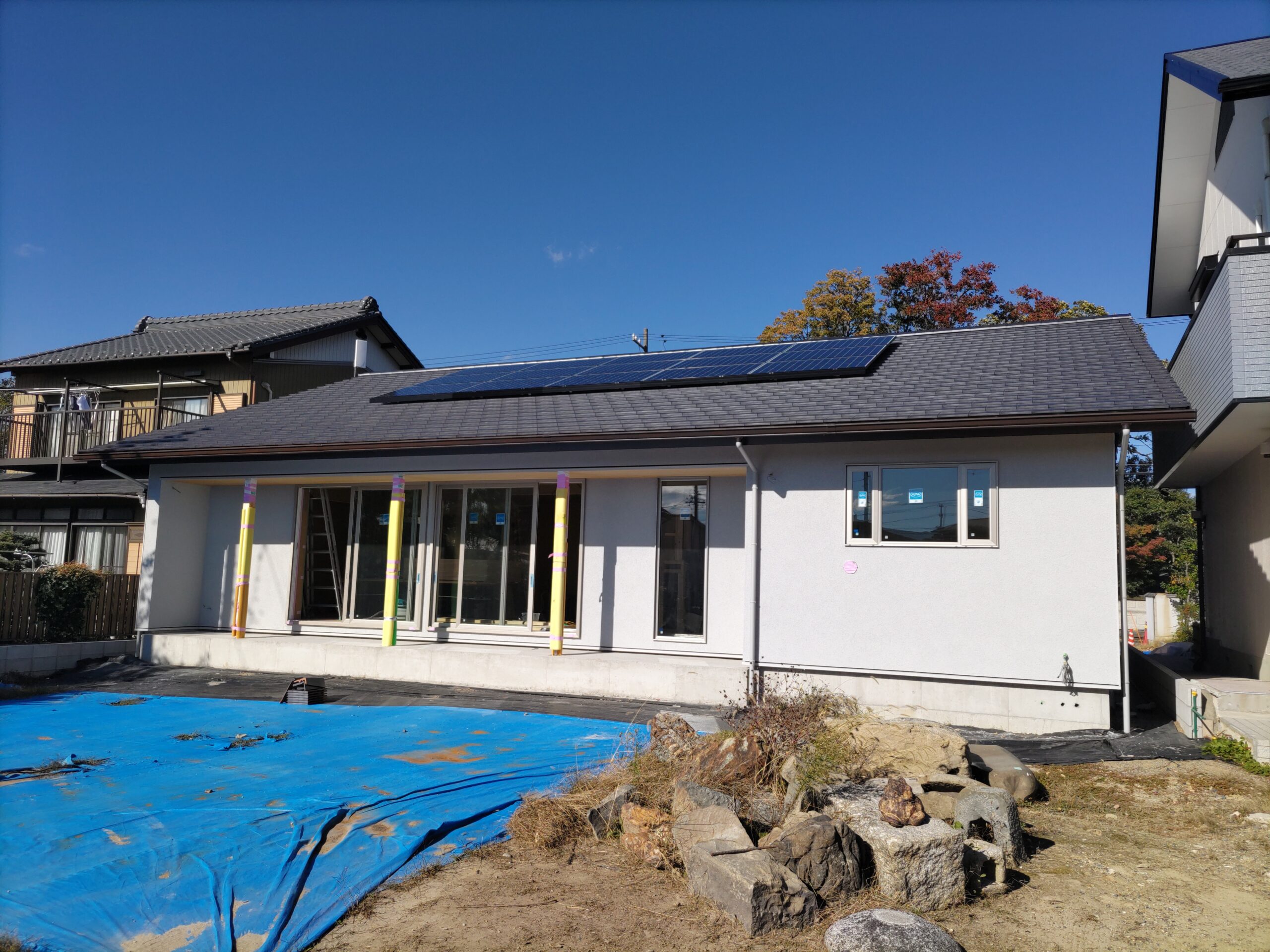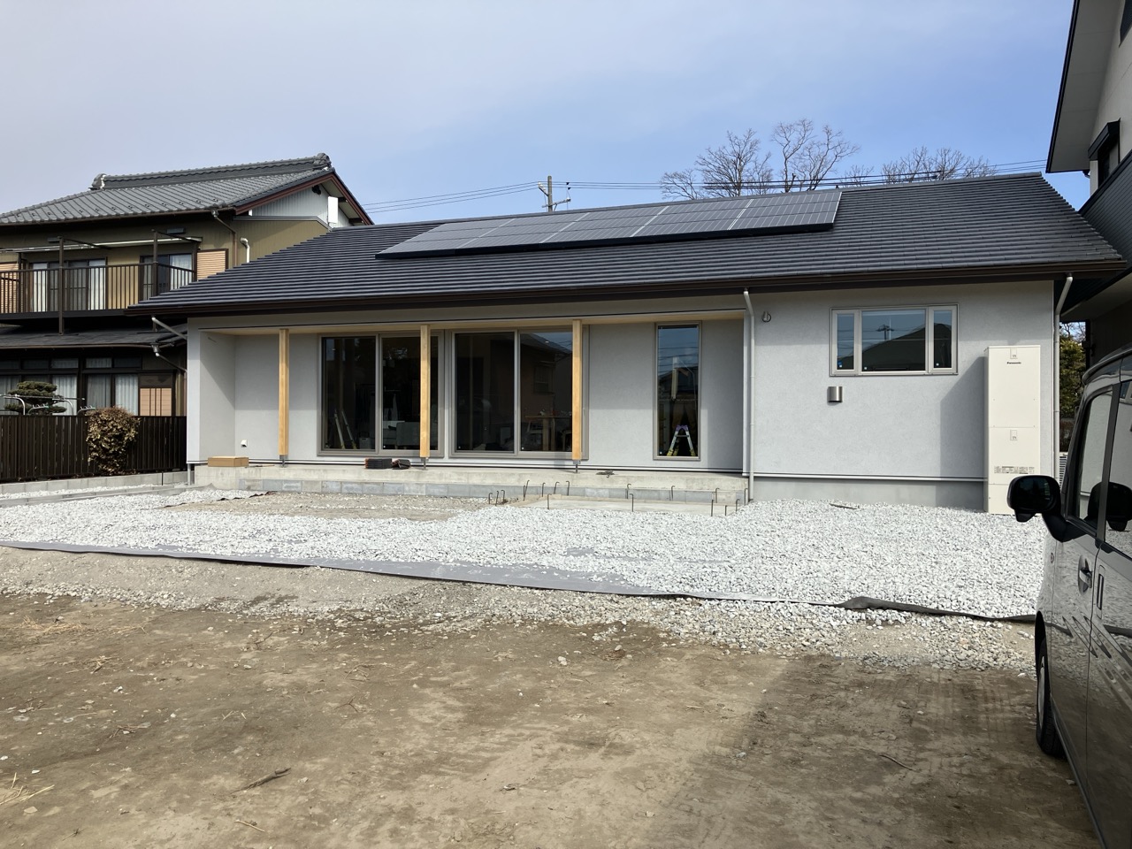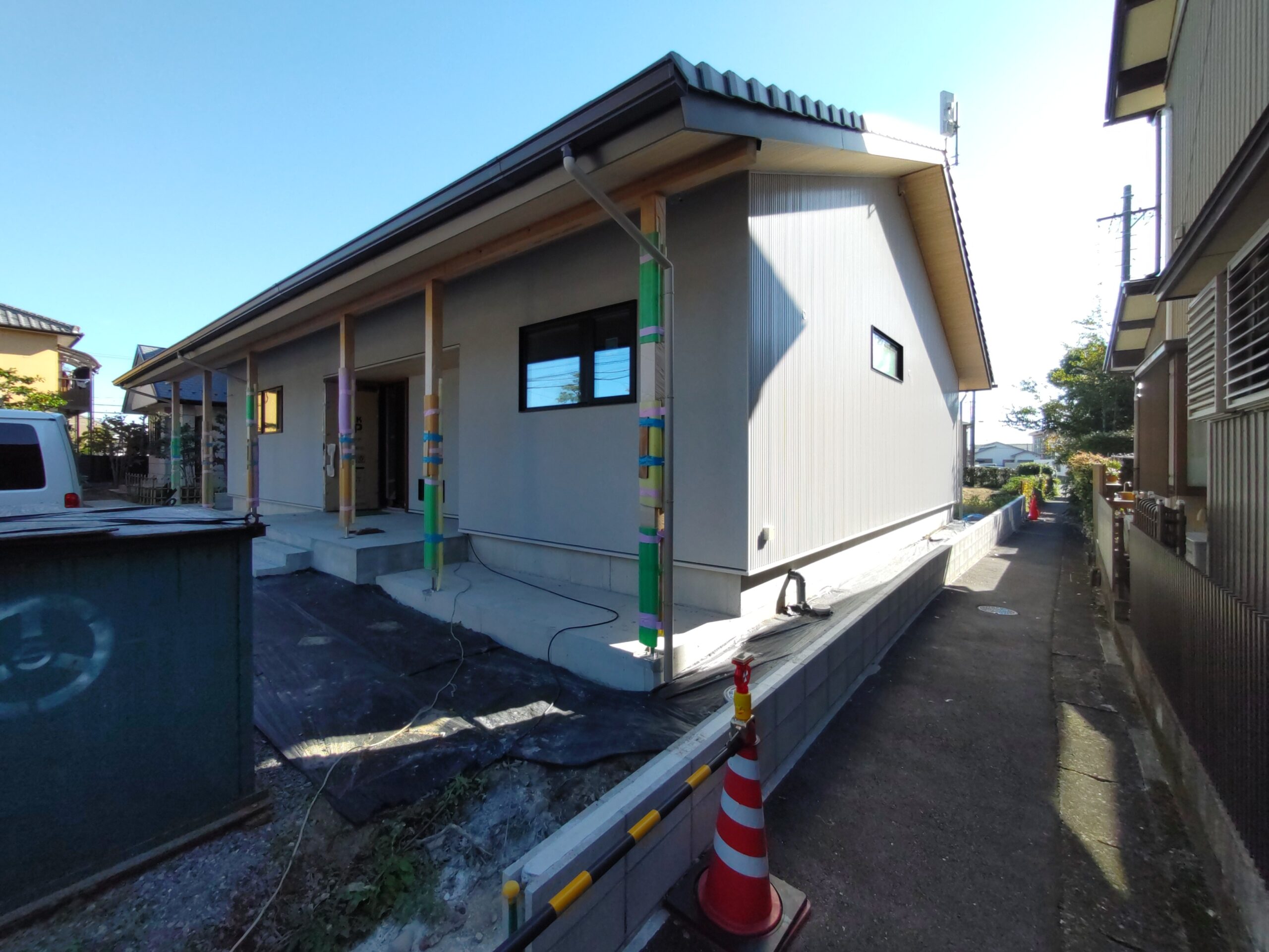 やっと足場が解体されました。ホワイトグレーのシックな色合い。天気が良すぎてホワイトに見えますが、北側に回ると落ち着いた色の平屋の外観が見られます。