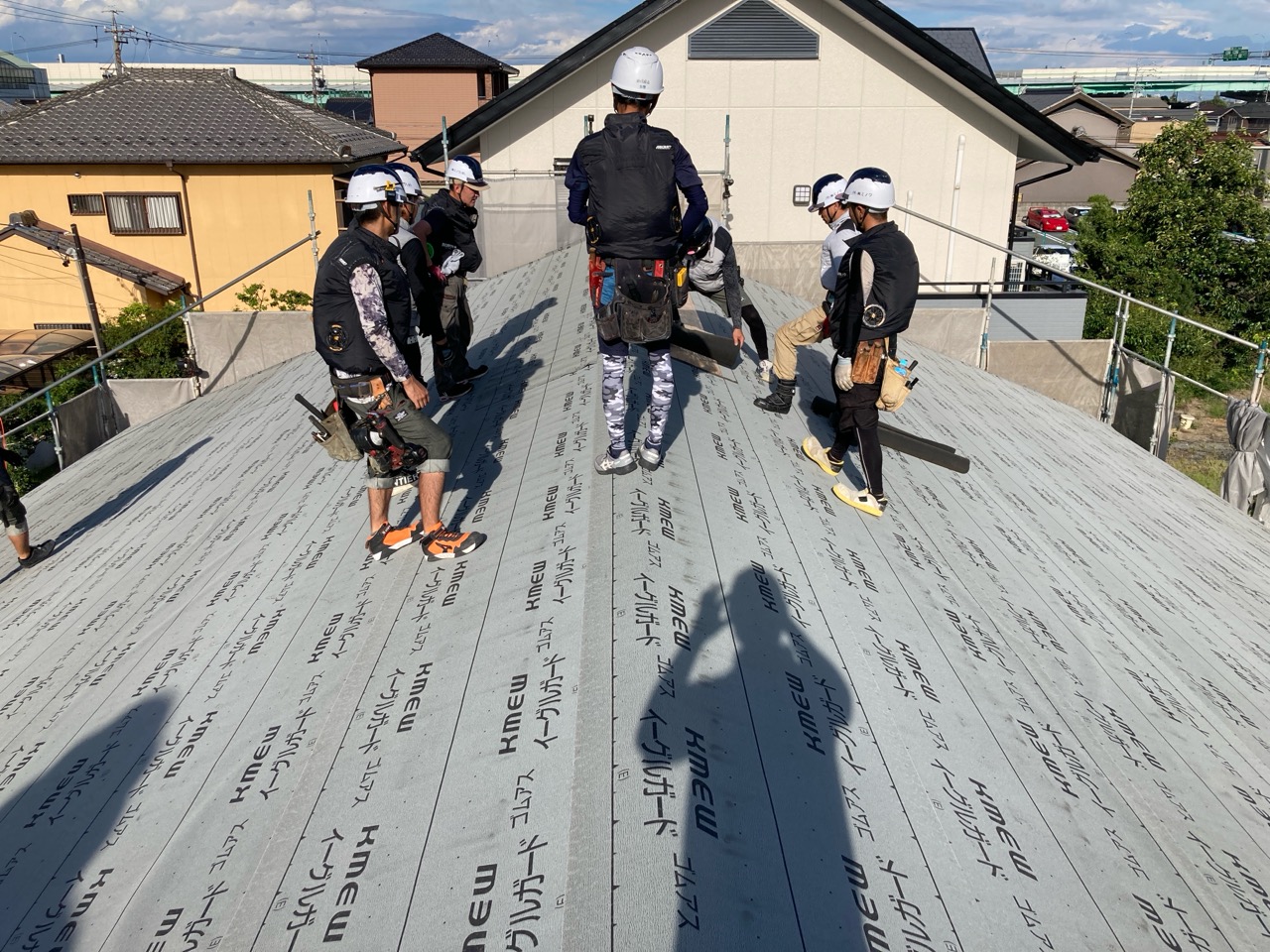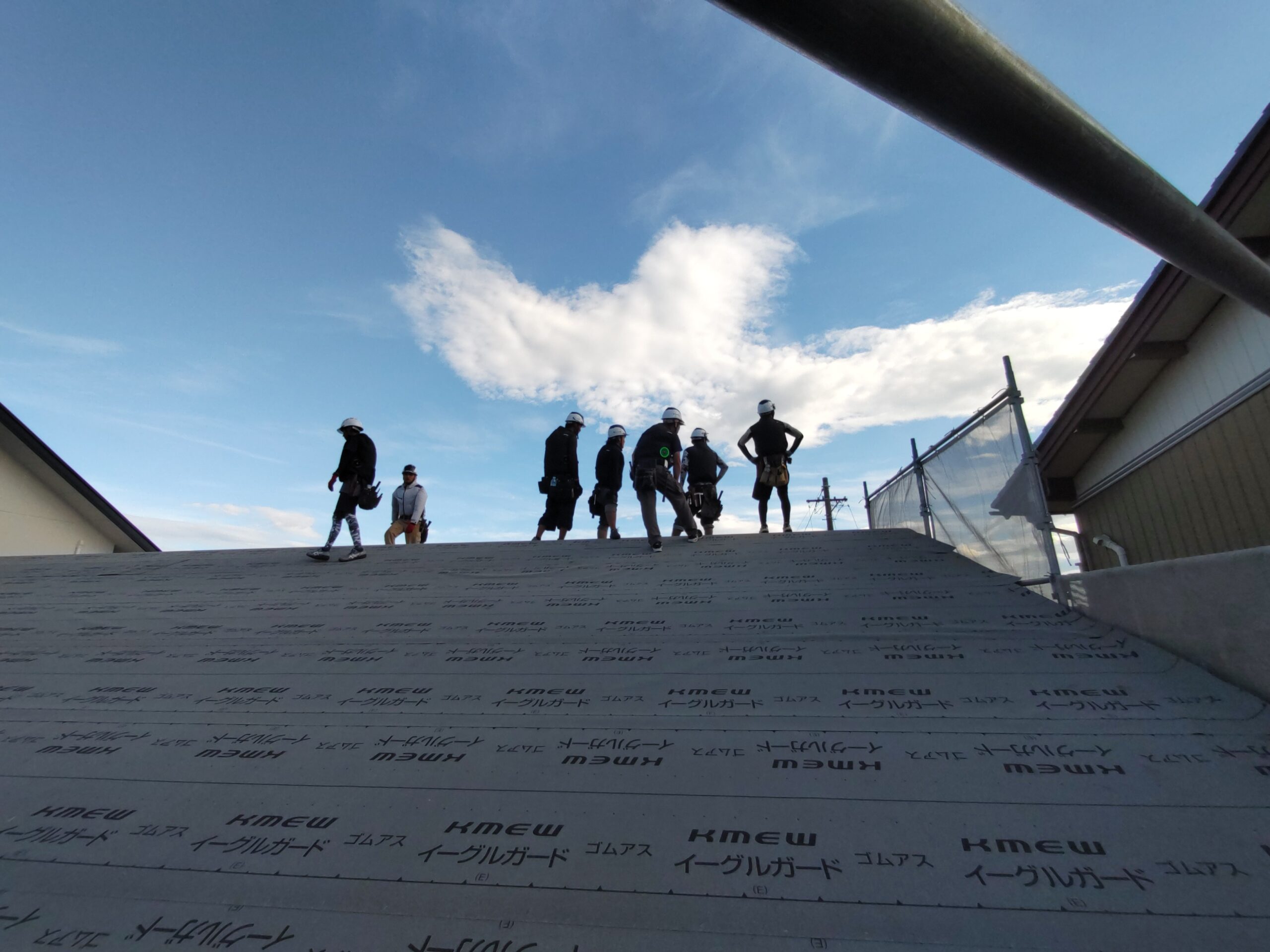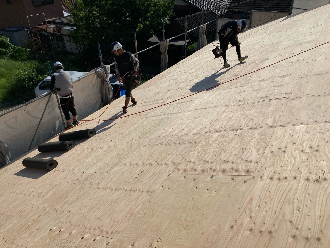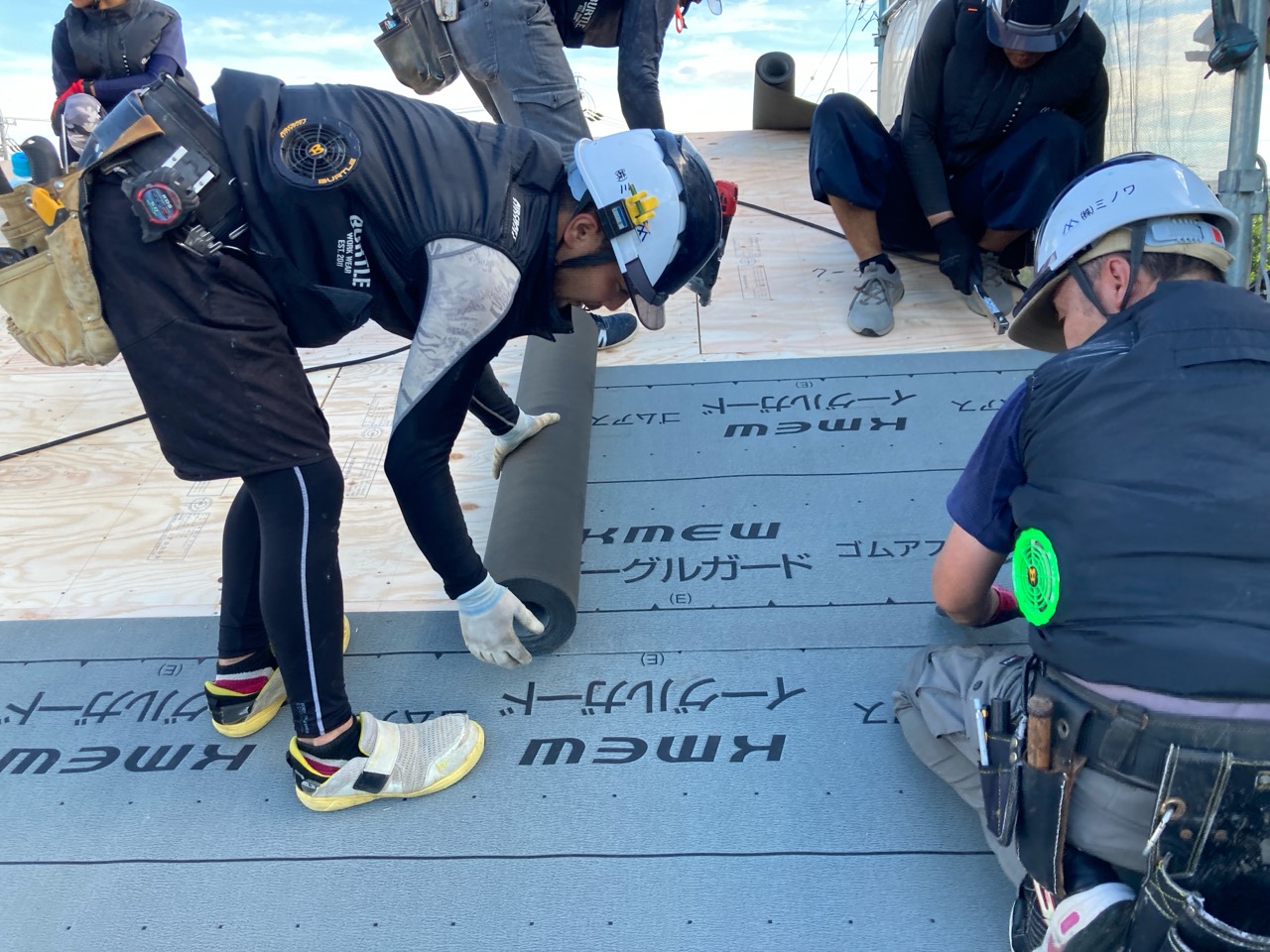 防水のアスファルトルーフィング張り。その名の通り熱の吸収・保持の力が大きく、日差しも相まって涼しさの要素が欠片も無い作業ですが、これが最後と、人員総出で留め付けていくので早いのなんの。