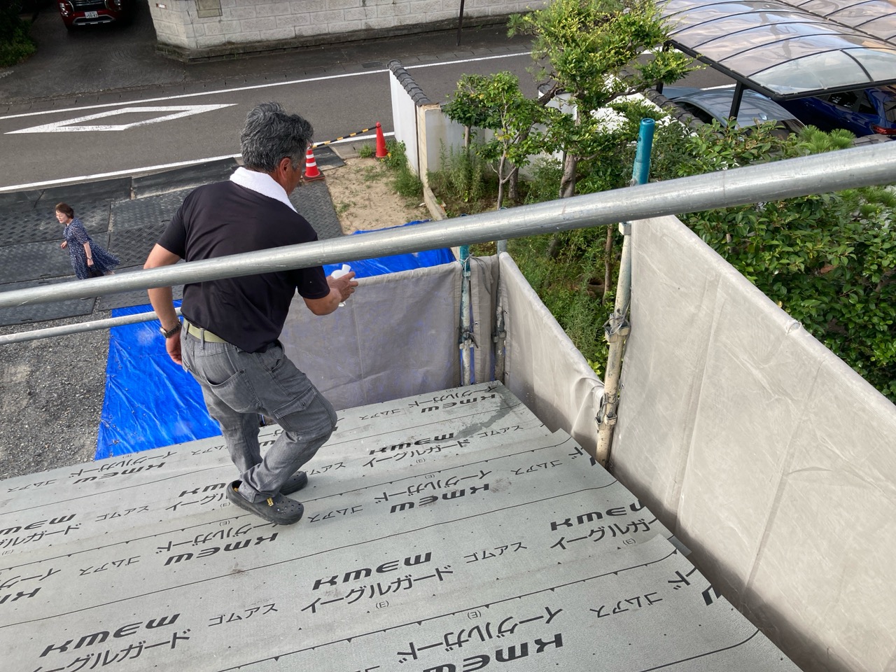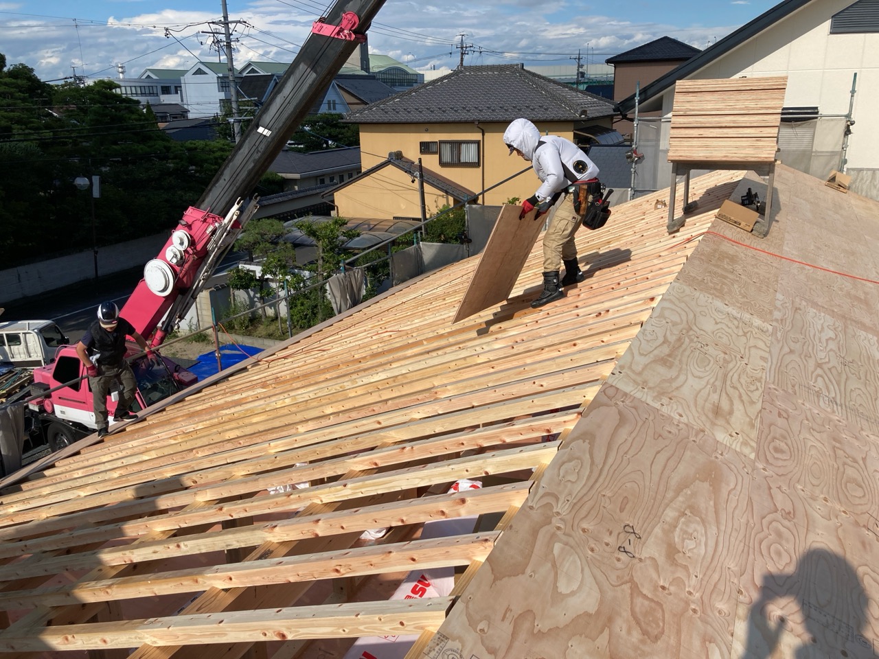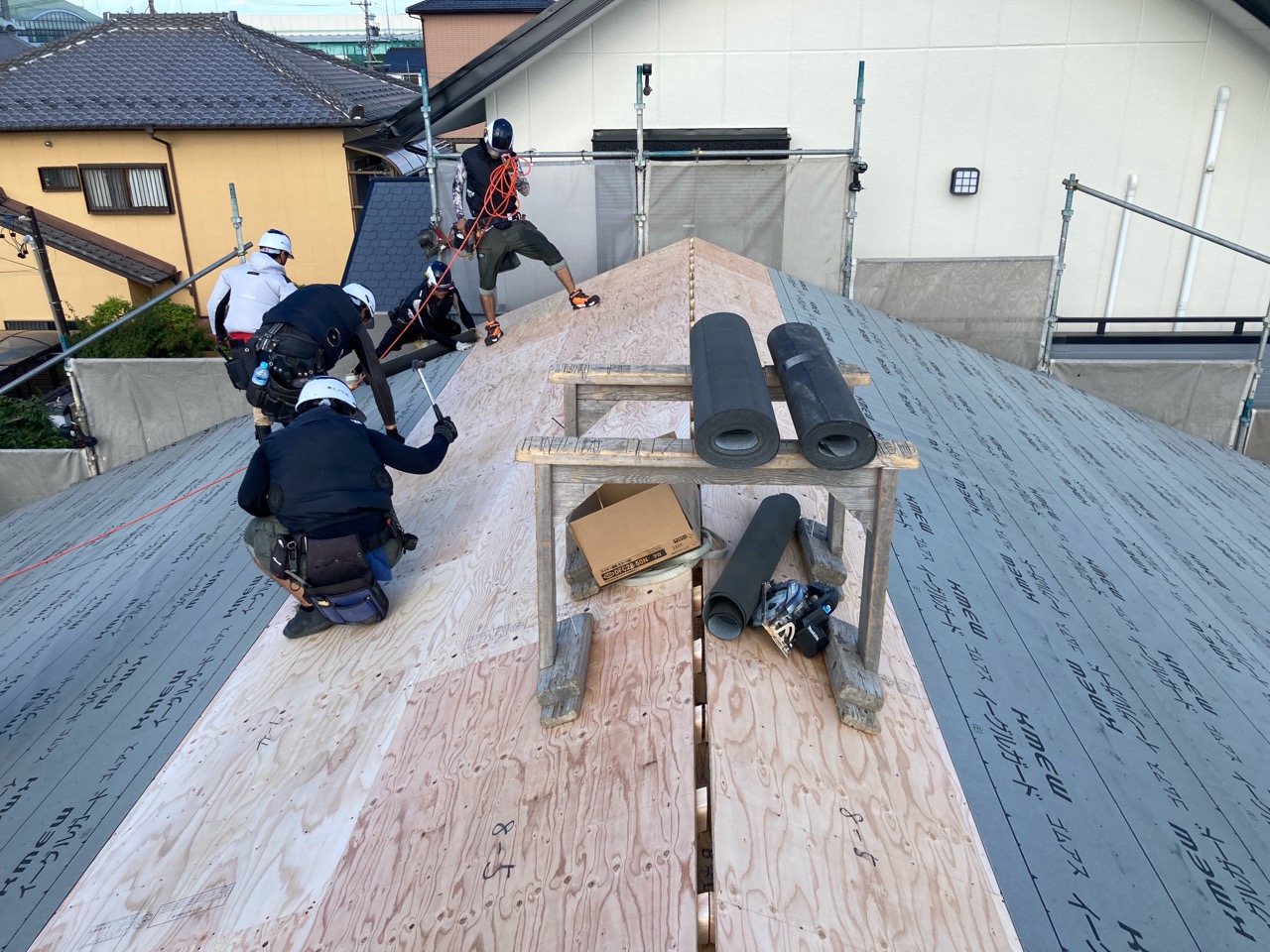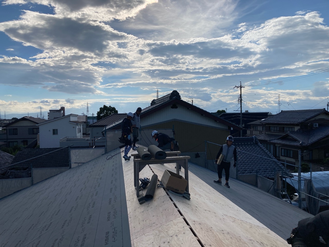 防水のアスファルトルーフィング張り。その名の通り熱の吸収・保持の力が大きく、日差しも相まって涼しさの要素が欠片も無い作業ですが、これが最後と、人員総出で留め付けていくので早いのなんの。