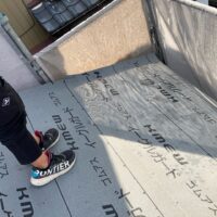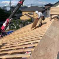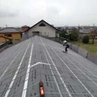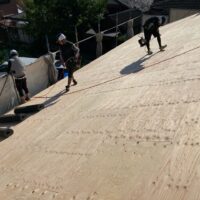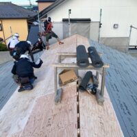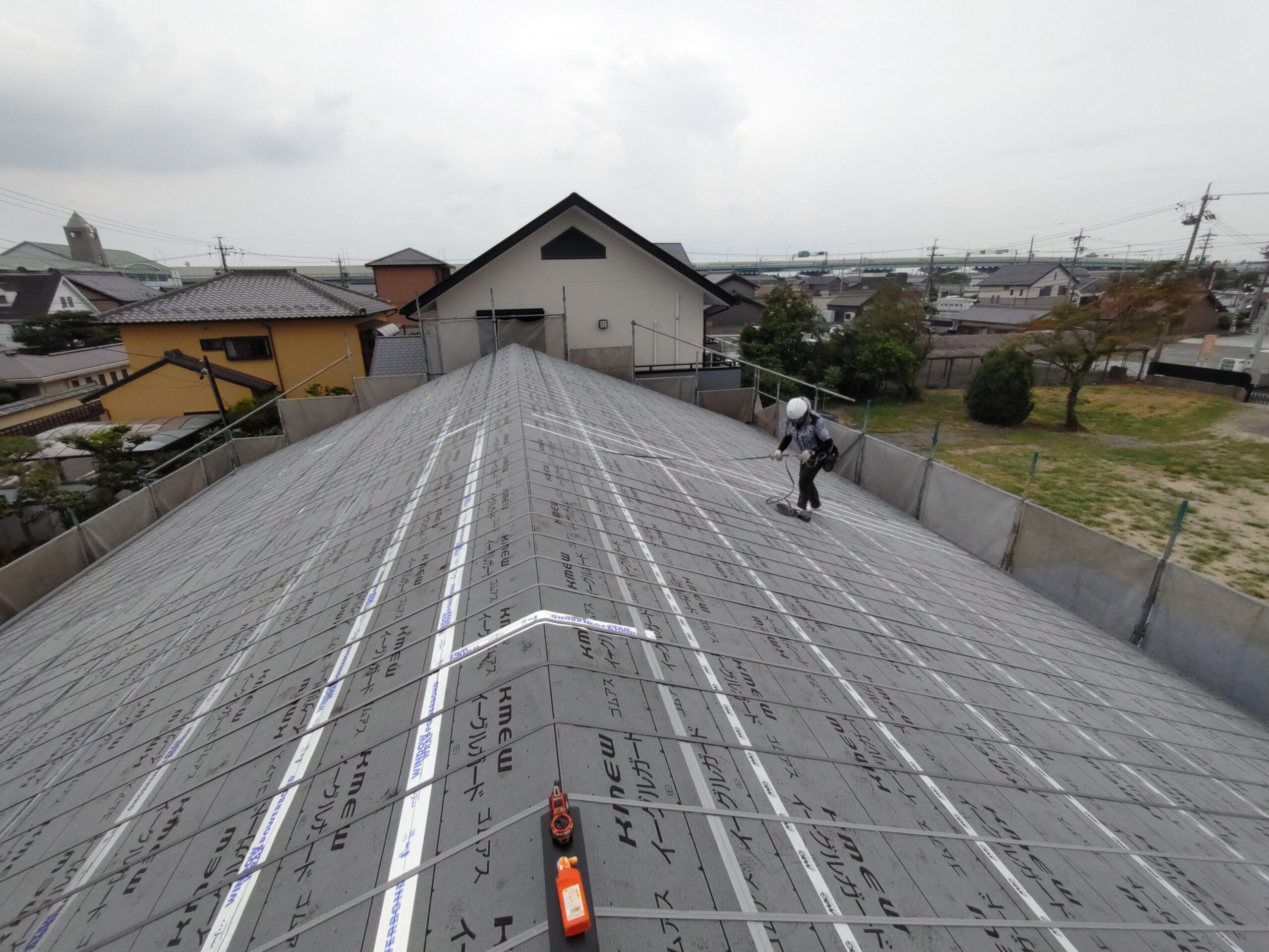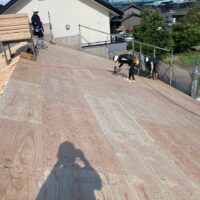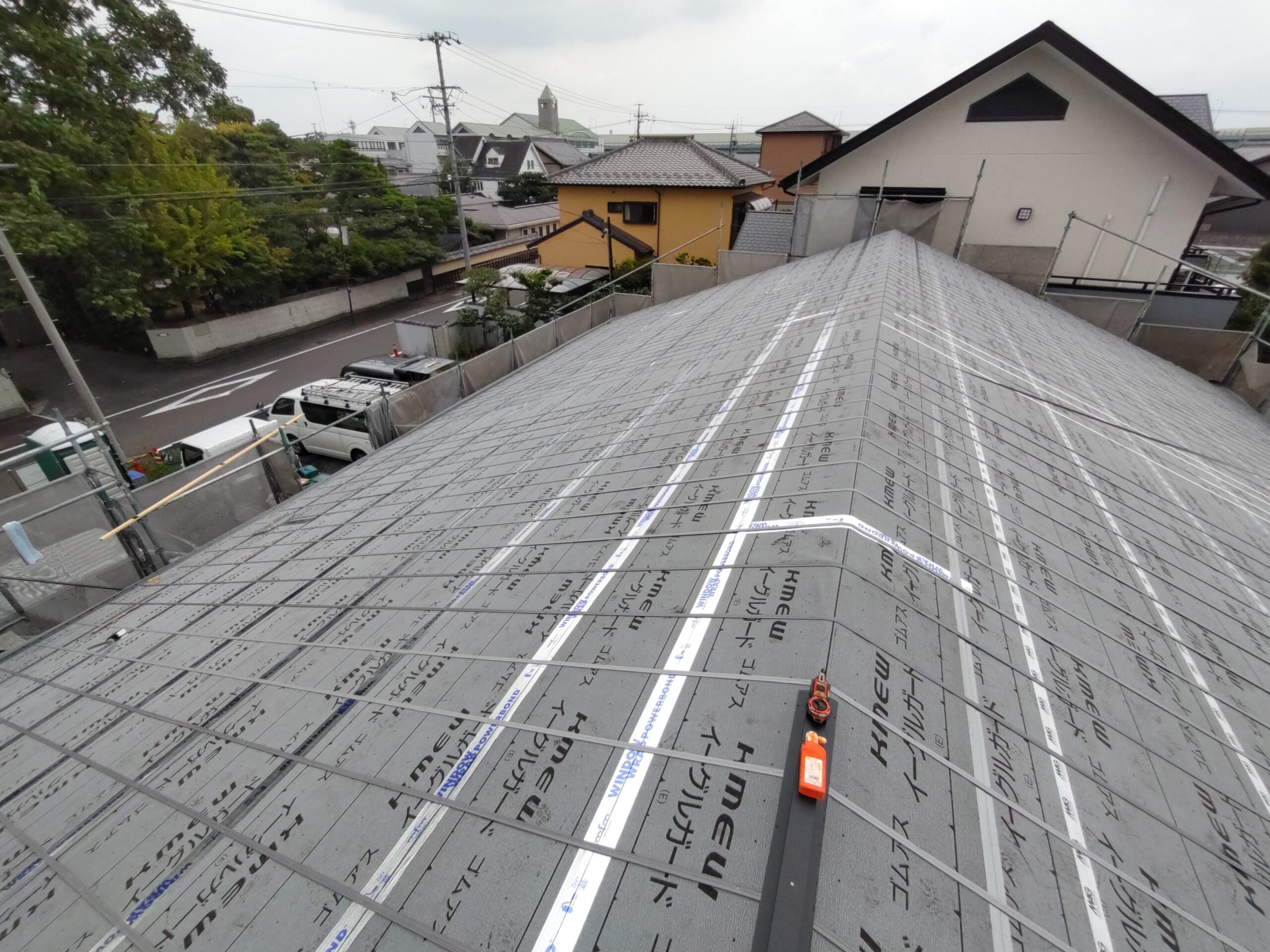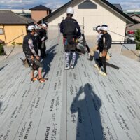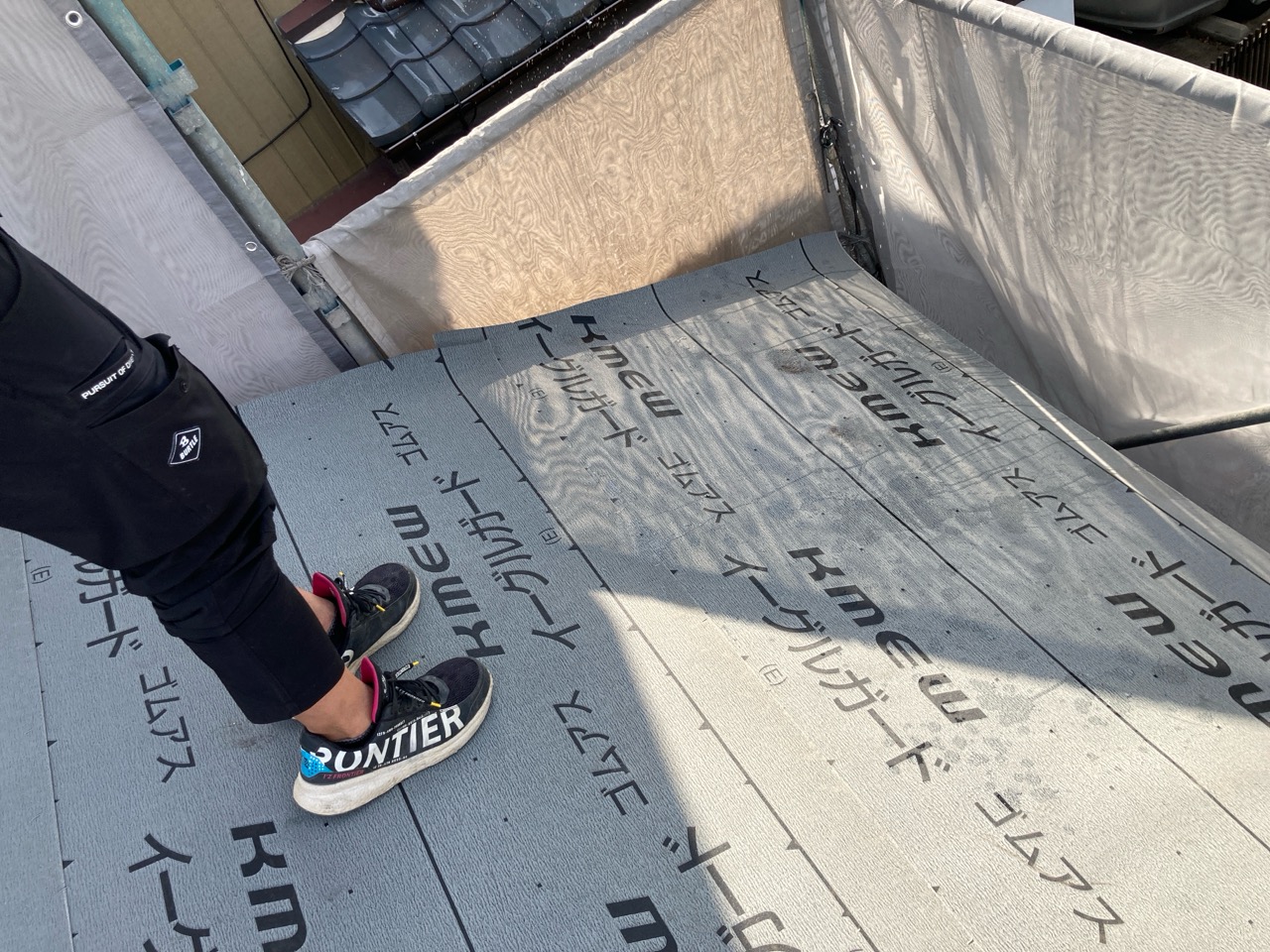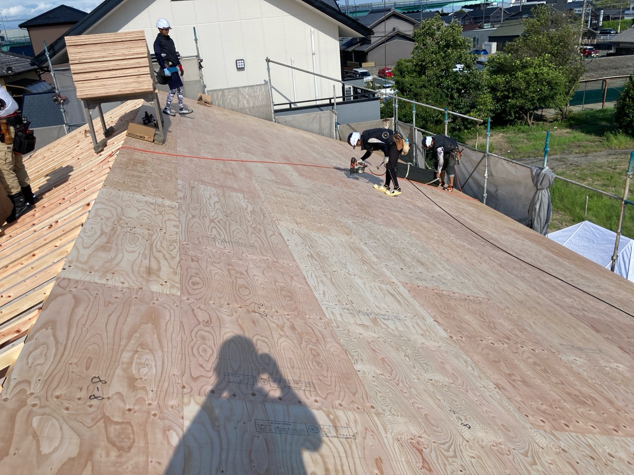 防水のアスファルトルーフィング張り。その名の通り熱の吸収・保持の力が大きく、日差しも相まって涼しさの要素が欠片も無い作業ですが、これが最後と、人員総出で留め付けていくので早いのなんの。