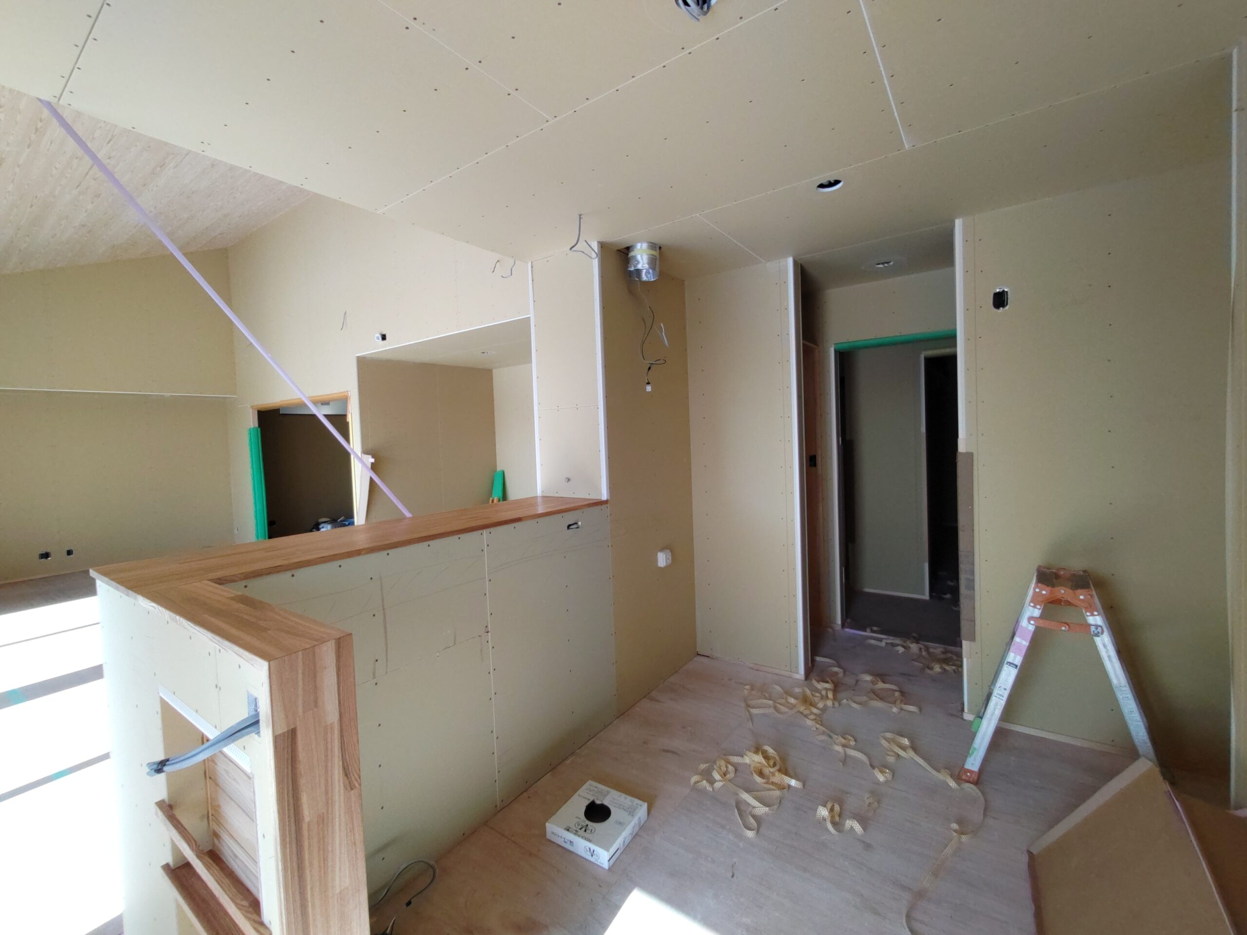 リビングダイニングの勾配天井部分にかかる作業床。相変わらず低めに抑えられて良い感じに見えます。これくらいの低い天井だと落ち着きがあるな、と改めて感じます。