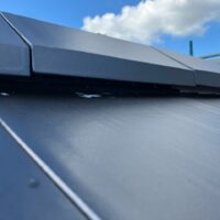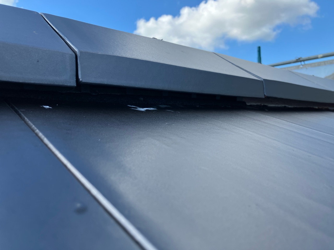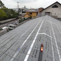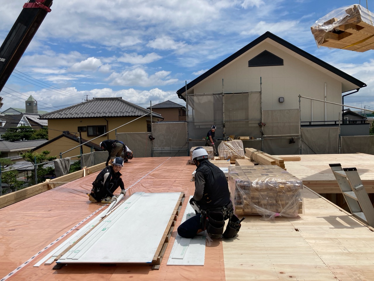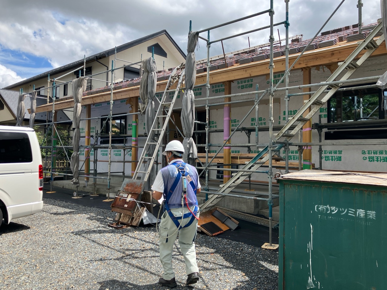 台風の通過と前後して行っていました屋根瓦葺き工事が完了しています。シンプルな切妻屋根のため、できあがりも非常に美しく見えます。今回は棟瓦の下に棟換気金物を仕込んでいます。長期優良住宅における小屋裏換気計算の際、妻換気とするよりももう少し効率的に計算できるため、仕上がりも計算数値的にも美しく収める事ができます。