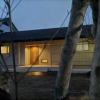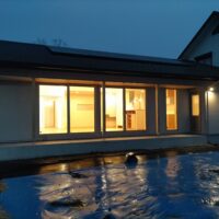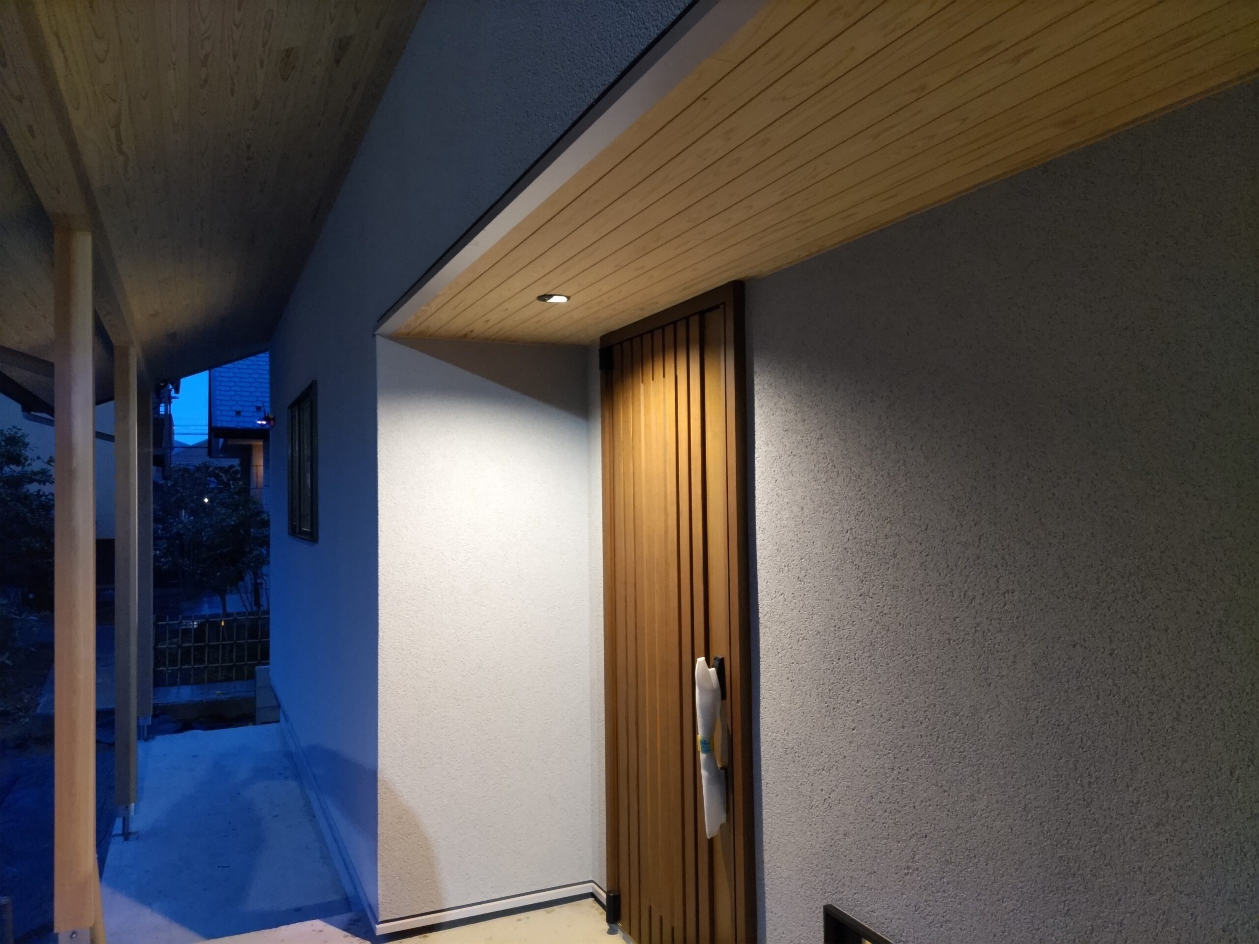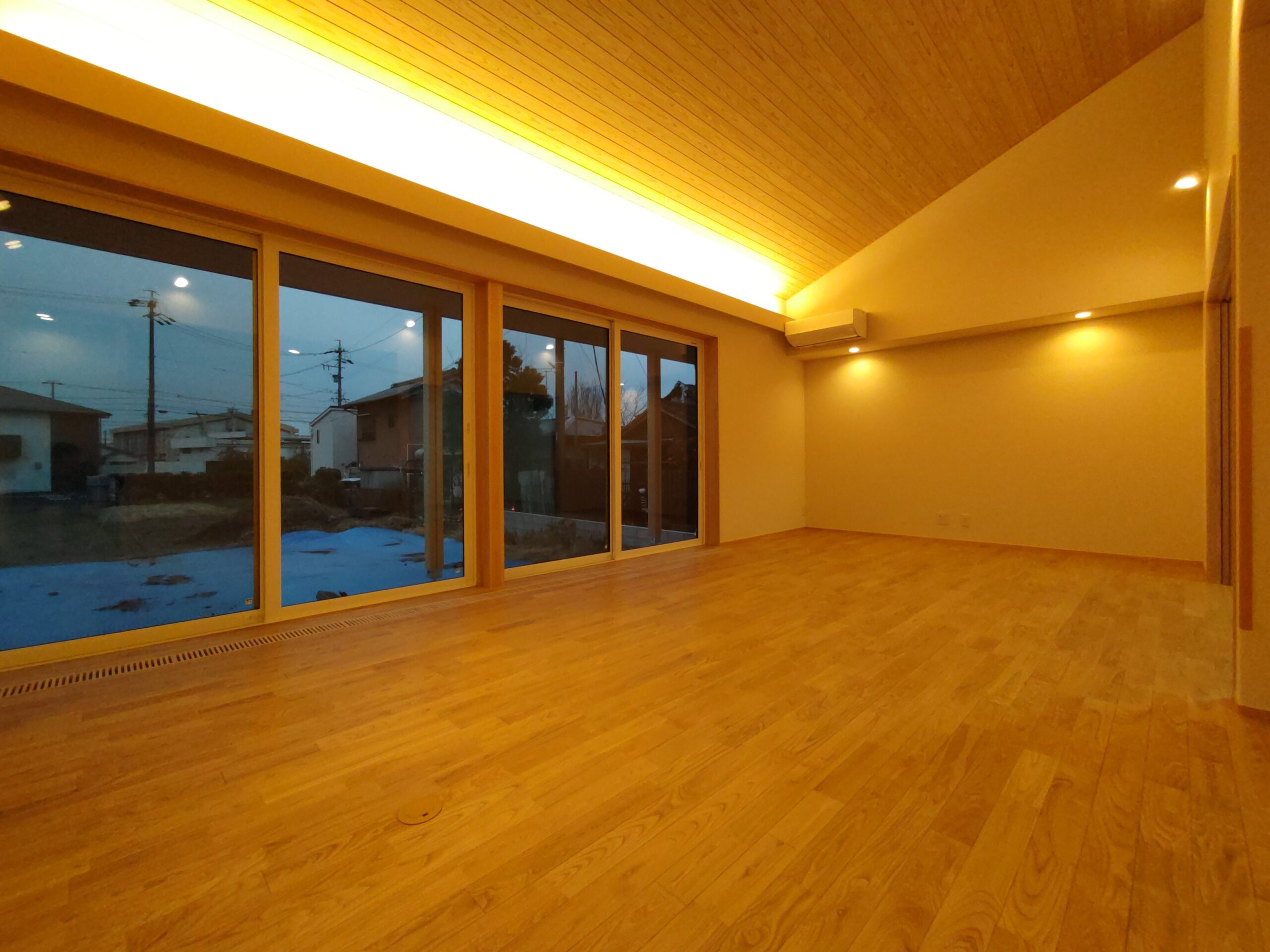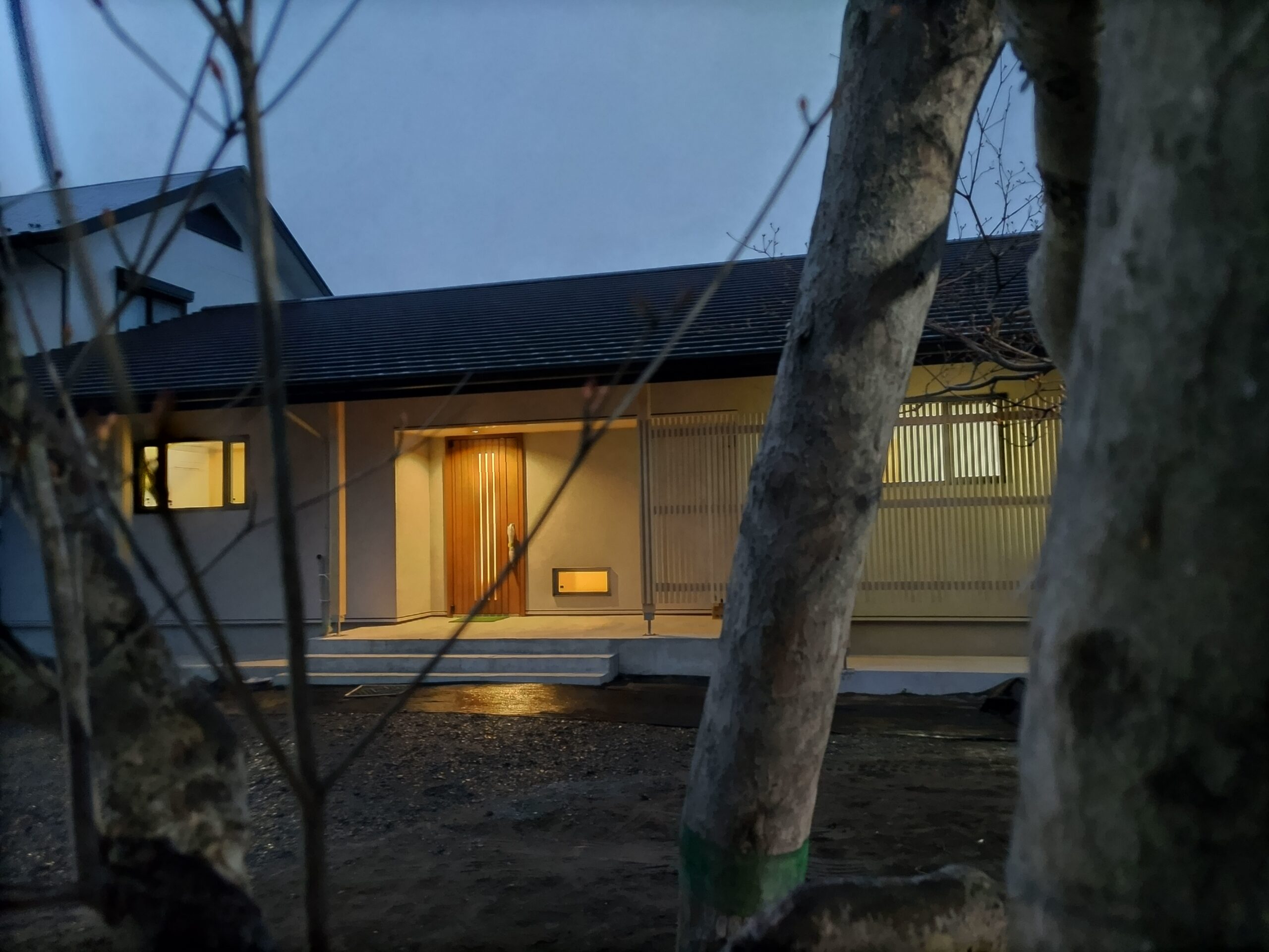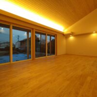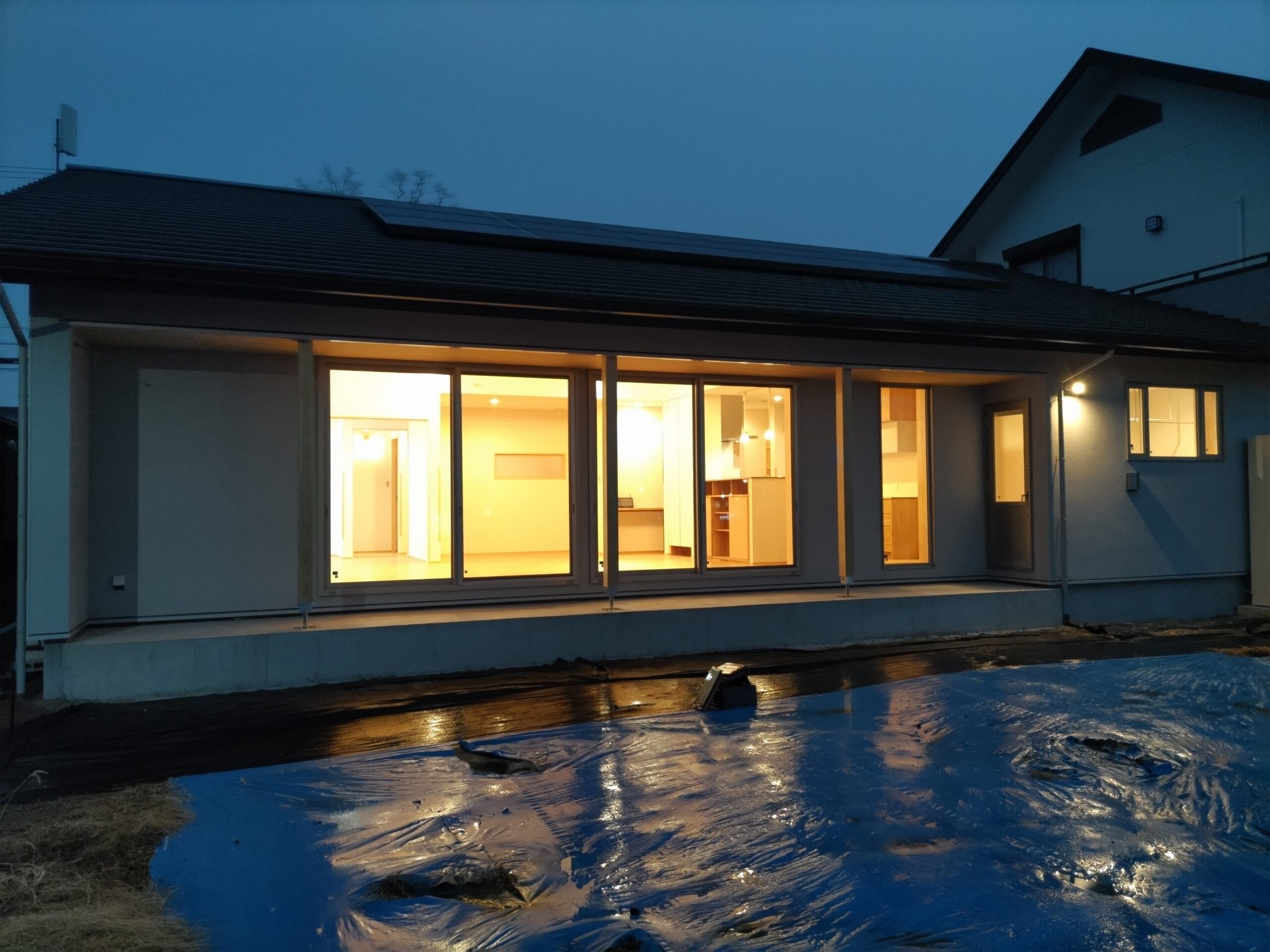 昨日まで行われていた見学会にご来場できなかった、営業中のお客様を一組ご案内しました。夕方になりましたのでついでに夜の景色を撮影していく事にしました。昼に撮影する明るい印象とはまた別の趣があります。窓からこぼれる暖色の照明と周囲の暗さが視覚的な暖かさを感じさせます。