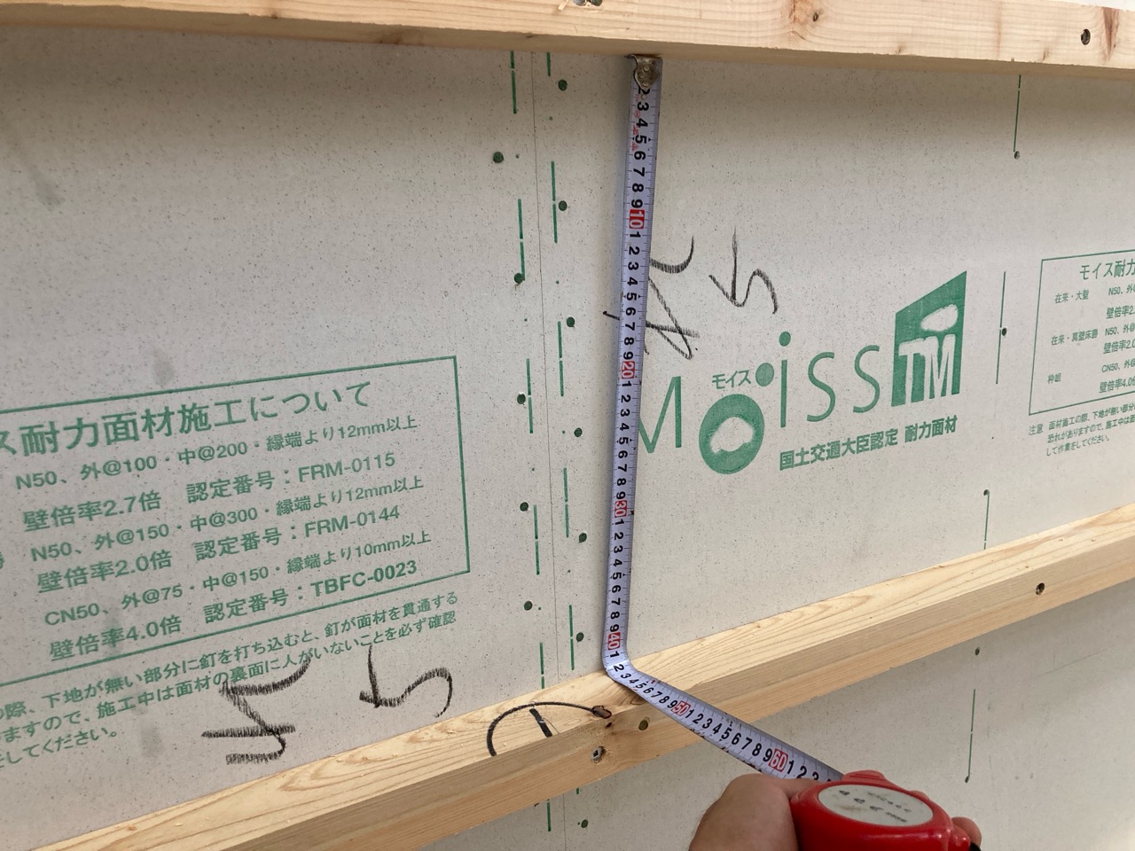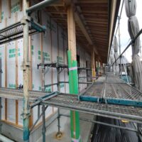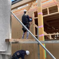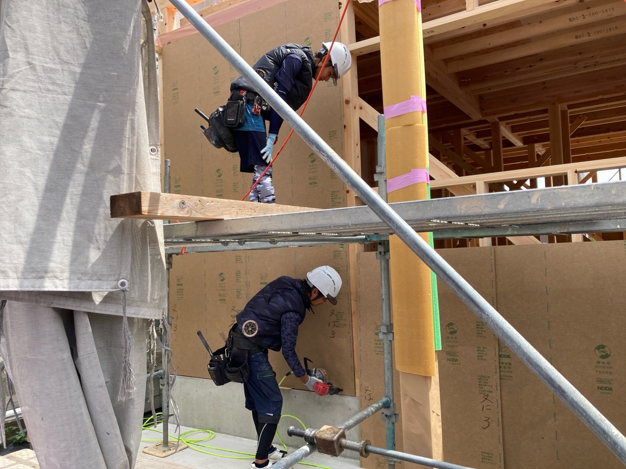 外周部の耐力面材張り作業も、高さ3mある面材を足場の上下段に分かれて効率よく留付をしていきます。今回は建物の南北面と東西面で外壁仕上材が異なるため、建築基準法の外壁防火構造の仕様上、下地材とみなされる面材の種類を変えています。茶色く映っている物が、木質系面材『ハイベストウッド』。白い方が不燃材料である『モイス』です。外壁仕上材単体で不燃が取れる面はハイベストウッドを使い、取れない面は下地に『モイス』を使用します。