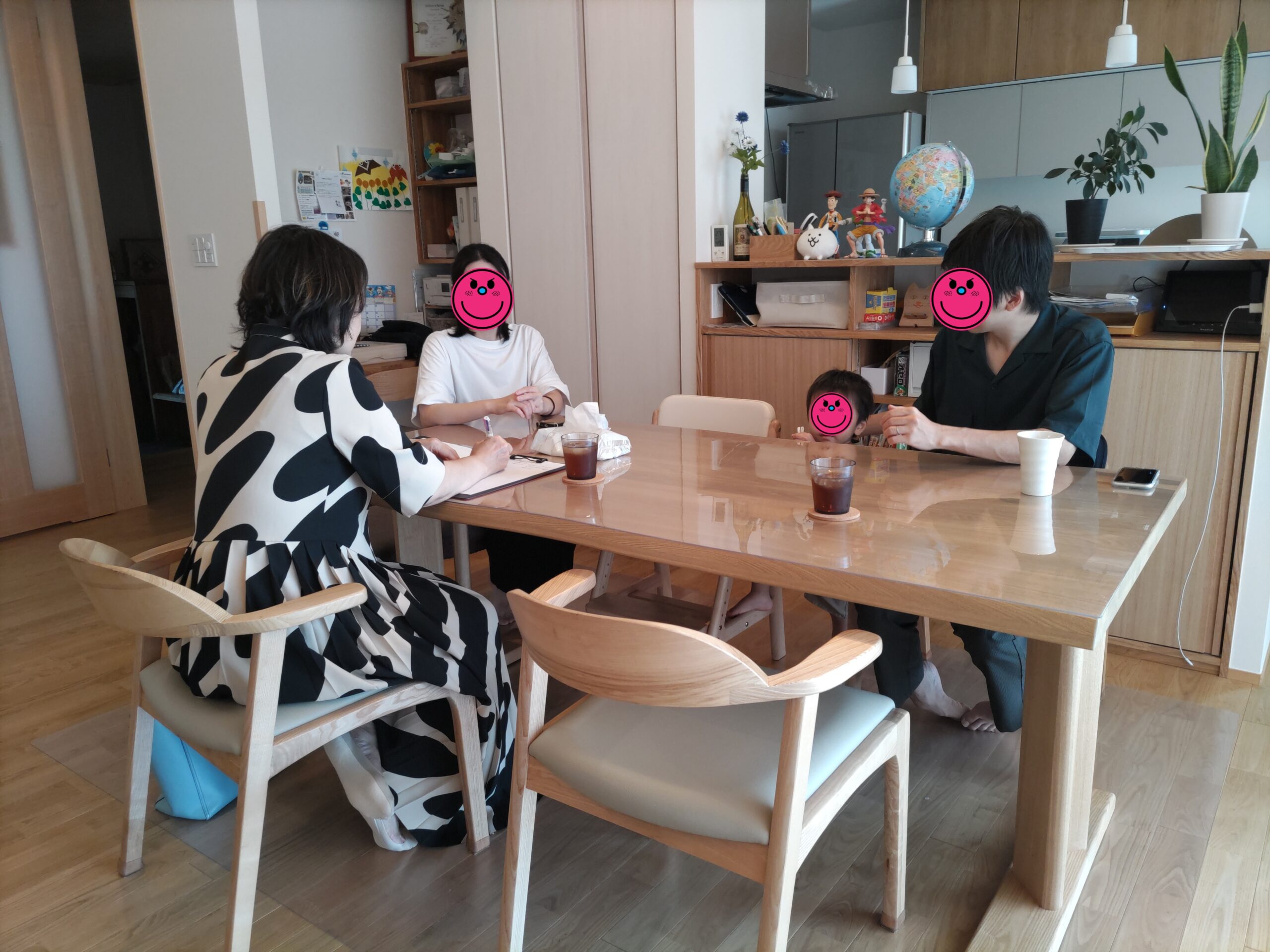 ぎふの木の住まい協議会の季刊誌に掲載する記事のための取材に記者の方とお邪魔しいろいろとお話をうかがいました。まずは住宅内をいろいろと説明しながら一巡し、空間、設備、動線などを確認。その後テーブルに着きf様にお話をうかがいました。