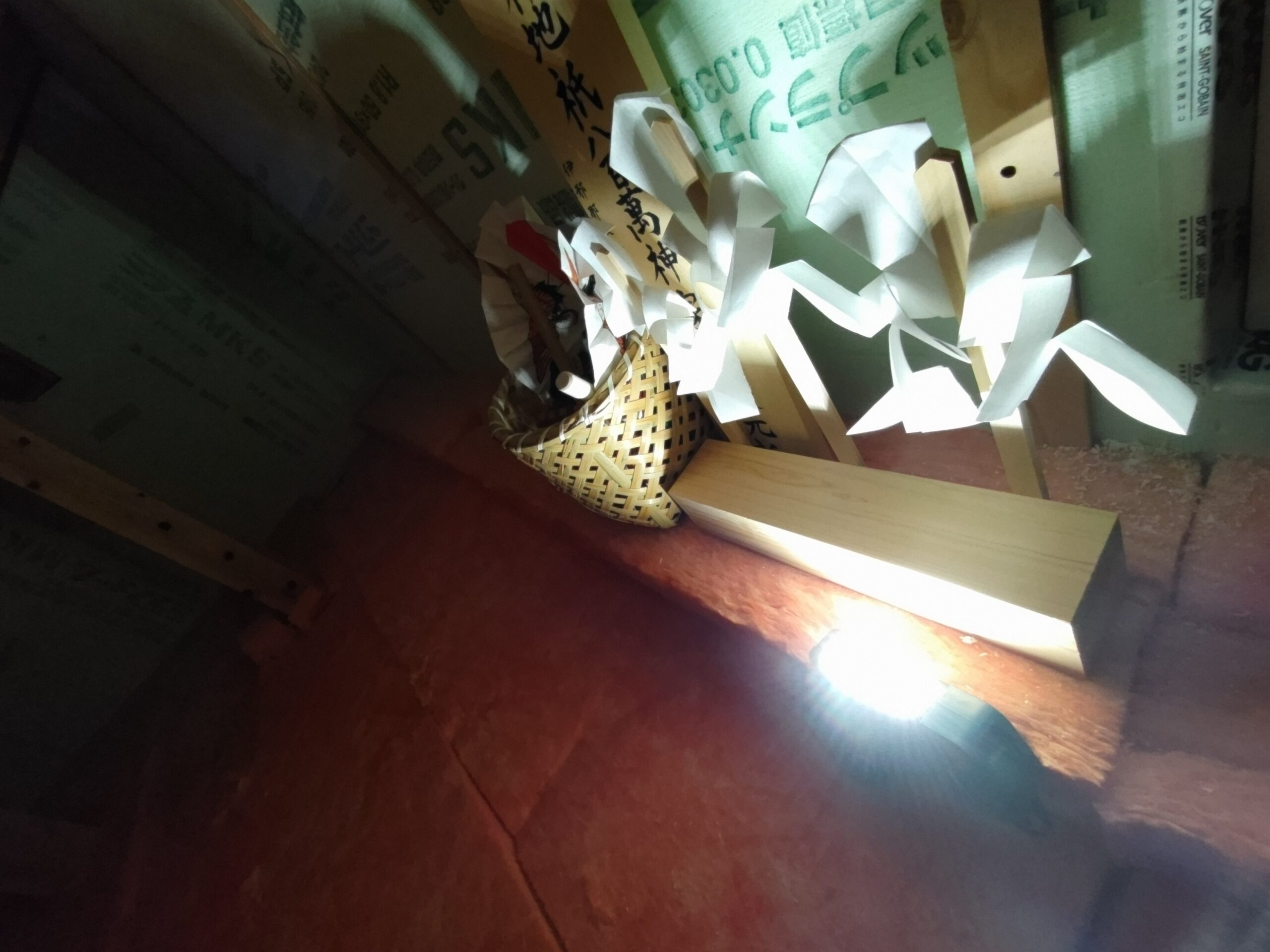 歳末も押し迫った本日、事務所倉庫の大掃除を終え、現場にやって来ました。内装工事もほとんど終えているため、上棟時に奉った棟札、幣束、籠を小屋裏に奉ります。ご家族の末永いご健勝を祈願いたします。