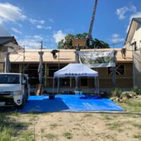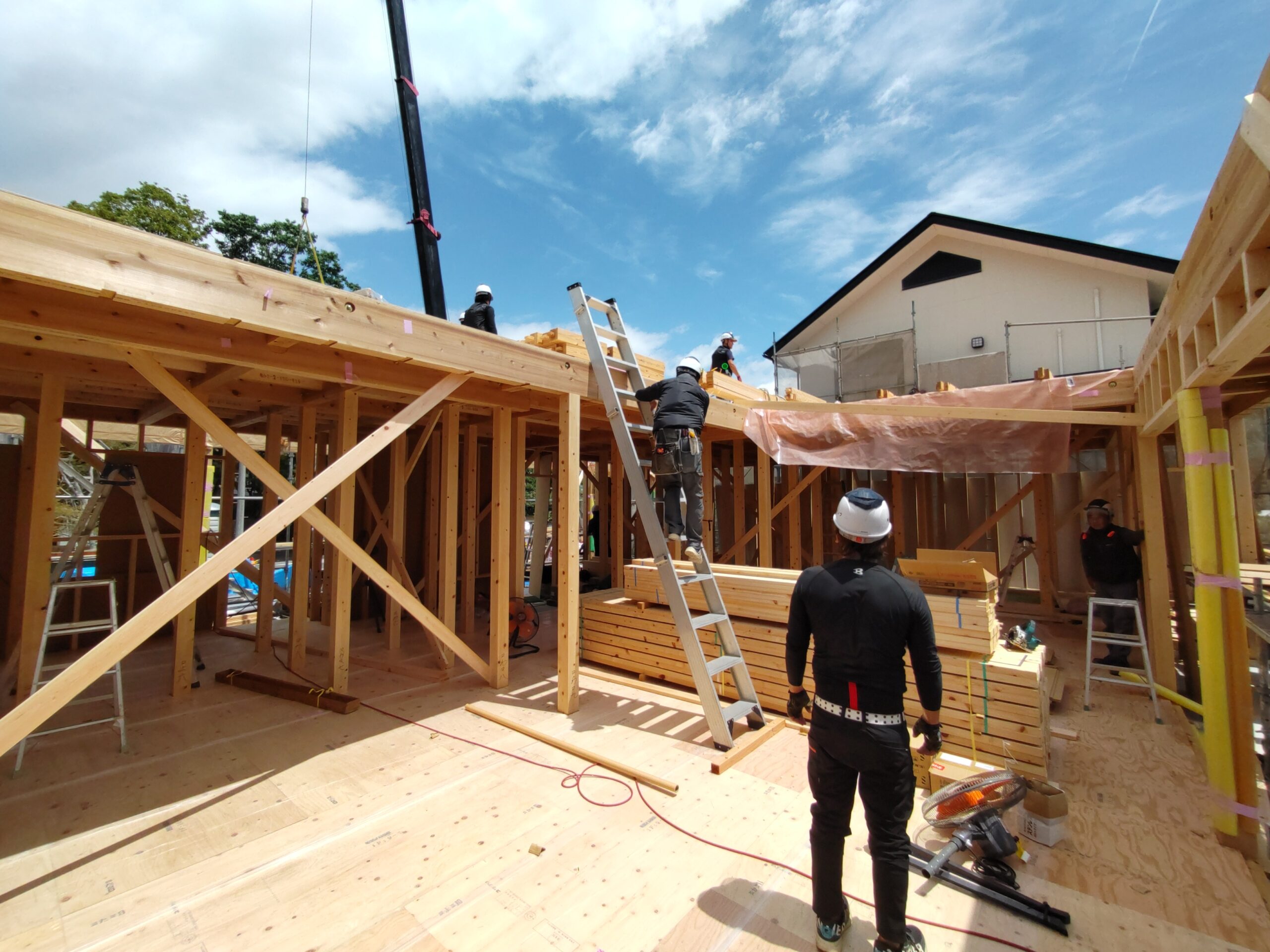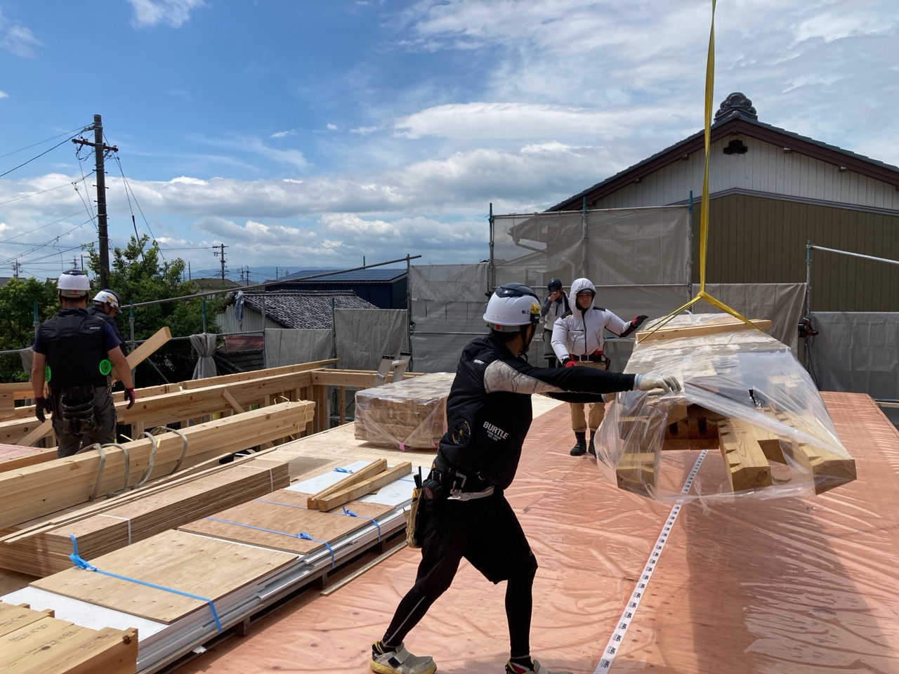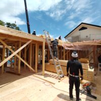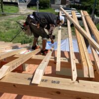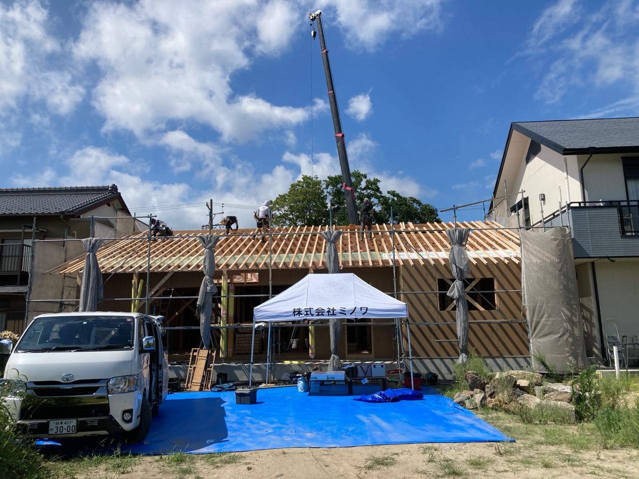 真夏の暑さもピークに達しようか、これからさらにヒートアップしようかという本日、f様邸の上棟が行われました。筆者は別件で遅れて昼前に到着したため、柱建て・梁架けがすでに終わっておりました。しかし平屋建てと侮るなかれ、小屋組みから屋根掛け、ここからが本番です。