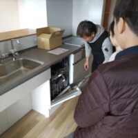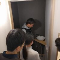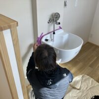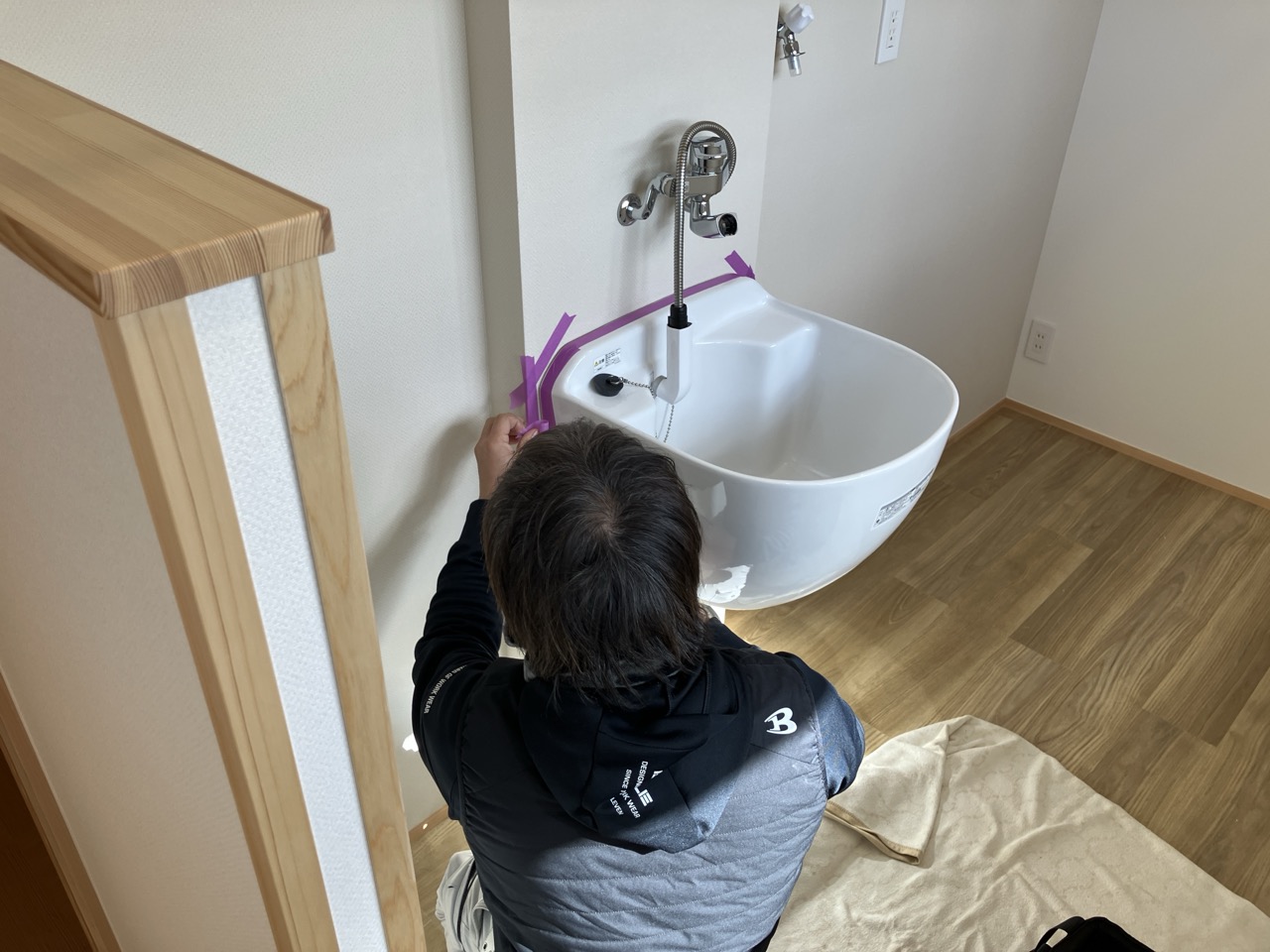 一発勝負でヒヤヒヤものでしたが、無事に取付完了。比較的大きなキャビネットなのでJKSのA野さんと一緒に作業しています。その他の器具も次々と取付完了。トイレのコーナー手洗器の配管接続のため、床下にはJKSのS木さんが潜って作業中です。