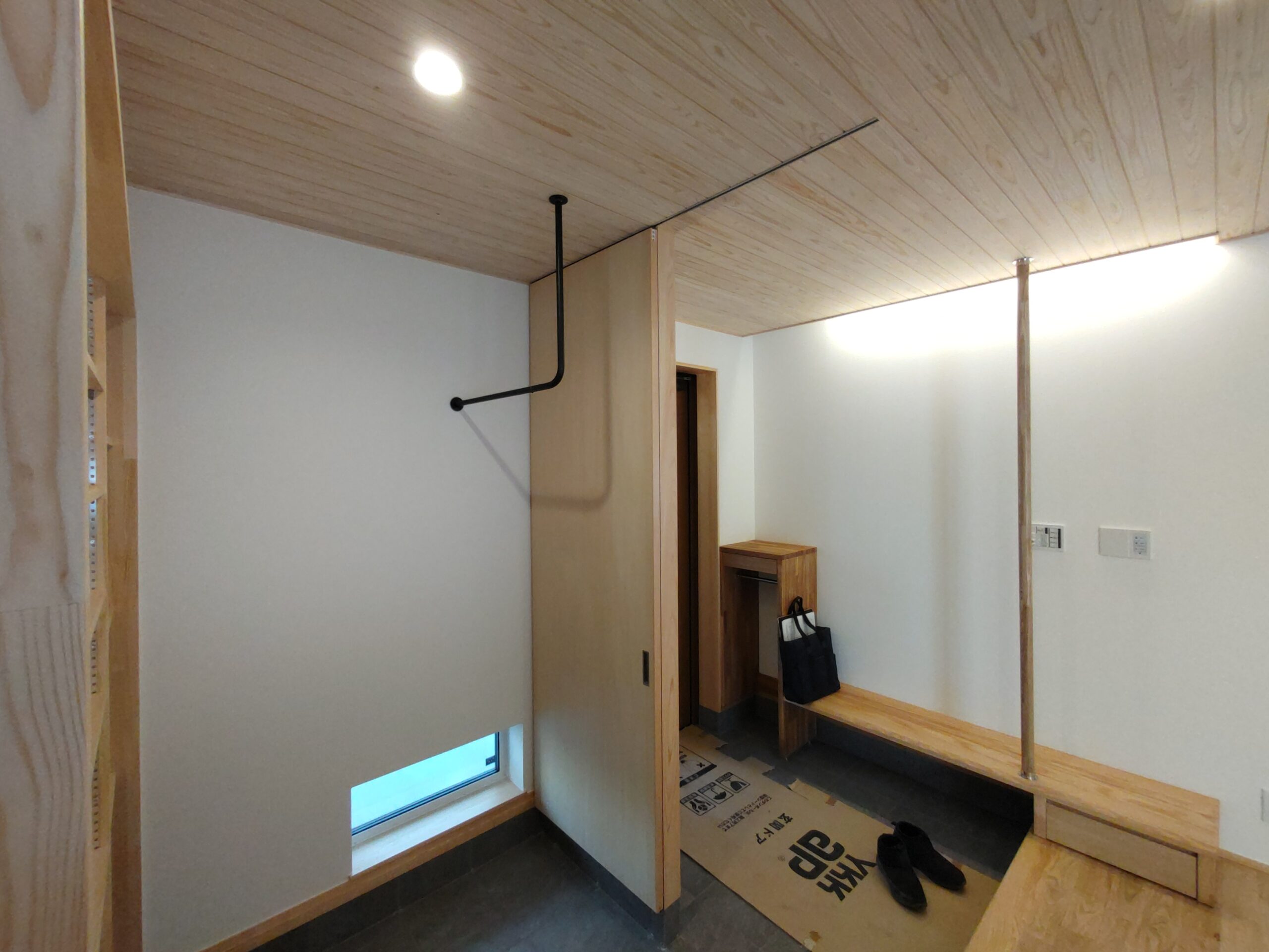玄関と玄関収納を間仕切る建具。開けた時に開放感を得るために吊戸として方立てを無くする事にしてみました。