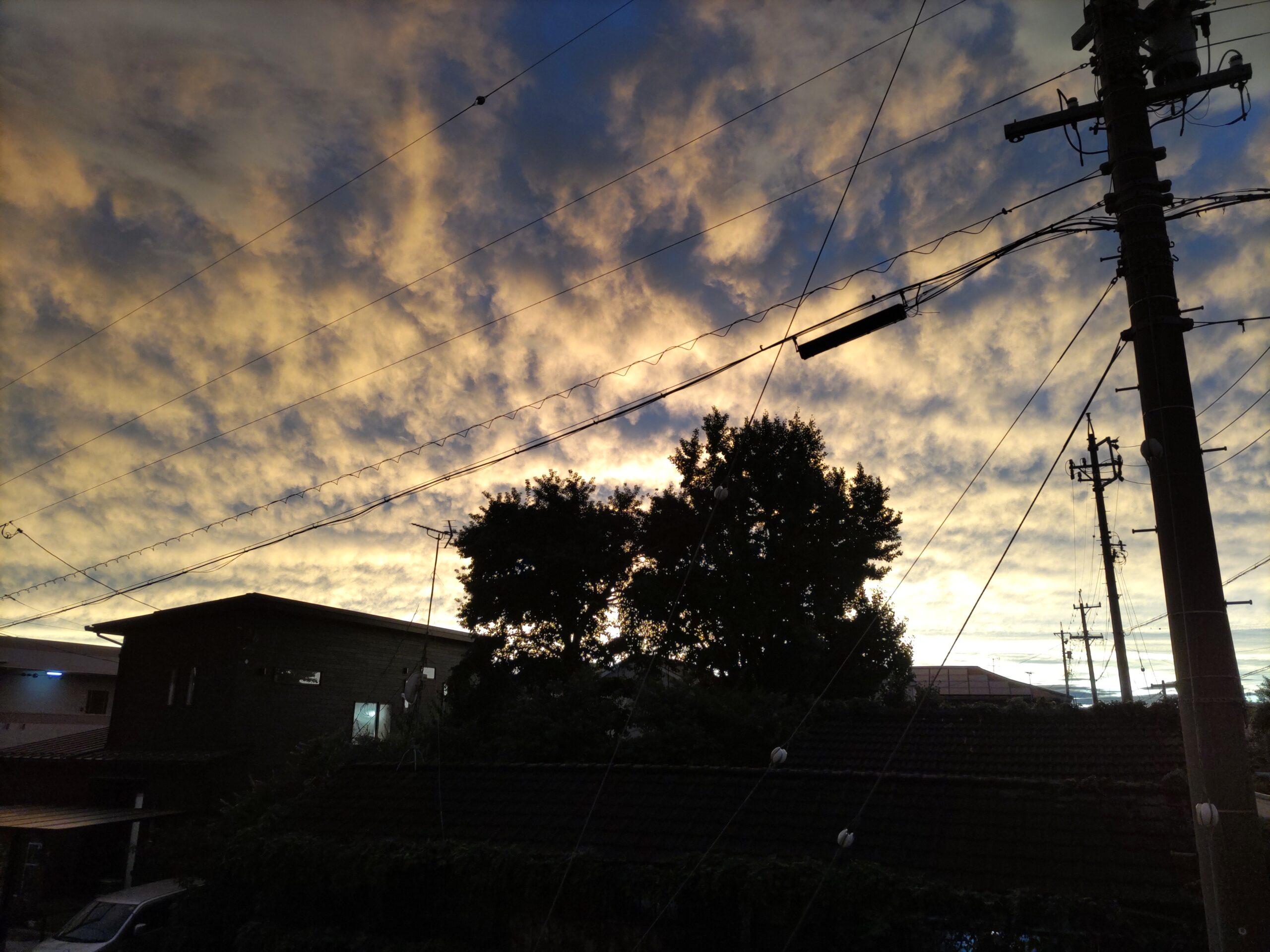 ただいま台風10号が接近中、と思いきやニュースによれば温帯低気圧に変わりつつある今日この頃の夕方の情景。雲に乱反射する夕日が逆光になって幻想的です。なんだか恐怖の大魔王でも降りてきそうな感じです。