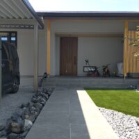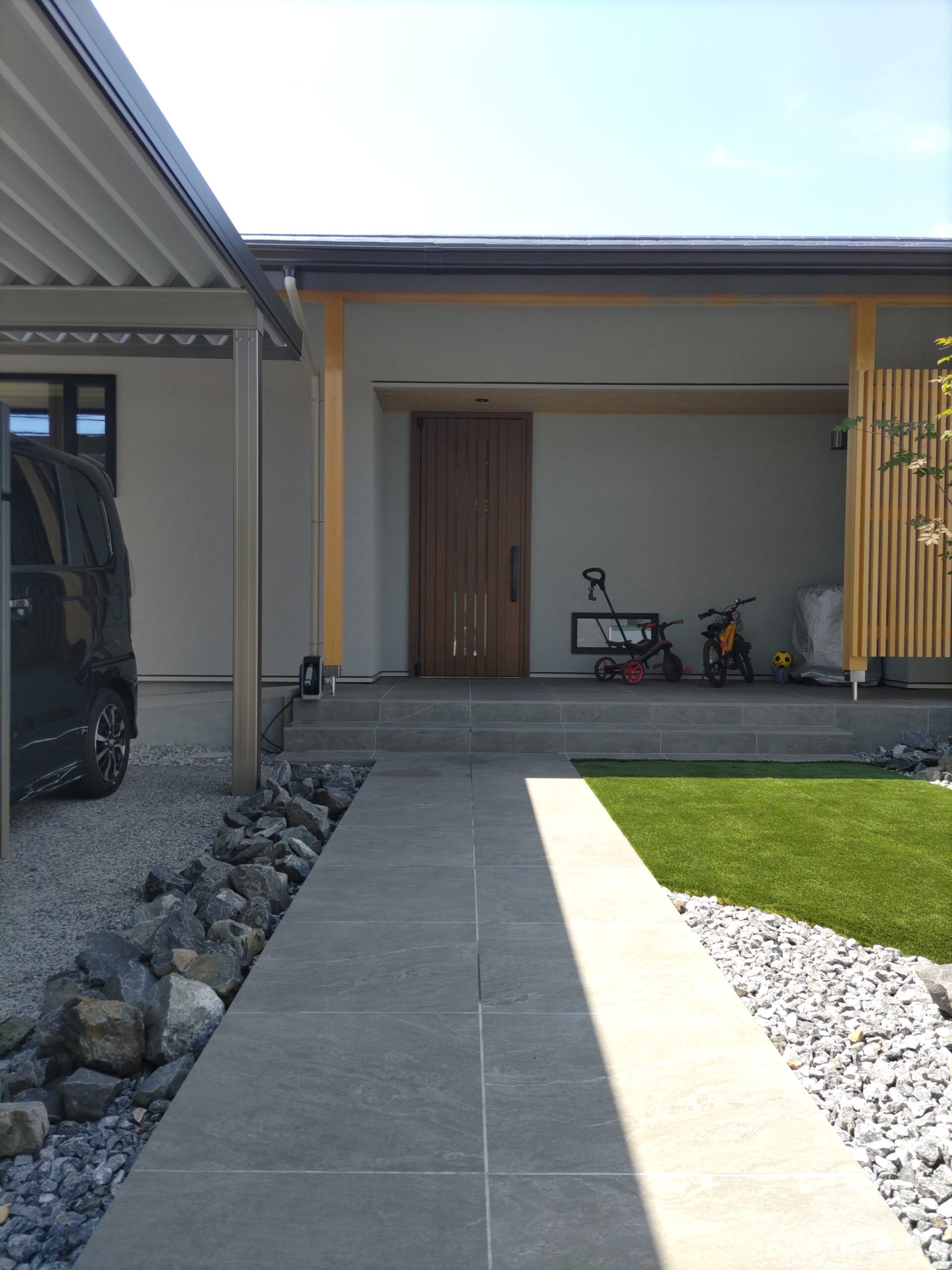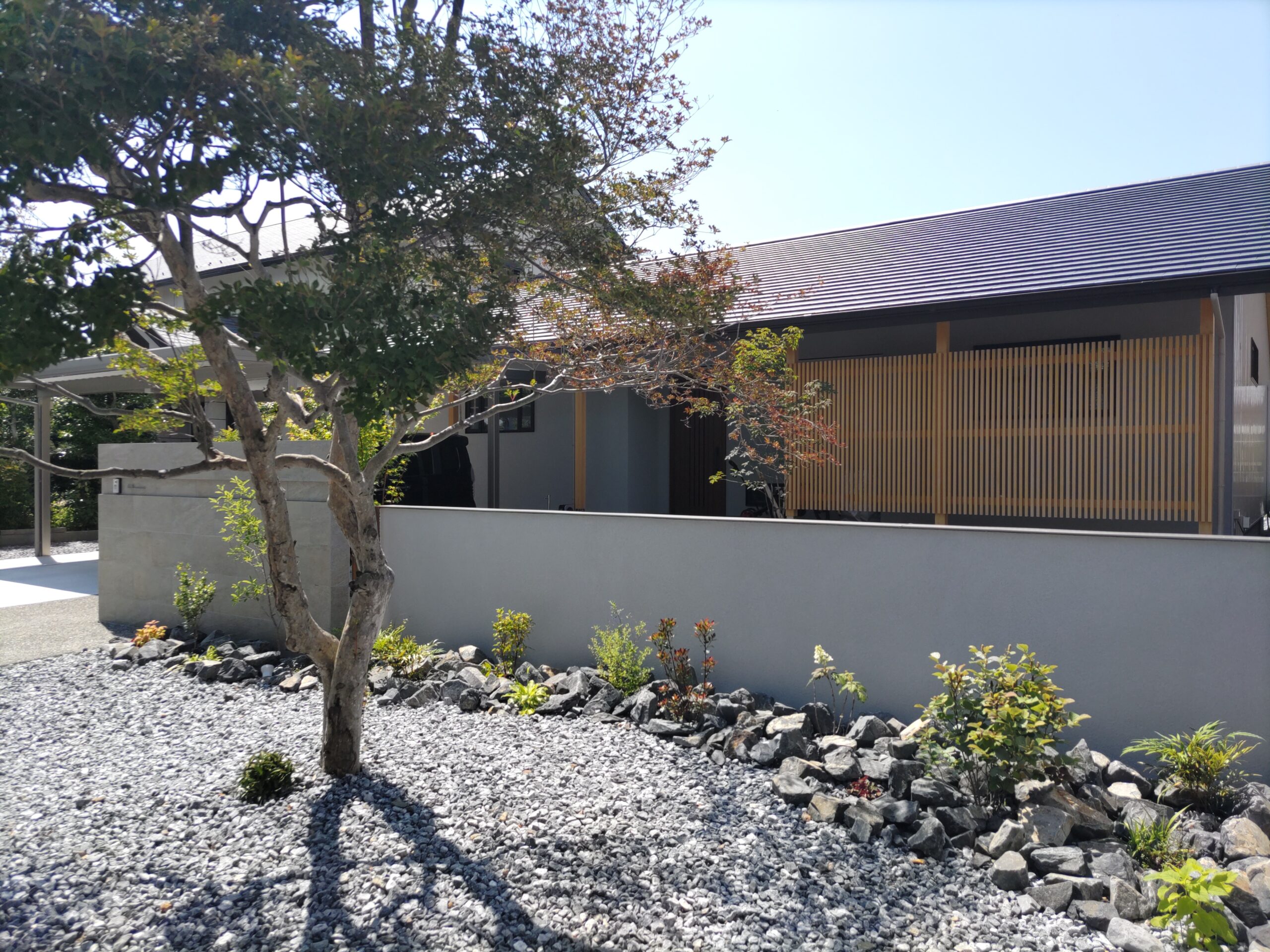 外構工事もすっかり完了していました。砂利と割栗石を絶妙に配置した、シンプルながら奥行きのあるアプローチ、塀が印象的な仕上がりです。
