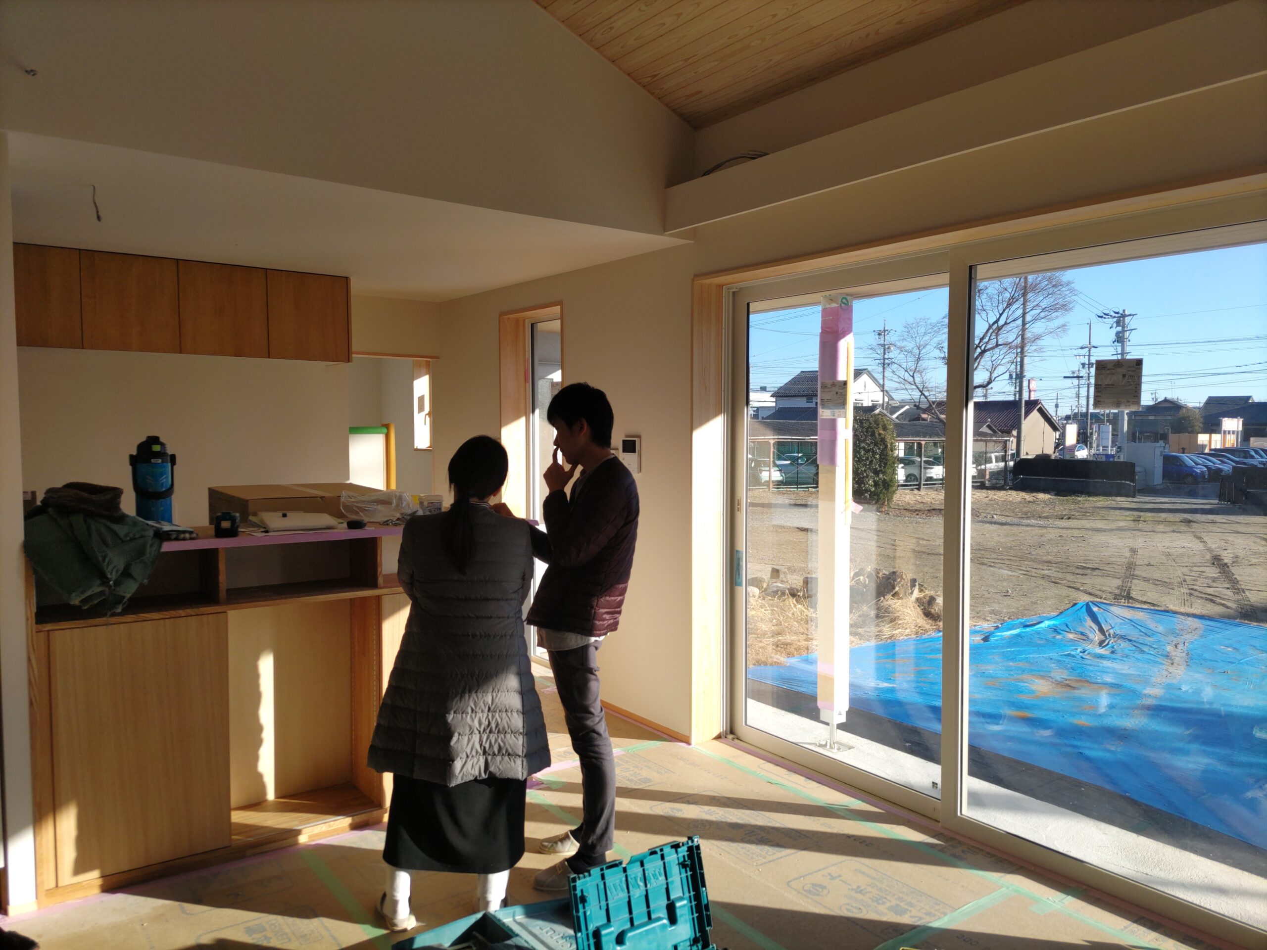 現場内で、収まりや設備を思案されるf様。工事も完成に近づき、お打ち合わせで決める内容も大詰めを迎えてきています。
