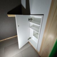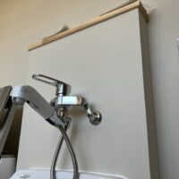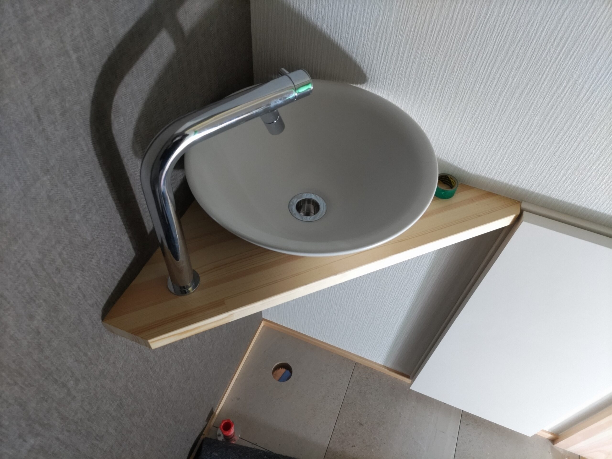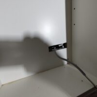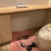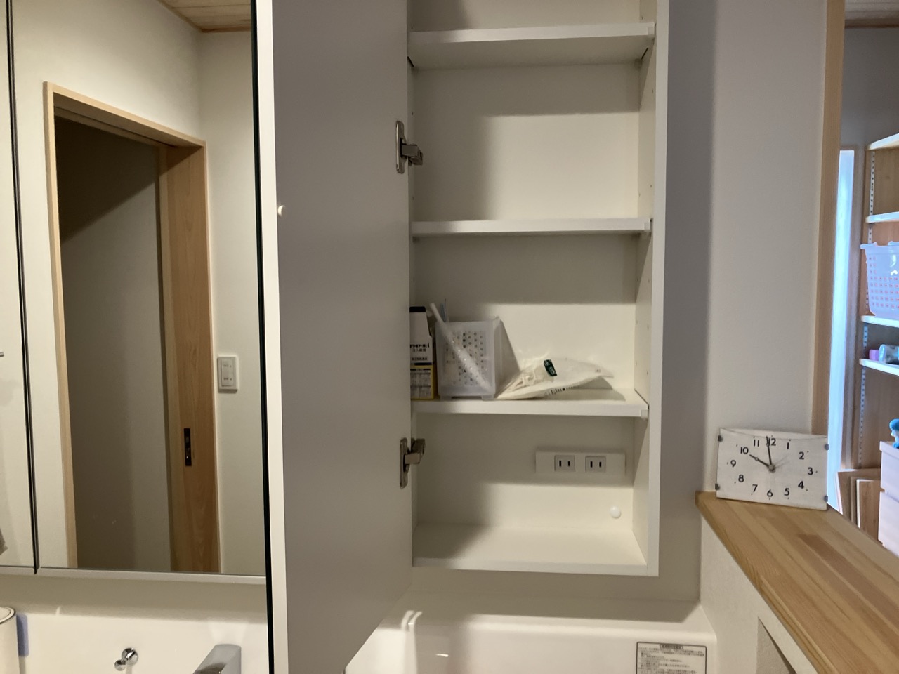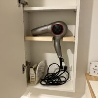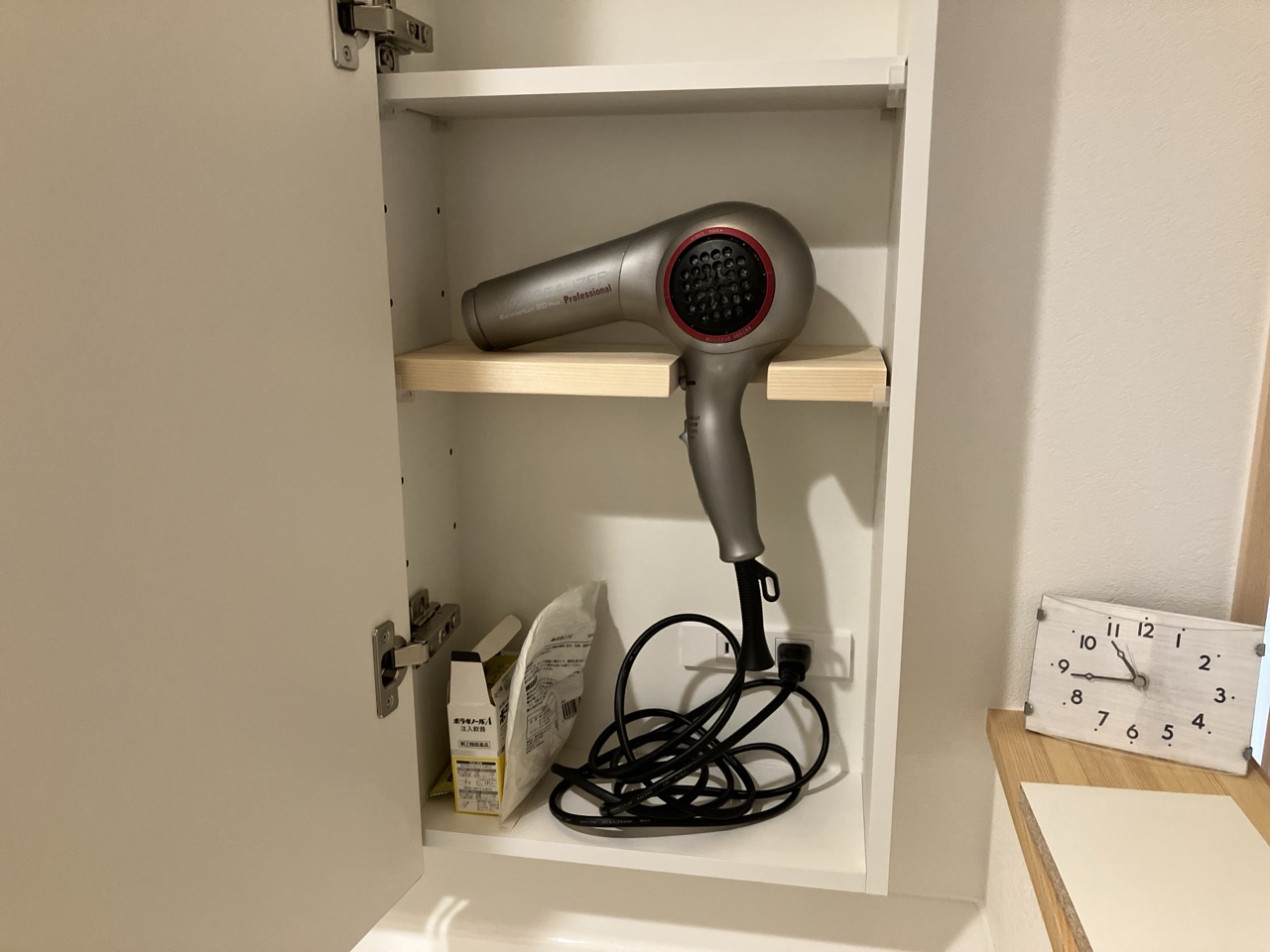 ミラーボックスの一部を切り欠いてドライヤーを引掛けるように加工できないか、とのご希望を聞きました。ボックスはパーティクルボードという素材でできており、切り欠いた場合切断面からボロボロになっていく事が予想されます。そこでキャビネットではなく棚板を改造する事にしました。他の部屋でも棚に使われている赤松積層材を切欠き、キャビネット内にコードもまとめて収納できる棚板を作成しました。こういう時に道具を持ち歩いていると非常に便利です。