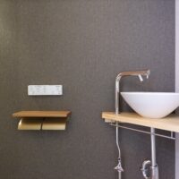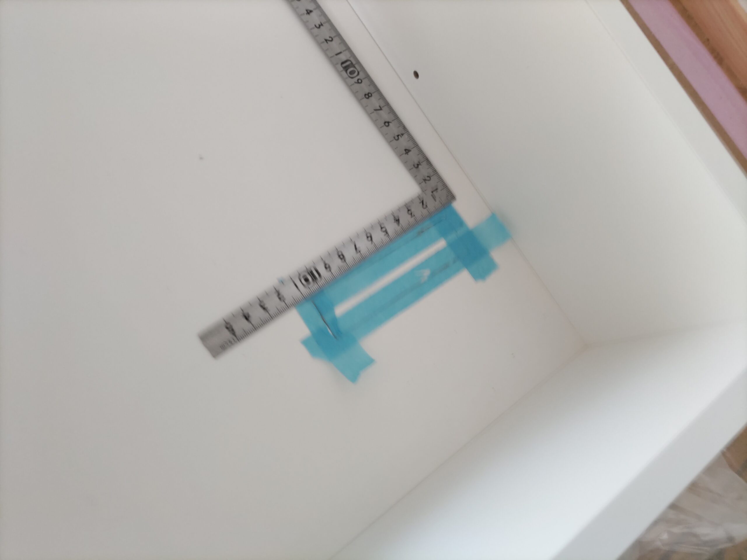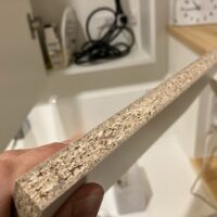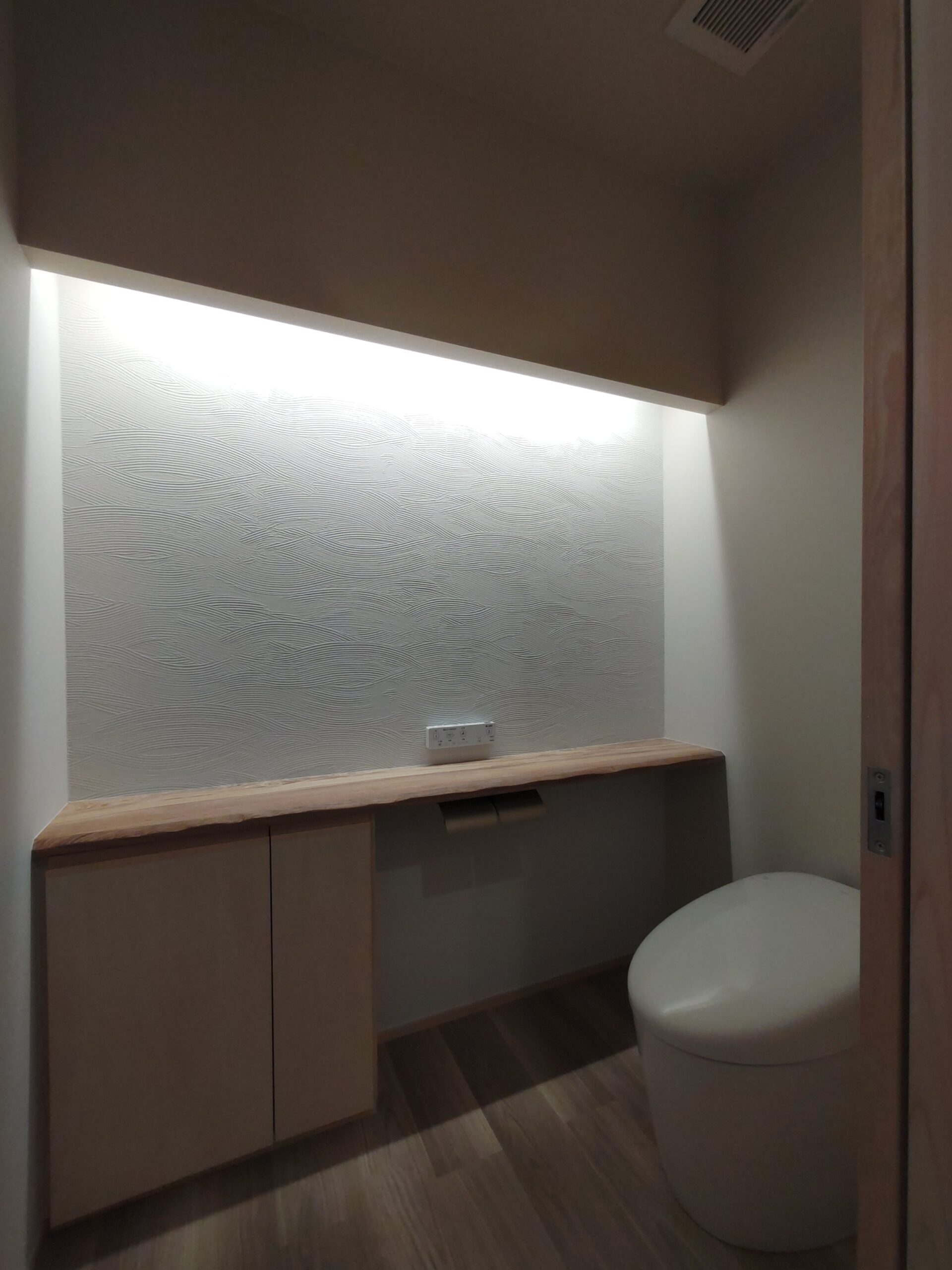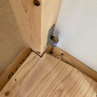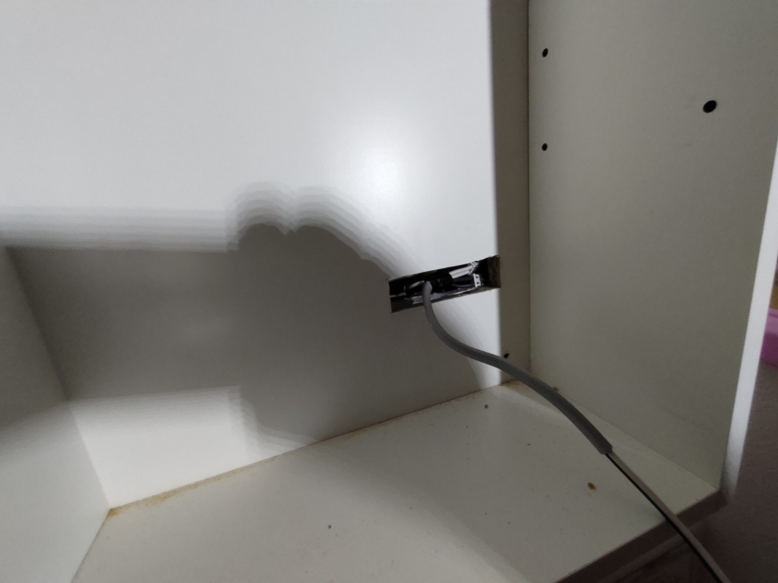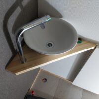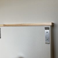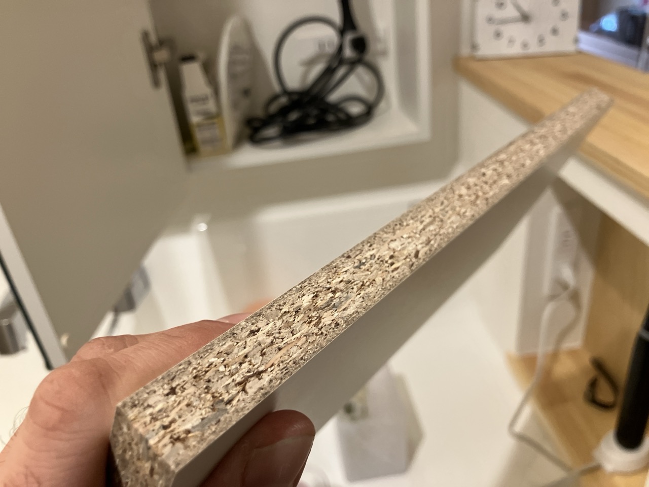 ミラーボックスの一部を切り欠いてドライヤーを引掛けるように加工できないか、とのご希望を聞きました。ボックスはパーティクルボードという素材でできており、切り欠いた場合切断面からボロボロになっていく事が予想されます。そこでキャビネットではなく棚板を改造する事にしました。他の部屋でも棚に使われている赤松積層材を切欠き、キャビネット内にコードもまとめて収納できる棚板を作成しました。こういう時に道具を持ち歩いていると非常に便利です。