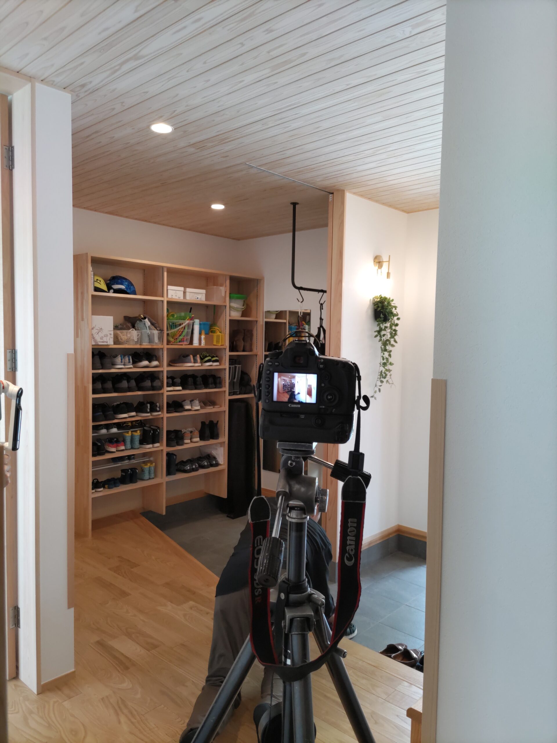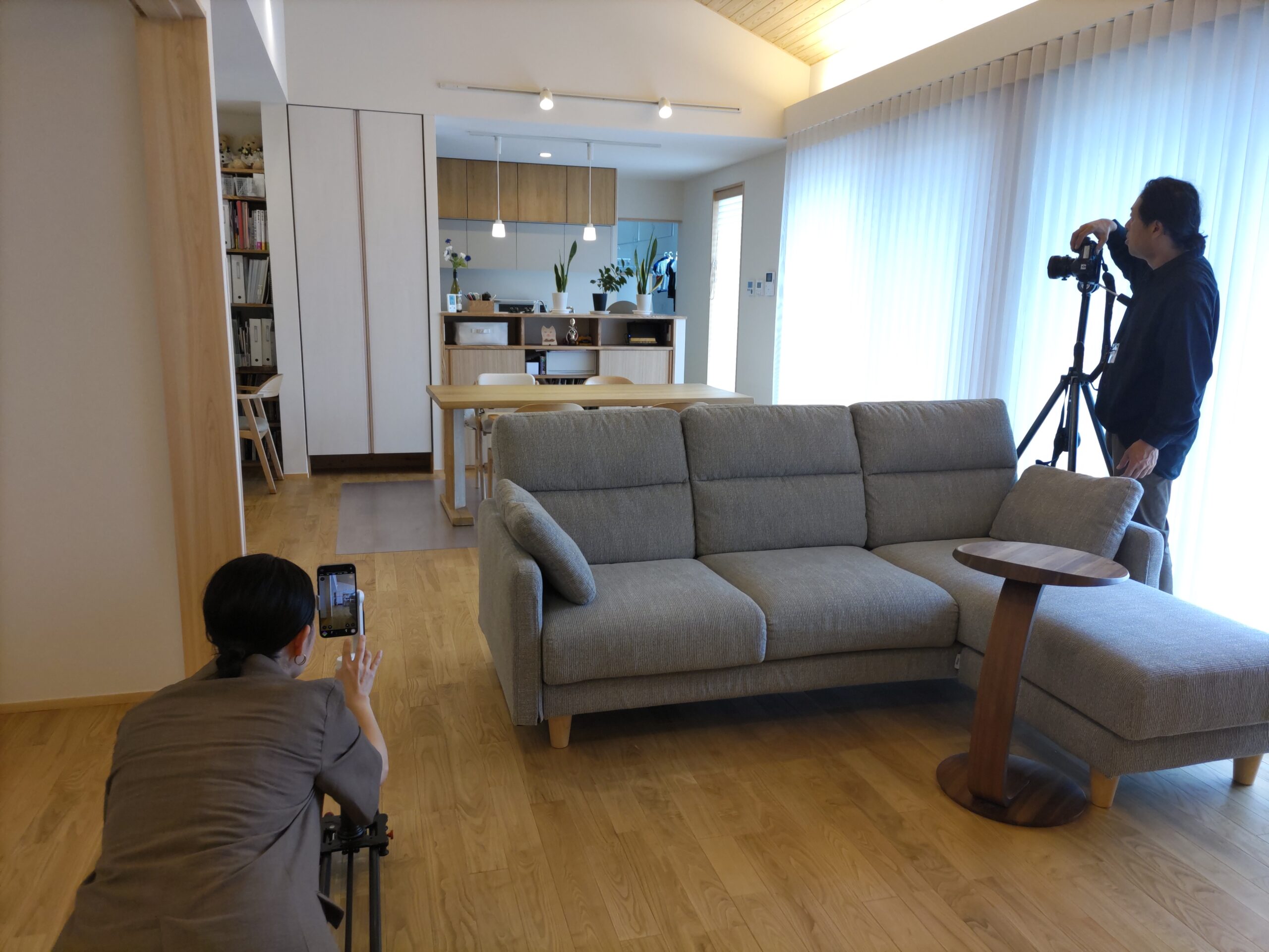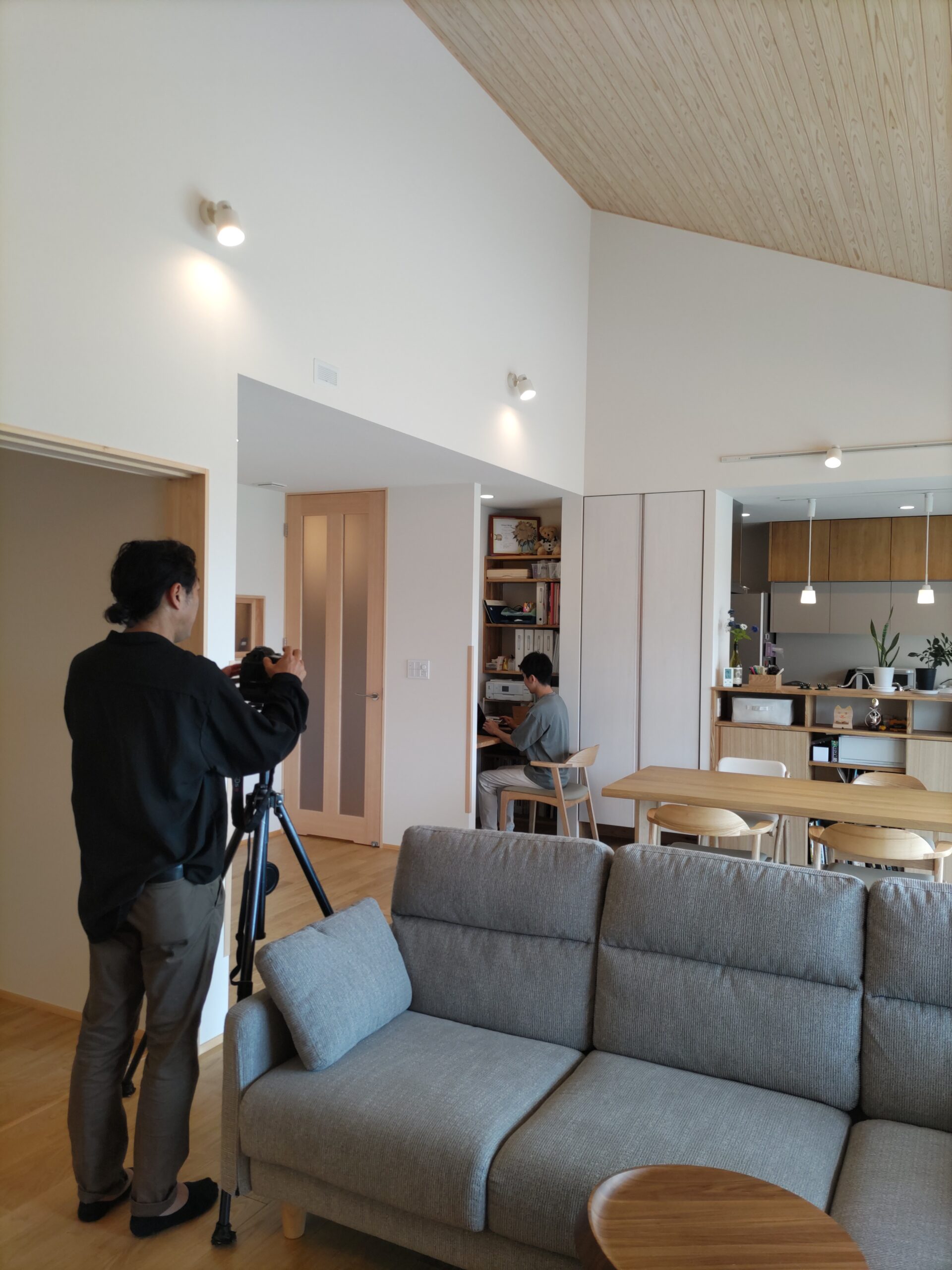 先日から続いているOB様宅撮影シリーズ。本日は本年春に竣工お引き渡ししたばかりのf様邸にお邪魔しました。過去の2例は2階建て住宅でしたが、f様邸は平屋建て住宅のため、また少し毛色の違うテイストの撮影内容となります。おなじみになりました動画担当、写真担当の取材陣とともに撮影に臨みます。