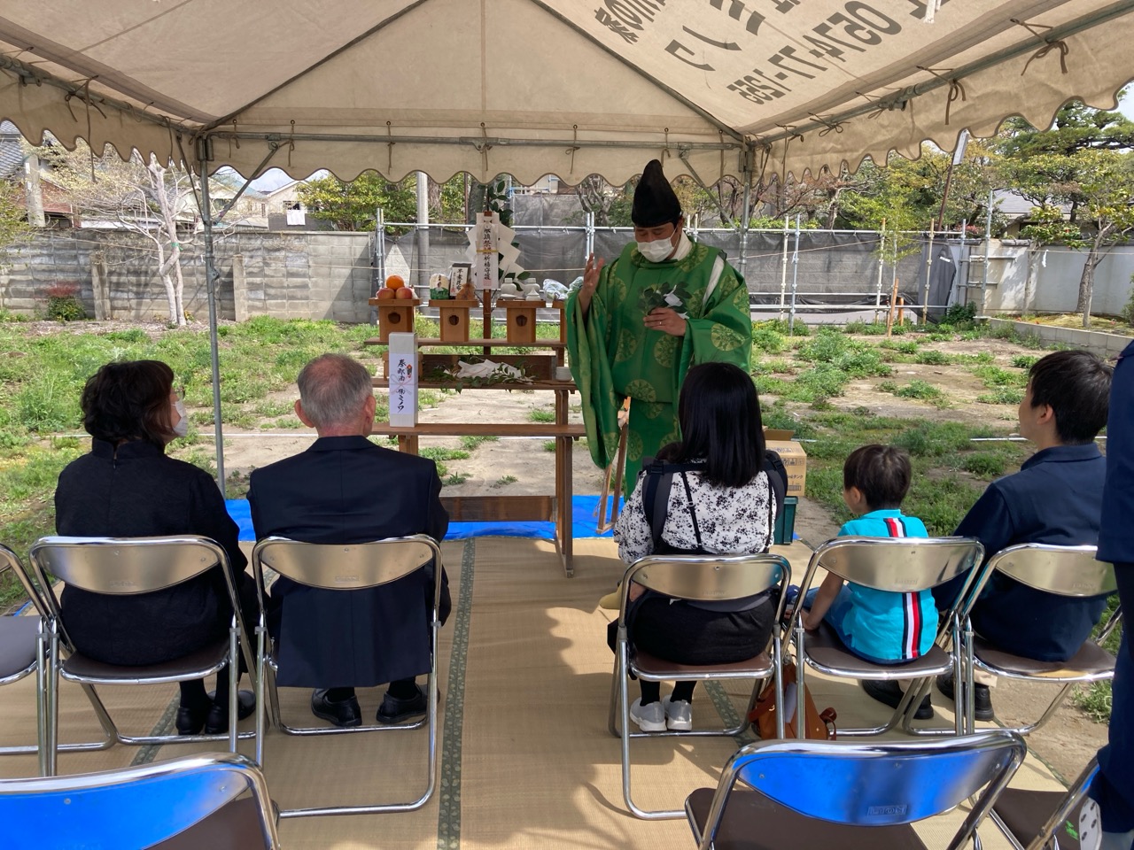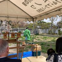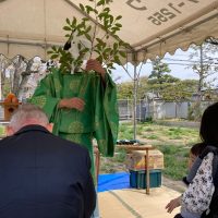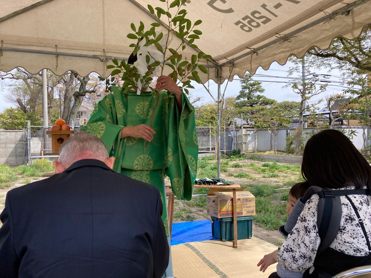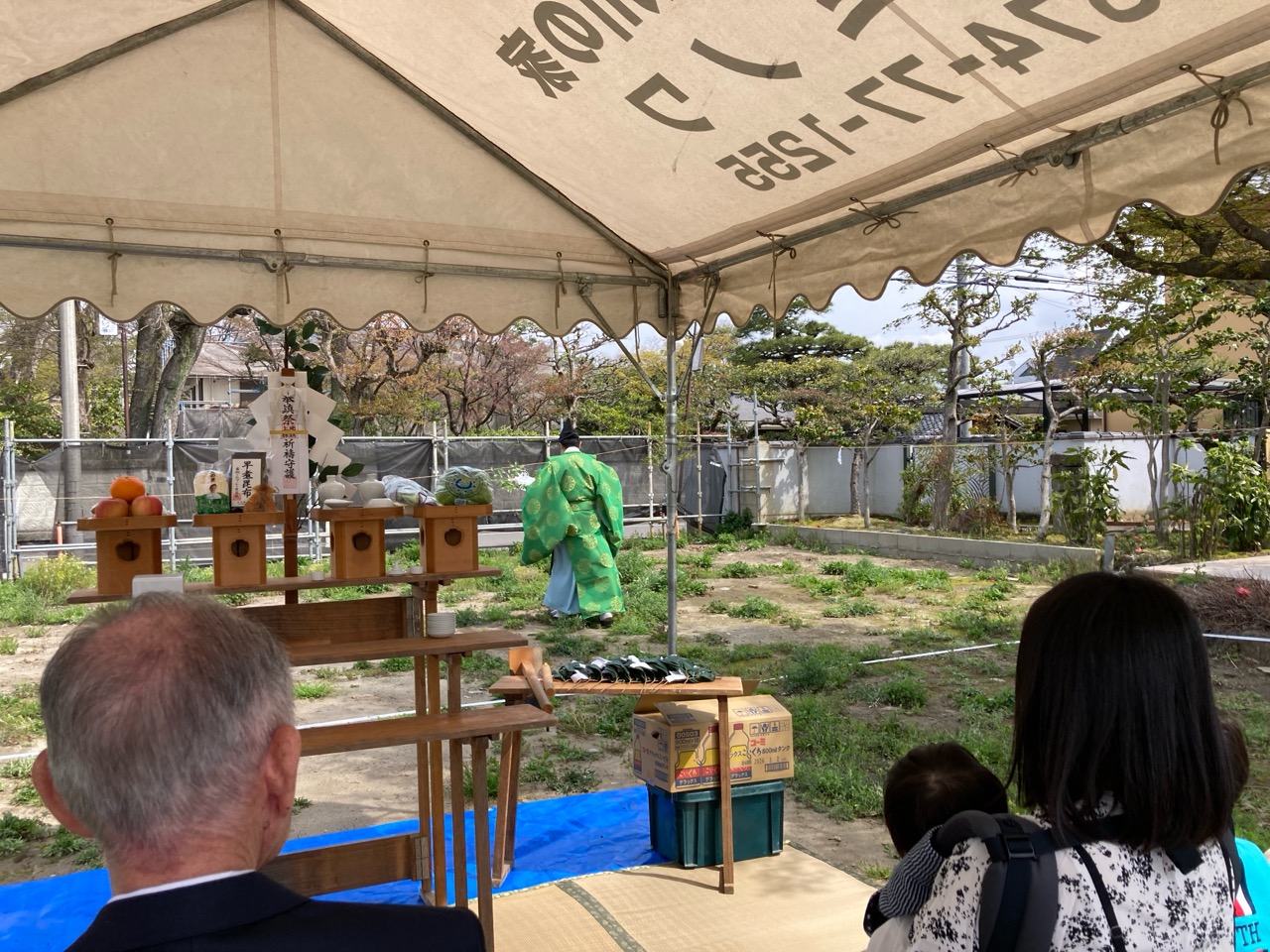 体感の気温だけで言えばもはや初夏と言っても過言ではない本日、地鎮祭が執り行われました。h君も半袖シャツで参加。初めて見る神事に興味津々です。
