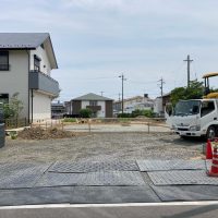 鉄筋の配筋前の砕石敷き。旧くは割栗石などを敷き詰めて転圧し地盤面を固めていましたが、今や細かい砕石を敷いて転圧しているため、一見して遺跡の発掘現場かと思うくらい平滑に収められています。この上に防湿シートを敷いて配筋工事が進んでいきます。