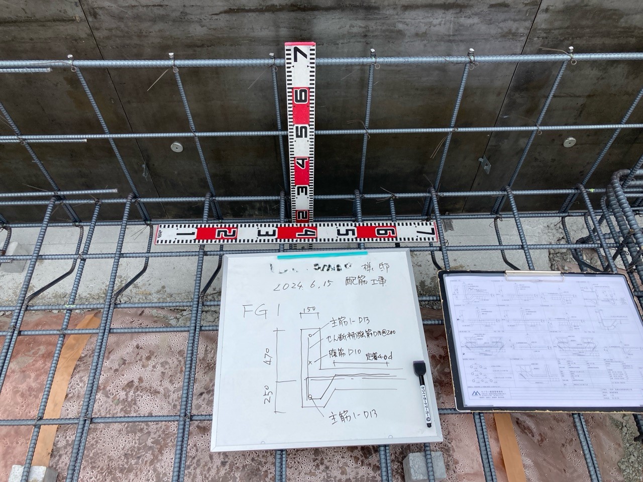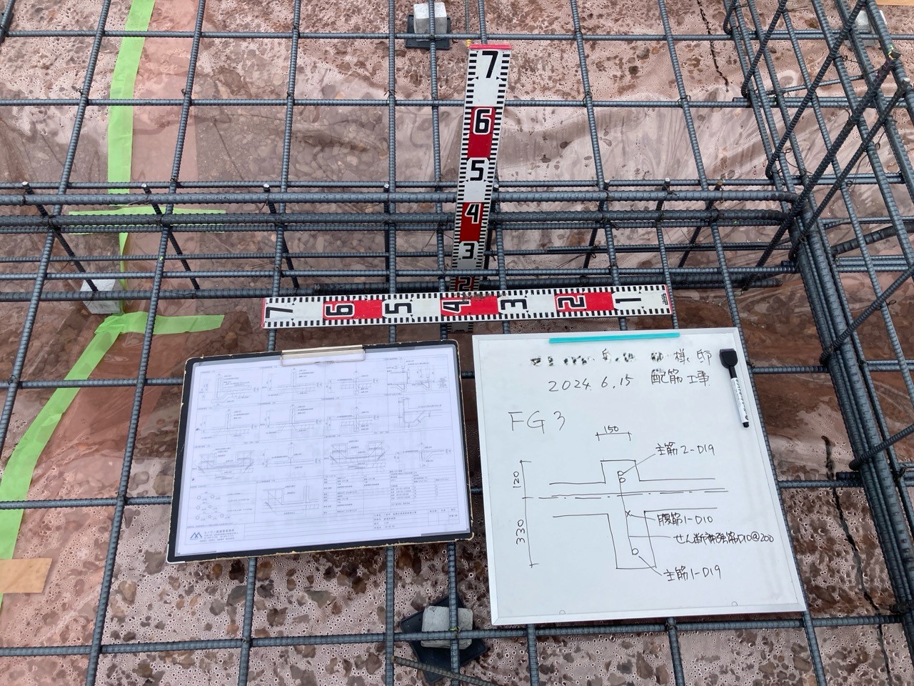基礎コンクリートの鉄筋が配置され、配筋図面通りに施工されているかの検査を行いました。保険機関の検査と工程上の社内検査との2種類が行われます。許容応力度計算によってはじき出された鉄筋の必要断面積、木造住宅の配筋の主筋にD16やD19が出てくるガチガチっぷり。マンション建築並みの鉄筋です。換気等の都合上できるだけ床下空間を広く連続させたいため、基礎梁を極力小さくするために許容応力度設計された結果です。