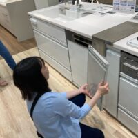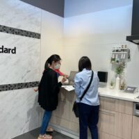 某t社のショールームに設備機器の実物を確認にやって来ました。f様としては色柄や機能も気になるところですが、一番は掃除のしやすさを重点に置き、アドバイザーと打合せを重ねていきます。t社のホーローパネルは特に油汚れを落とす事において強みがあり、また、建築基準法的には内装制限の火気使用室の課題をクリアする際に非常に重宝しています。