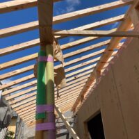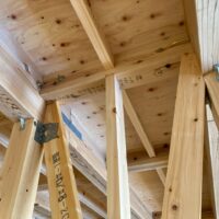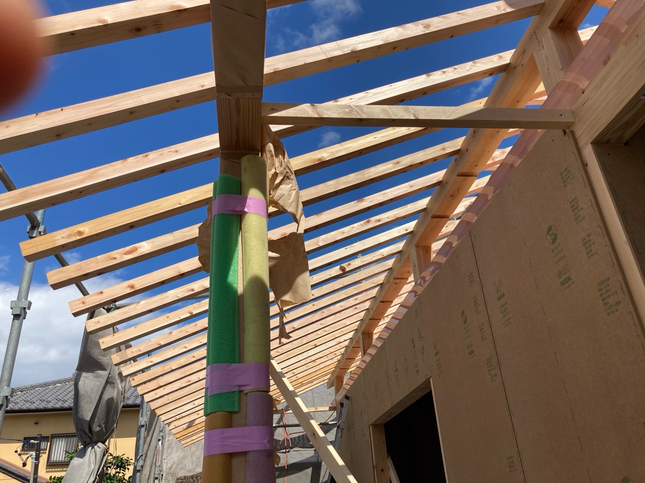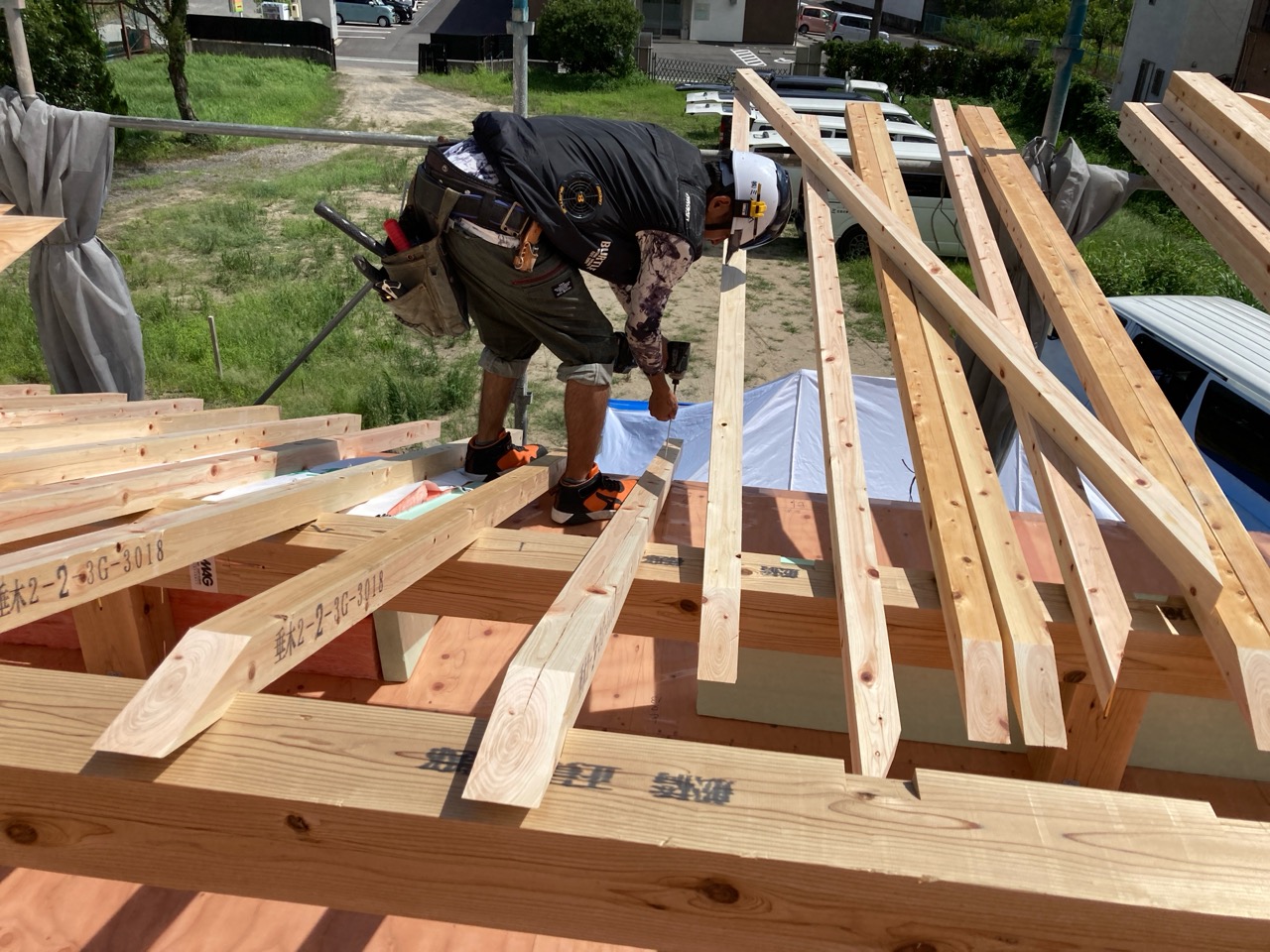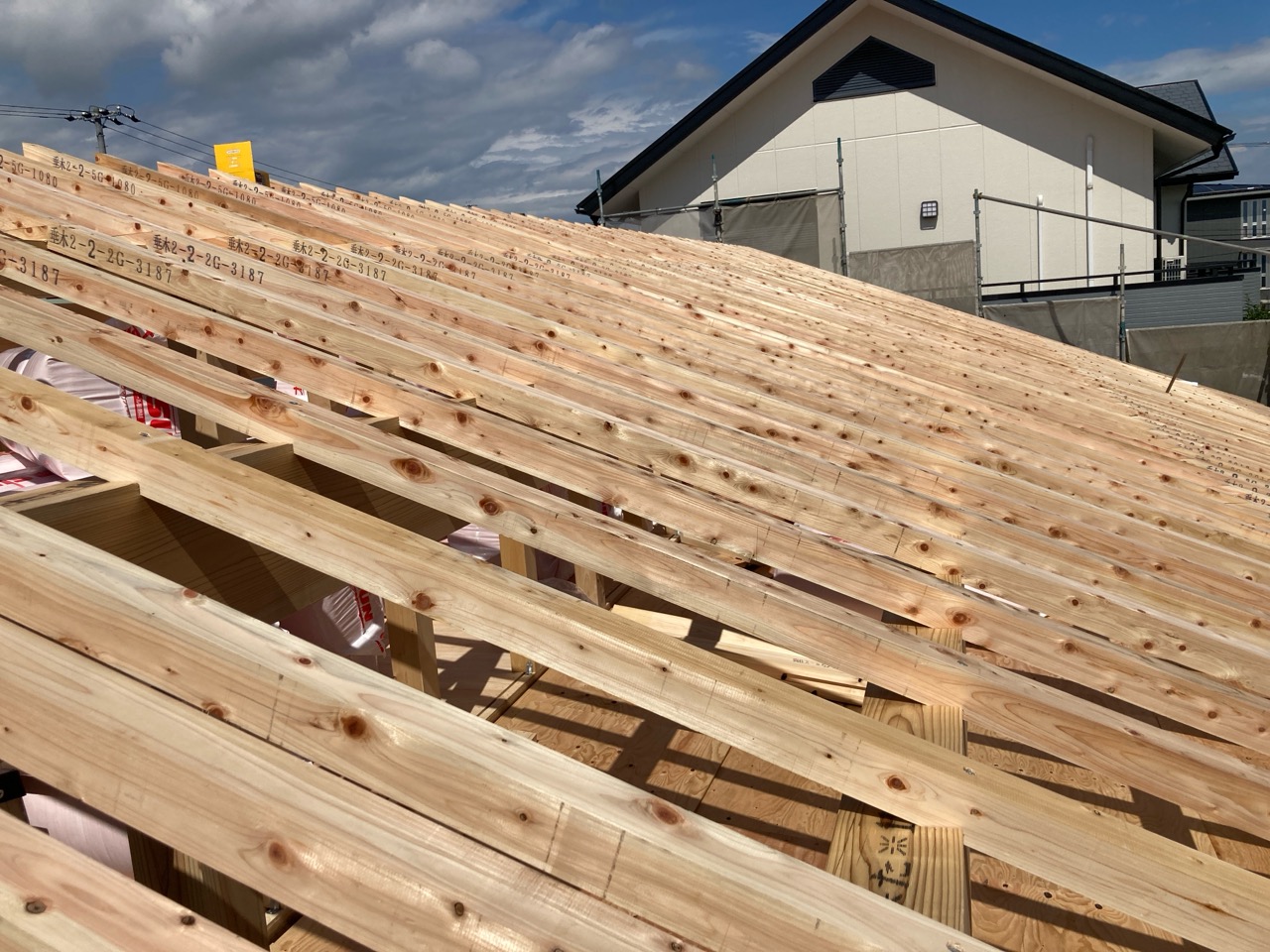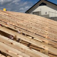 そんなこんなで屋根下地の垂木が打たれていきます。整然と並んだ材料はやはり美しい。すぐに野地の構造用合板で隠されてしまうのが惜しいところです。