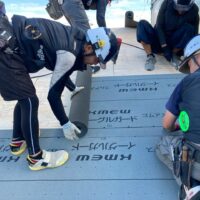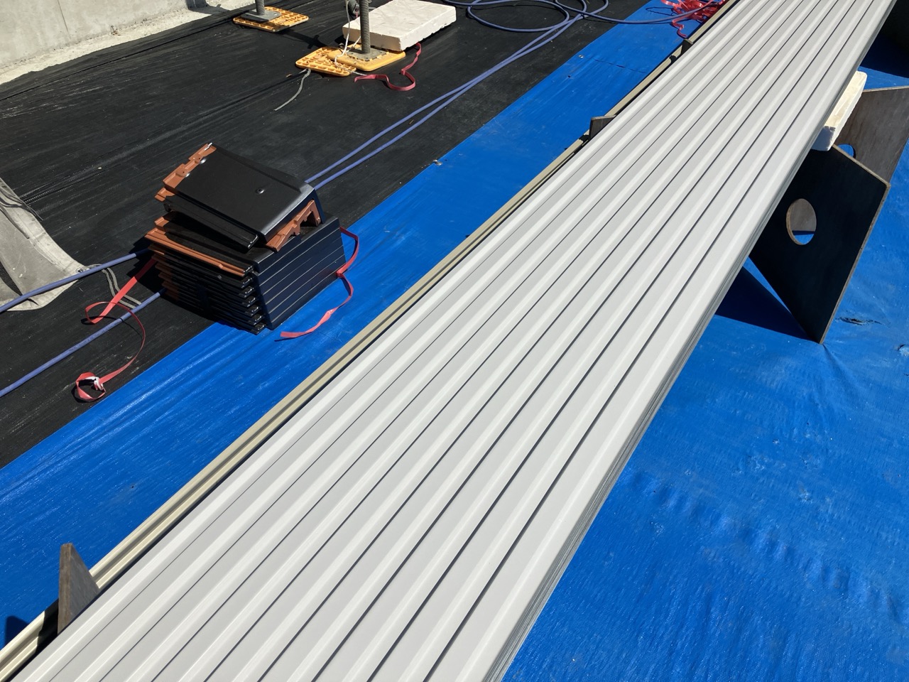本日は午前中は曇り空で割合に涼しかったのですが、狙ったかのように昼から陽射しが出てきました。周囲に聳える建物無く、遮る日影の無い灼熱の小屋上。それでも時折風が吹き皆口々に『昨日よりは涼しくて良いな』もはや温熱の感覚が完全にマヒしたタフな職人軍団。撮影をしているだけの筆者の方がフラフラになってきました。