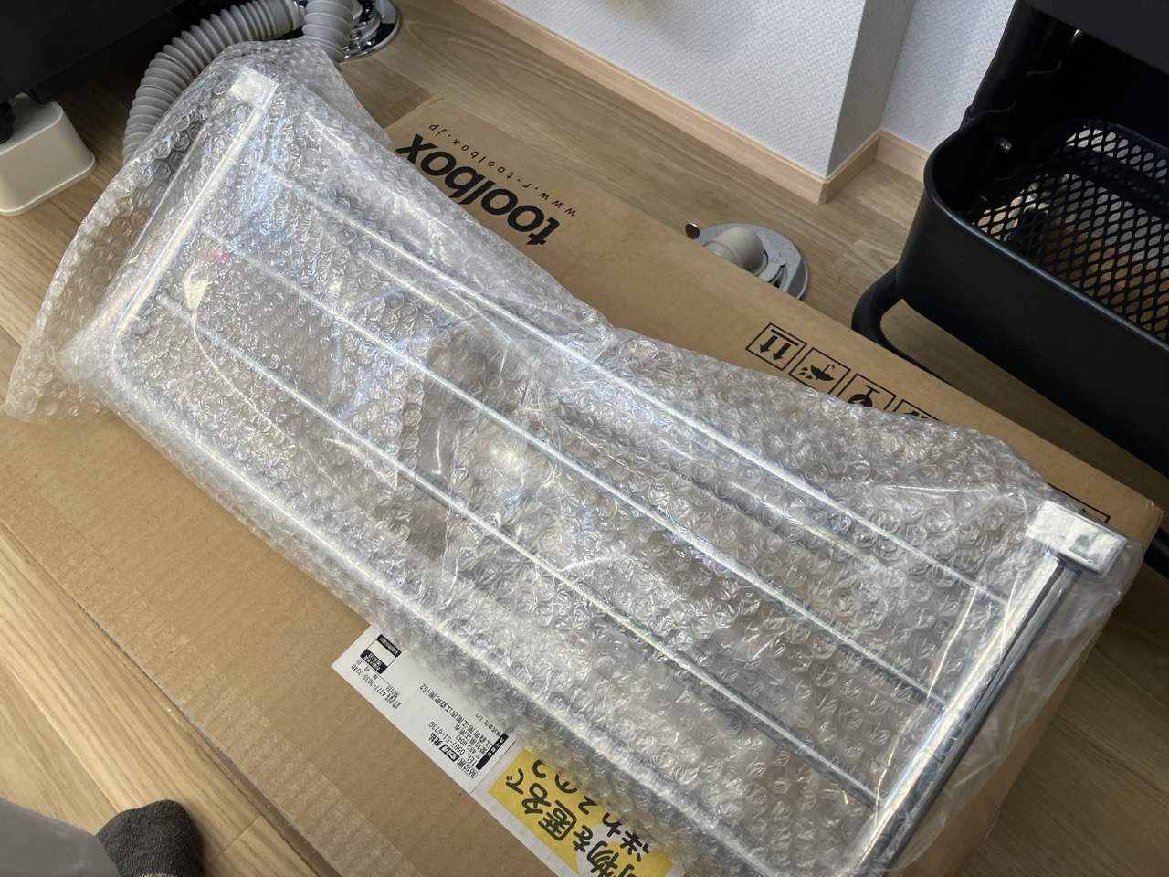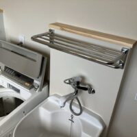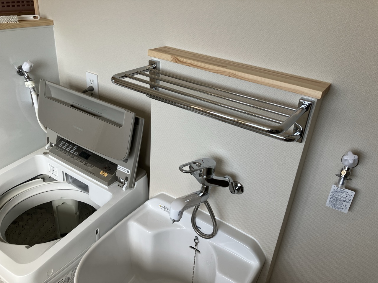 メーカー欠品中につき、お引渡し時には取付が間に合わなかった部品を取付けにうかがいました。ランドリー室のシンク上部に取付けるタオル掛け付きシェルフです。少しだけ下洗いした物や、その他濡れたものなど仮置きして置く場合に便利です。