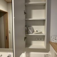 年始の現場が始動しています。洗面台、トイレ等の各設備の器具付け工事が進んでいます。洗面台はミラーキャビネットの中にコンセントを仕込みたい、との事ですが、洗濯されたキャビネットはコンセントの無いタイプ。そこで現場にてキャビネット背面に開口をして、コンセント配線を通す事にしました。