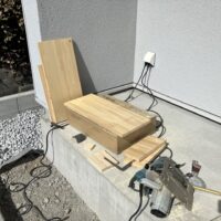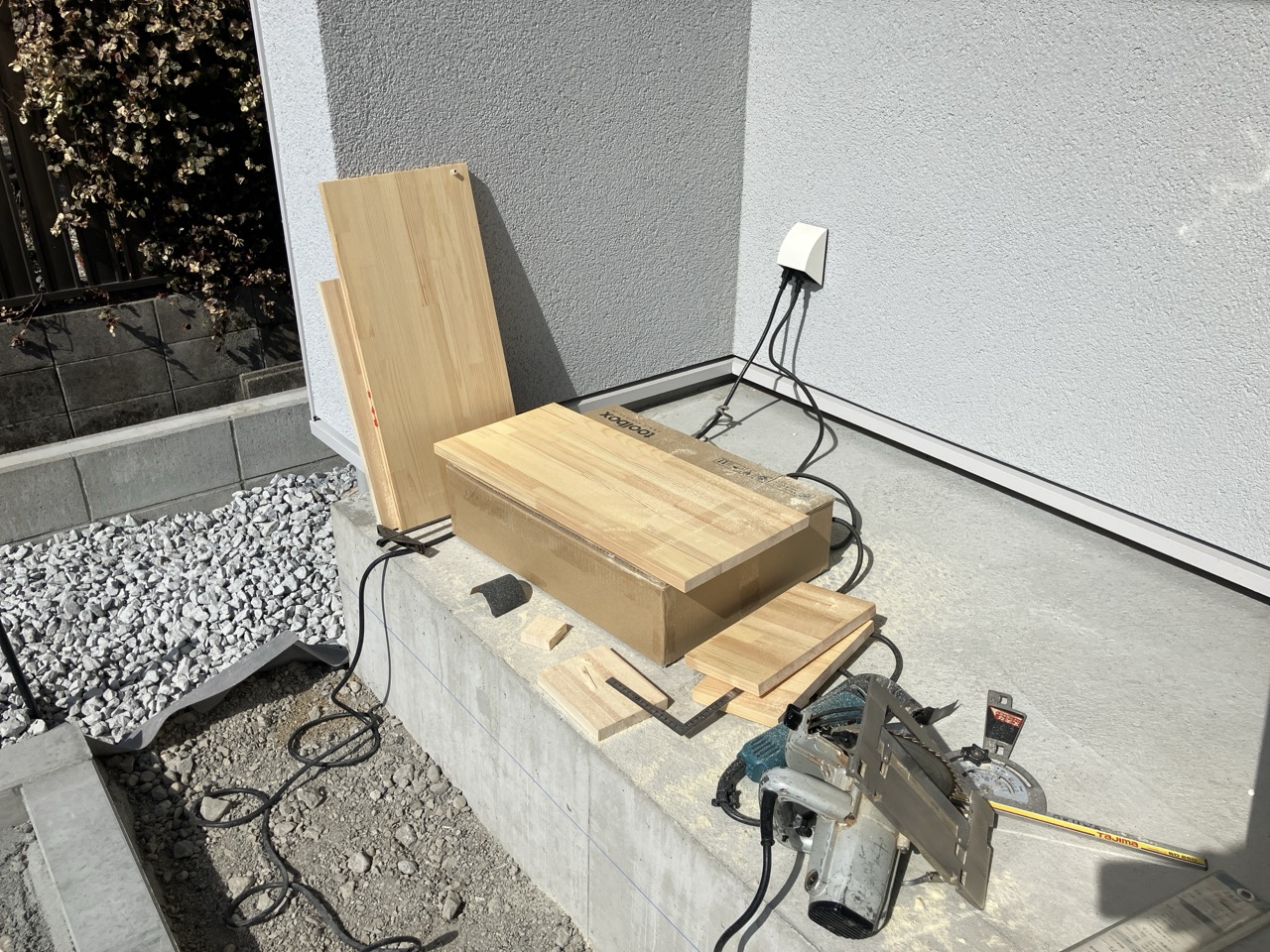 外部では現場監督s水が何やら作業中。スタディデスク周りに下地として仕込む板を加工しました。