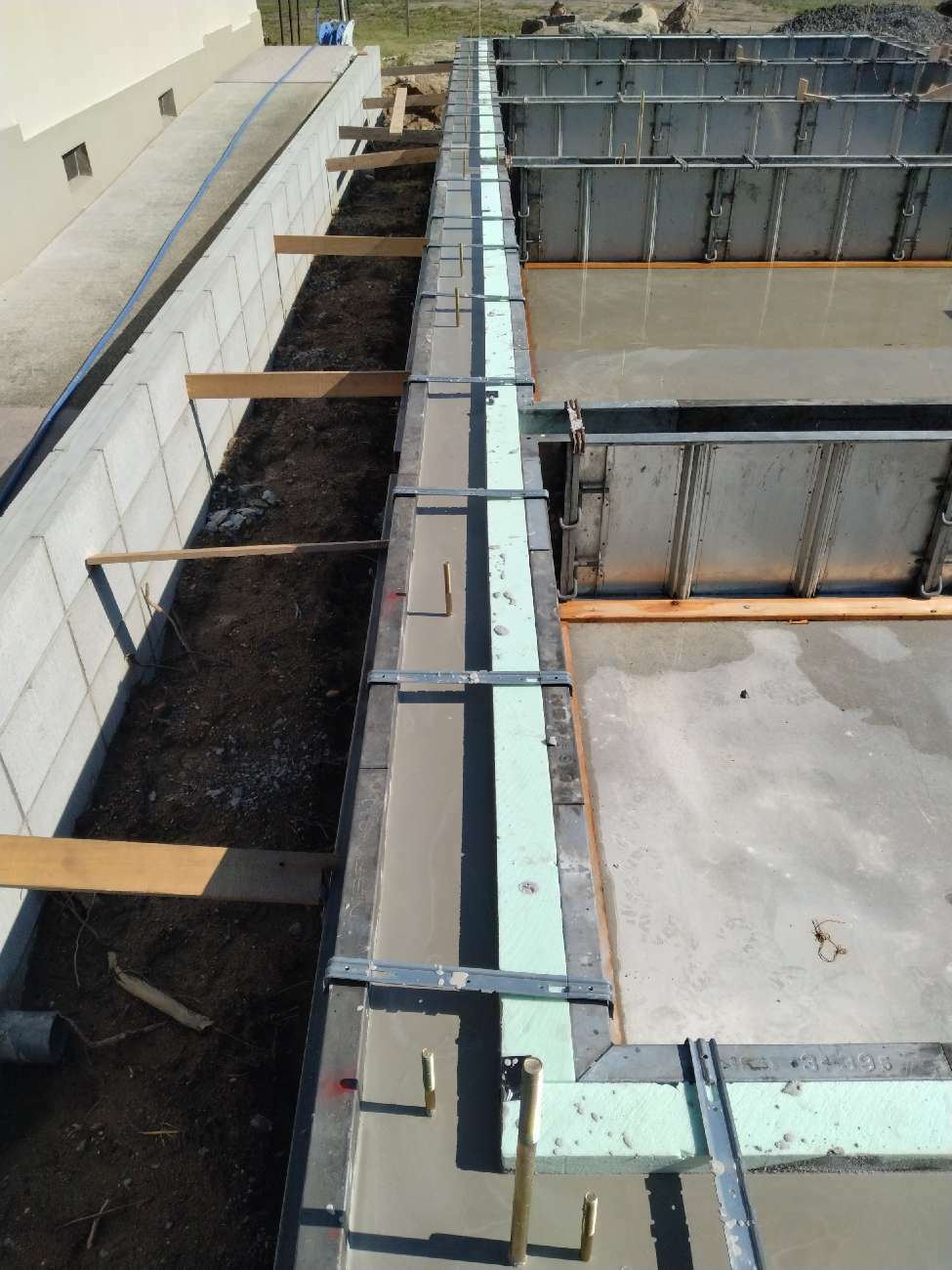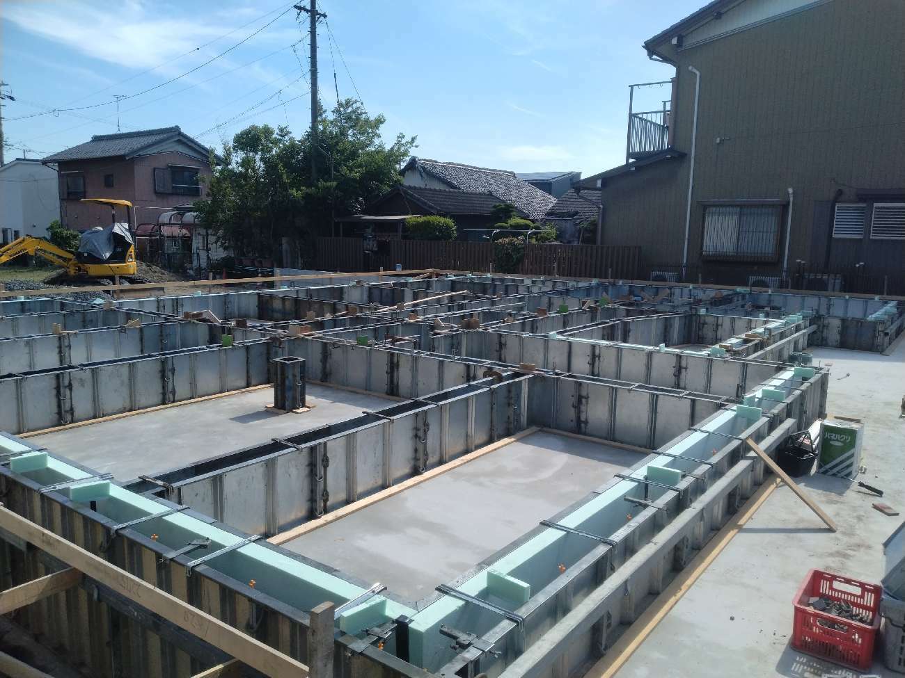 立上りの鋼製型枠組、屋内側に基礎断熱材の建込を行いました。この写真、夕方近くになると西側道路向いの建物によって日影が大きくなることが判明。温熱環境的に西日を遮るためには良い条件と見て取れます。