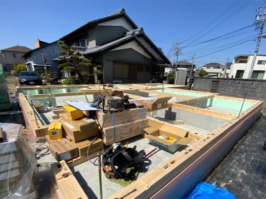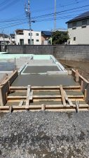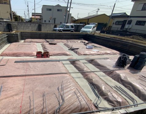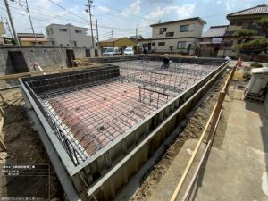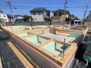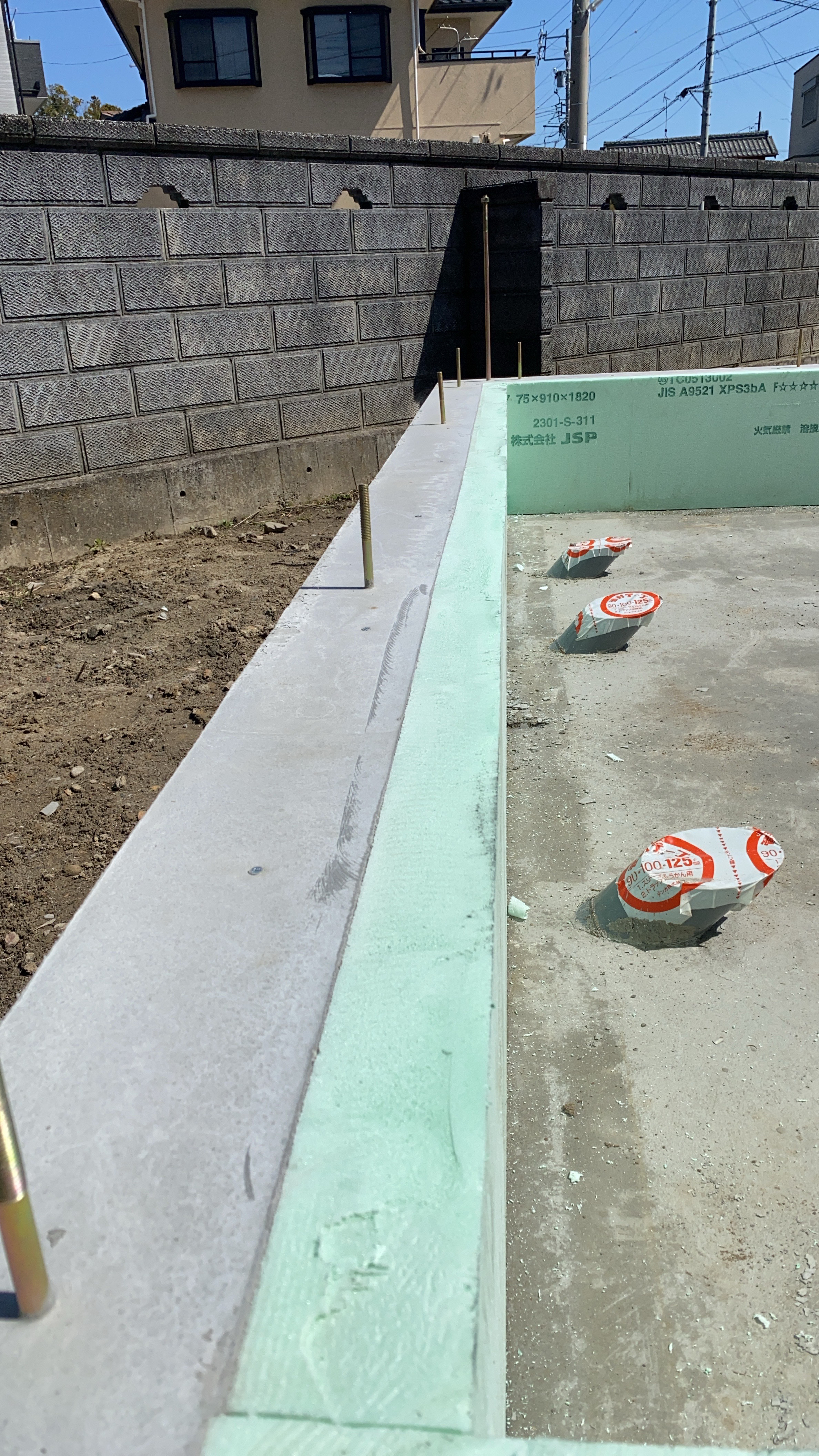配筋を行い、基礎の床(底盤)にコンクリートを打って、立ち上がり部分の型枠を組み、立ち上がり部分のコンクリートを打ちます。ミノワの場合、この床下空間も室内と空間とするため、基礎断熱(スカート断熱)を基本としていますので、立ち上がりの型枠組の際に、断熱材も一緒にセットします。床下を外部の空気で換気すると足元がヒンヤリ寒いですが、基礎断熱にすることで軽減されます👍