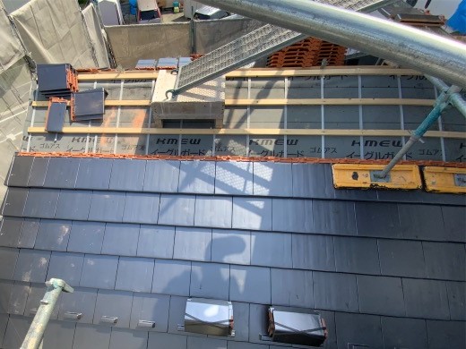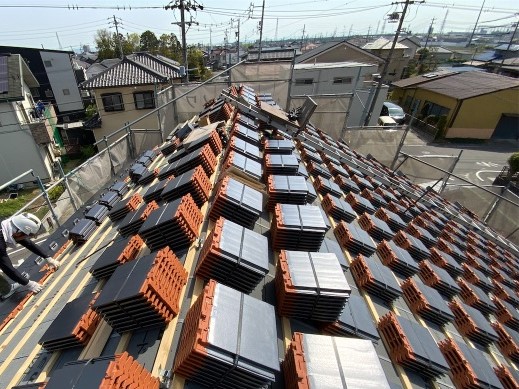 【追記4/19】外は、瓦葺き工事も行われていました。お馴染みのフラットな平板瓦です。
