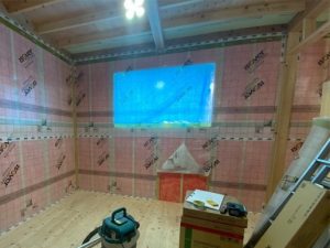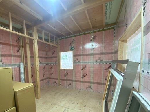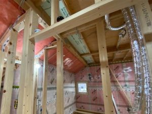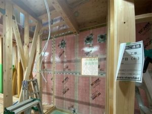 内部は、柱間の充填断熱を入れ、s井棟梁もピシーっときれいに調質気密シートを張っています。
