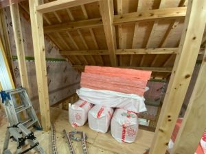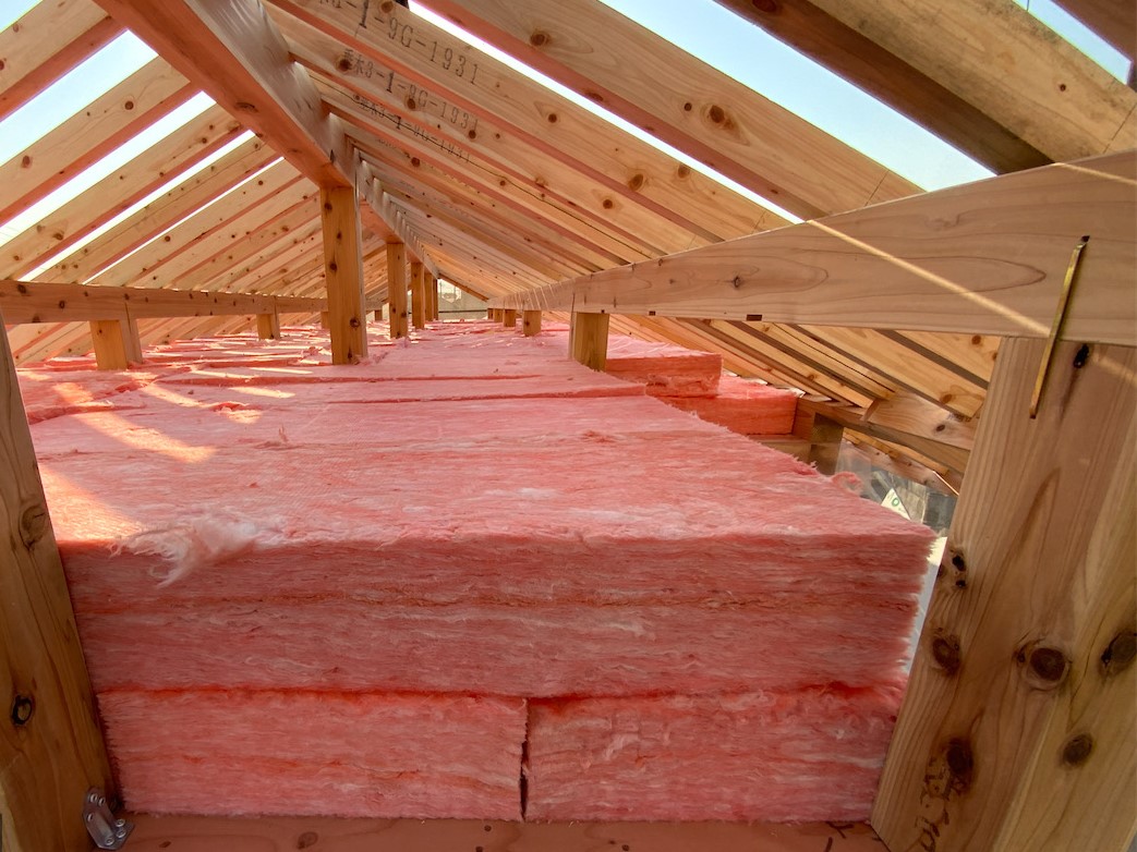 2階の小屋裏部分にも、気密シートが敷き詰められ、後から登って敷き詰めるのが大変な断熱材もこの時に施工します。ミノワの大工さんは段取りがいい(頭いい!)~と初めて見たときに、感激しました👍