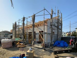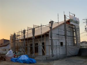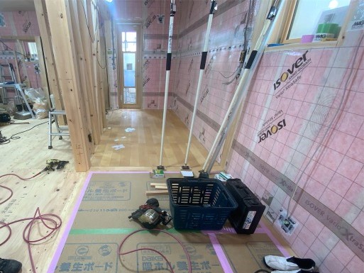 外部は、今日、付加断熱を入れ透湿防水シートを張り終わります。