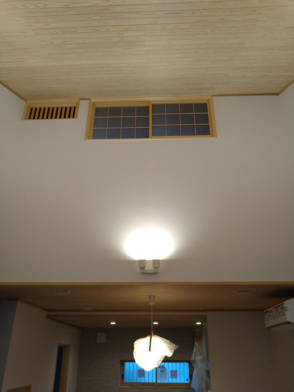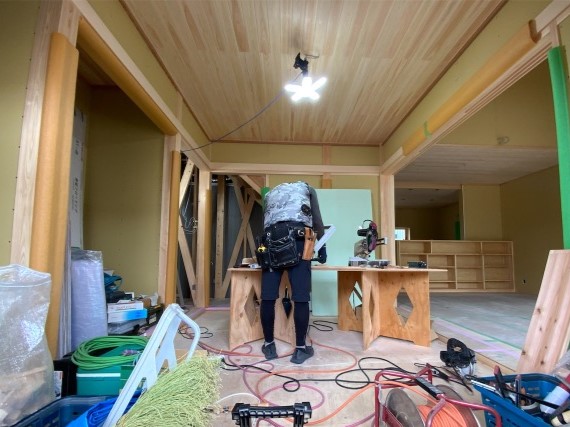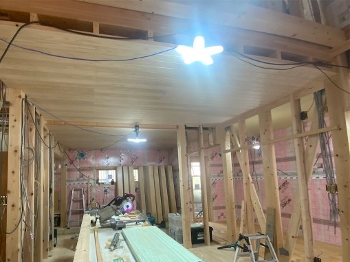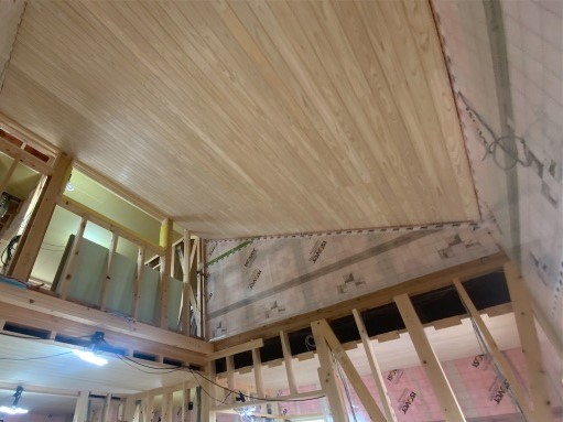 天井の羽目板を張り終えています。洋室は、杉の羽目板。今回和室は桧の羽目板です。木のいい香りがしそうです。