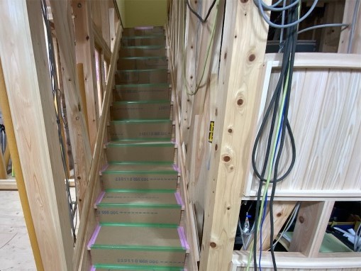 少し間が空いてしまいました💦22日の様子です。2階は内部建具の枠も取り付けられ、プラスターボードが張られてきています。2階はほぼ終わりに近づいています。階段も架け終わっています。