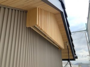 妻側には、小屋裏換気を兼ねた妻飾り(ヤギリ)が付いています。1階の屋根と2階の屋根が続いていて、一見平屋の様な外観です。玄関のある南面は吹付リシン、その他の部分はガルバリウム鋼板の仕上げです。見学会では、ミノワでよく使われる材料を大きな面積で見る事が出来ます。小さなサンプルを見ていただくだけでは、イメージが掴めないと思いますので、是非ご来場ください。見学会ご予約はこちらをクリックしてください