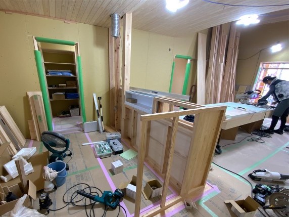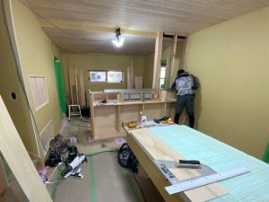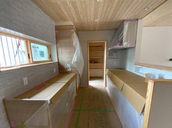お盆前にキッチンが取り付けられ、クロス工事も進んでいます。