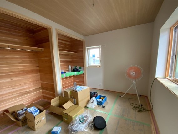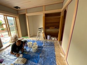 和室では、y口技研さんが珪藻土を塗っています。仕上げ工事は一気に家らしくなるので、施主様達がみられて楽しい工程です。