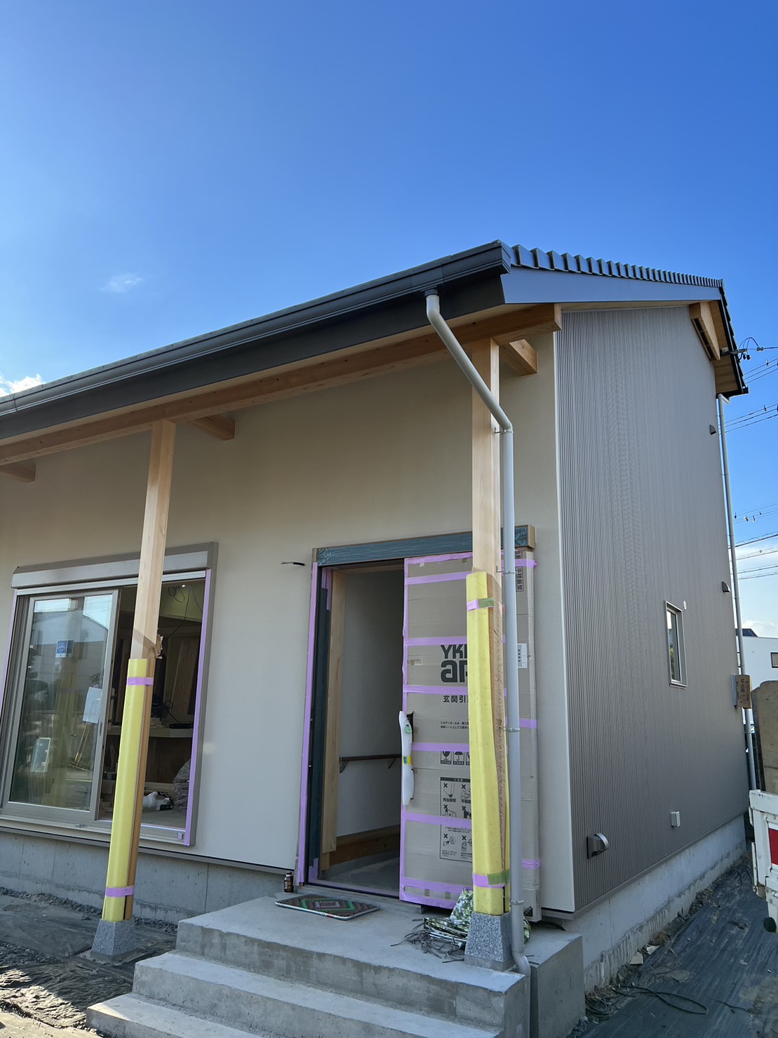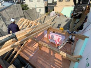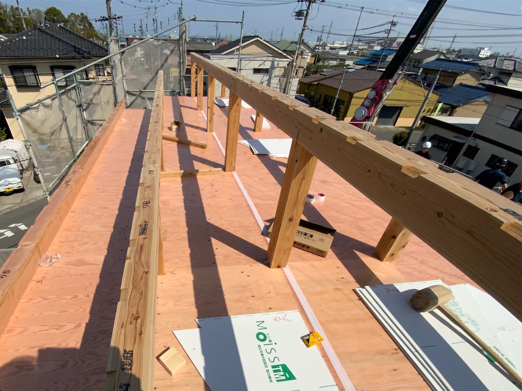 重たい耐力壁となる面材は、一人では張るのが大変💦なので、元気な若手大工さんがいる建て方の際に張られます👍下屋との取り合い部分にも耐力面材を張るので、屋根よりも先に施工しなくてはいけない部分もあります。