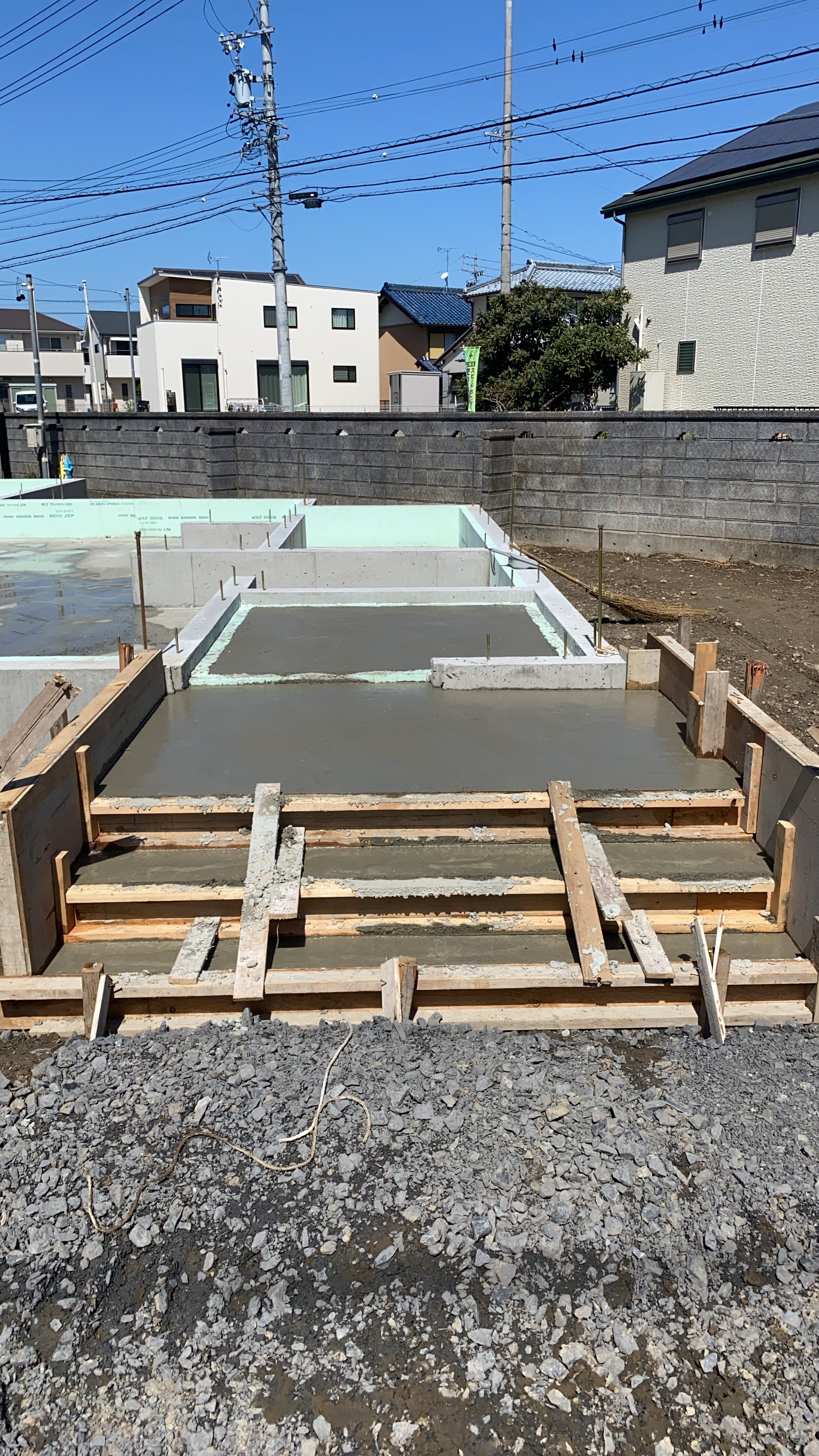 ブログのスタートが少し遅れました。ごめんなさい💦1階26.05 坪、2階12,02坪、平屋に続いて人気のほぼ平屋の家が着工しています。4月初めの上棟に向けて、基礎工事も終盤。順調に進んでいます👍