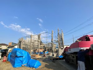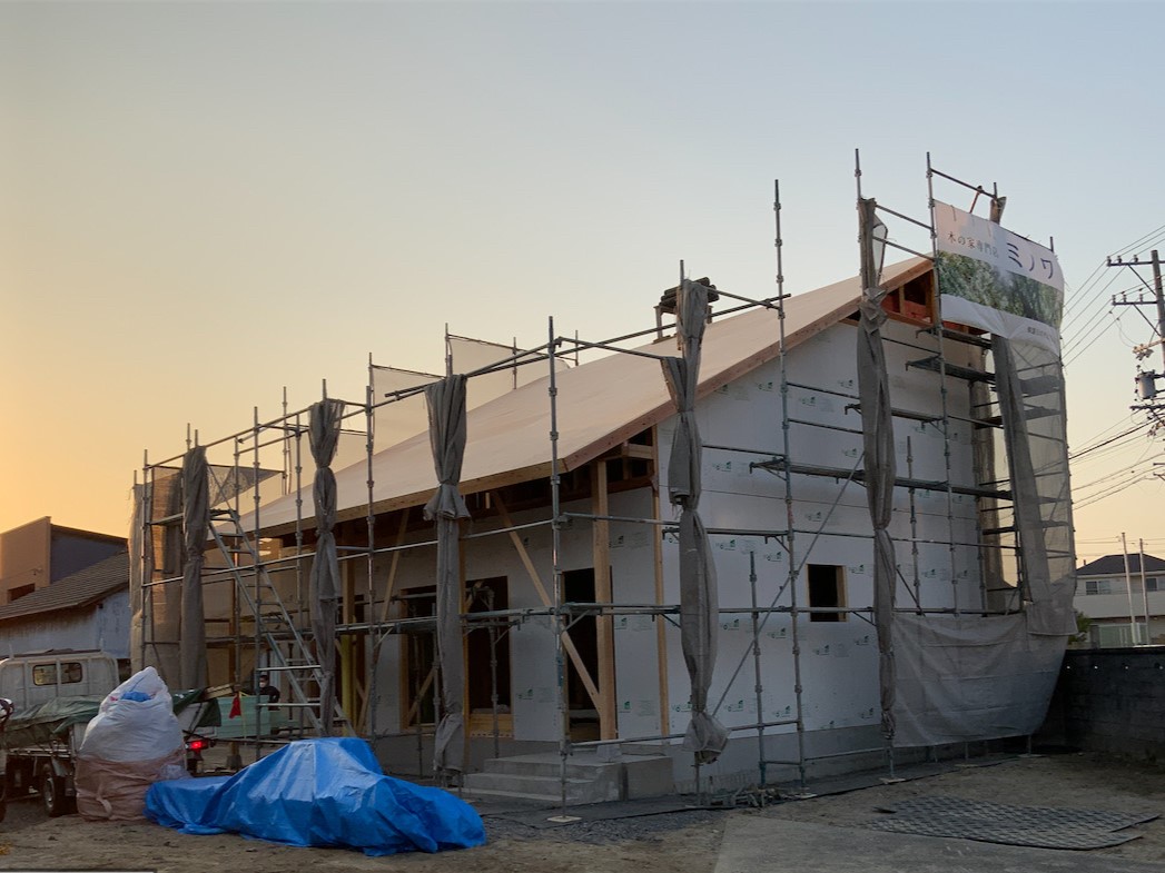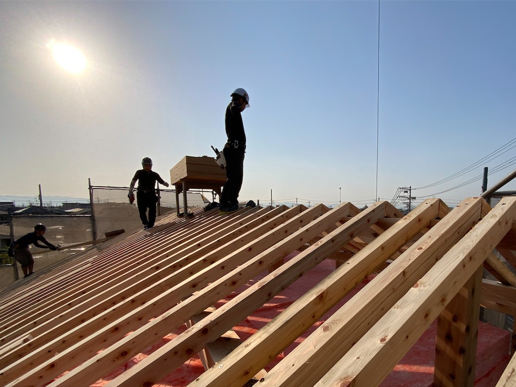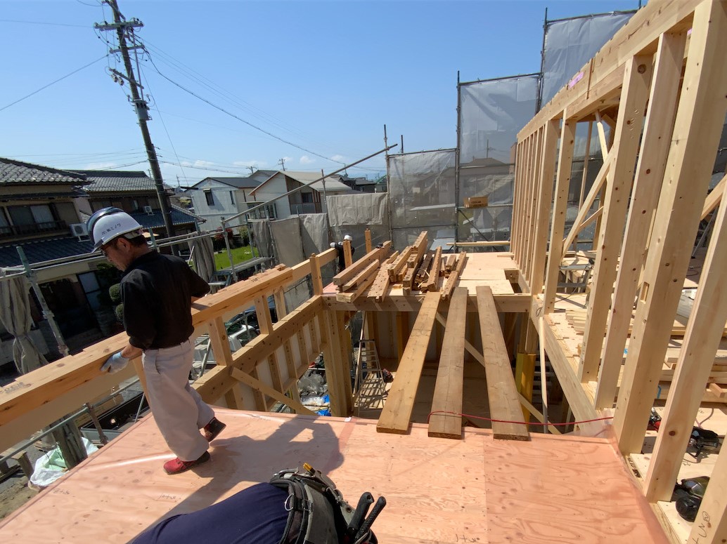 一昨日、上棟(建て方)が行われました。お天気にも恵まれて、快晴👍9名の大工さん達は汗だくになりながらの作業となりました💦この汗をかく作業は大変ですが、血管が丈夫になるそうですよ。水はこまめに飲んでくださいね。