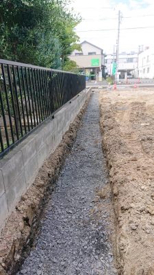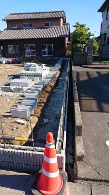 いわゆる先行ブロックと言われる工事ですが、隣地との取り合えい部分にブロックを設ける際、建物が建ってしまうと後から工事しにくい部分を先に行う事で、機械も敷地の奥まで入る事ができ、人力で後からえっちらおっちらとやらなくて済むんです。しかし、i様の敷地は広いので、先行ブロックの工事だけでも大変そうです💦💦