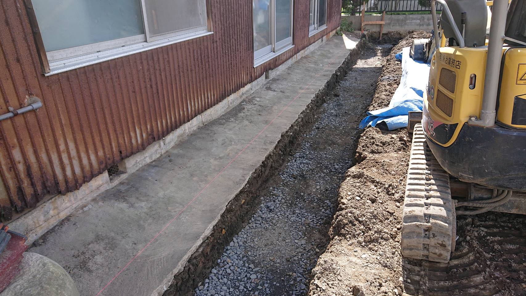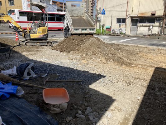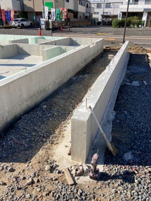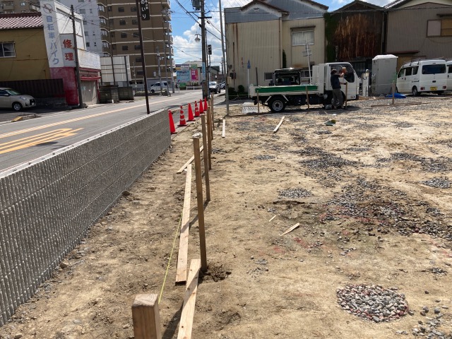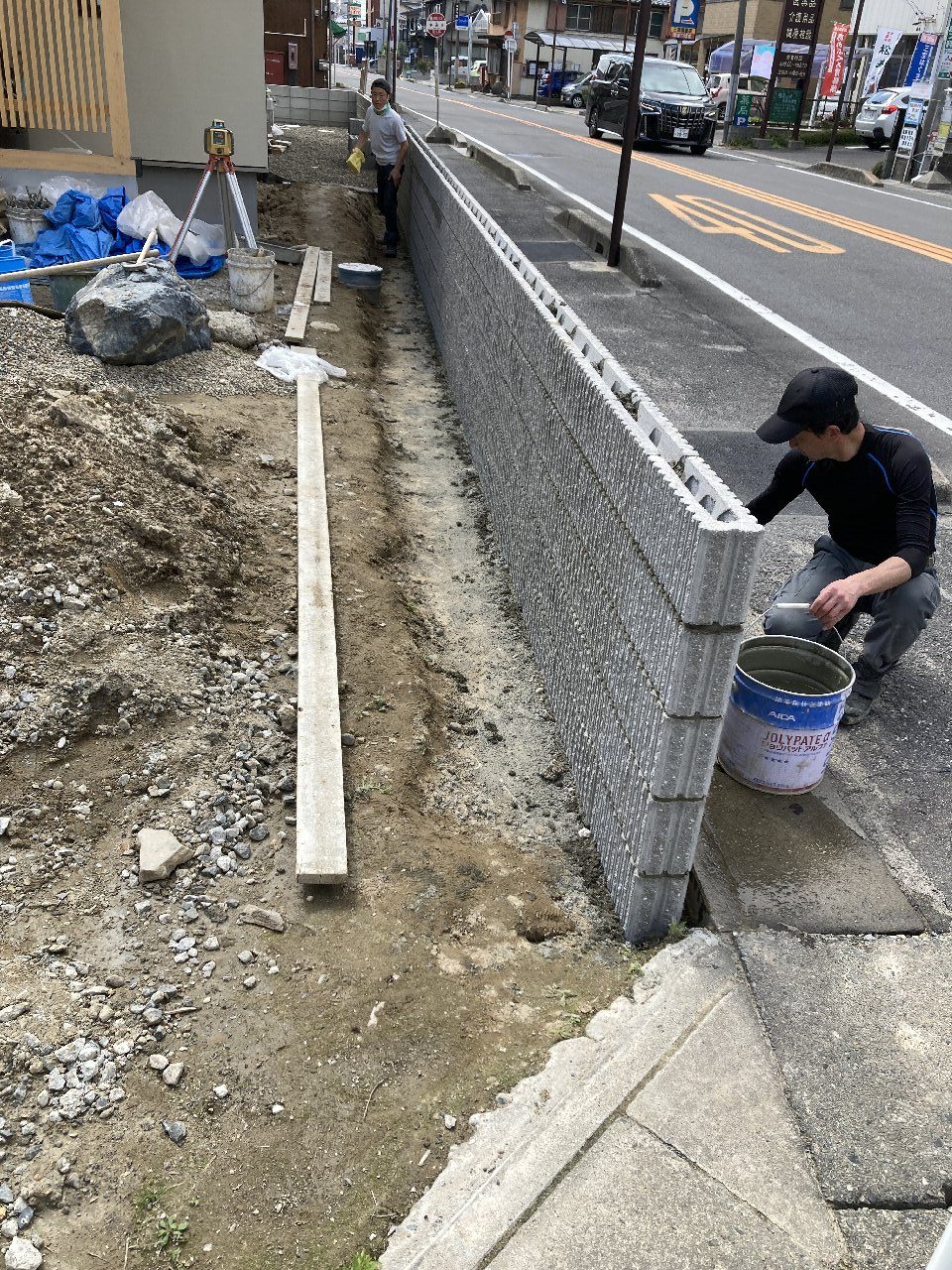 n冶業務店さんが、建物の工事に先駆けて、周りのコンクリートブロック積に取り掛かりました。
